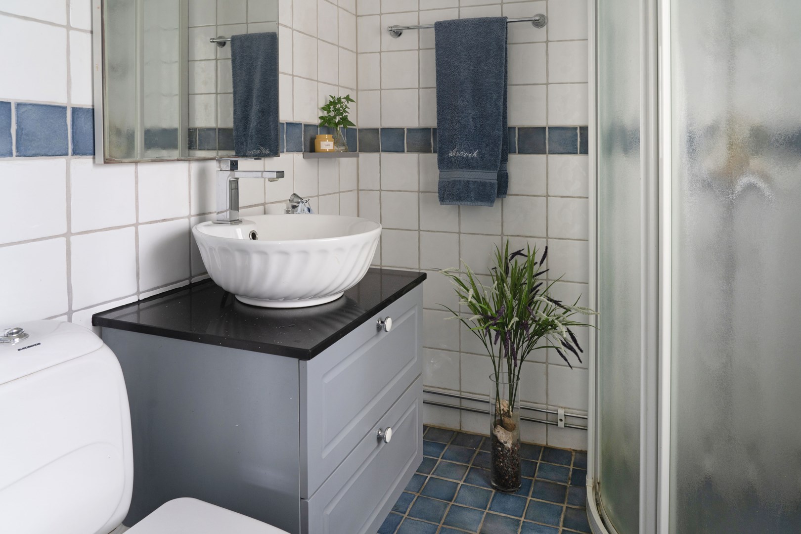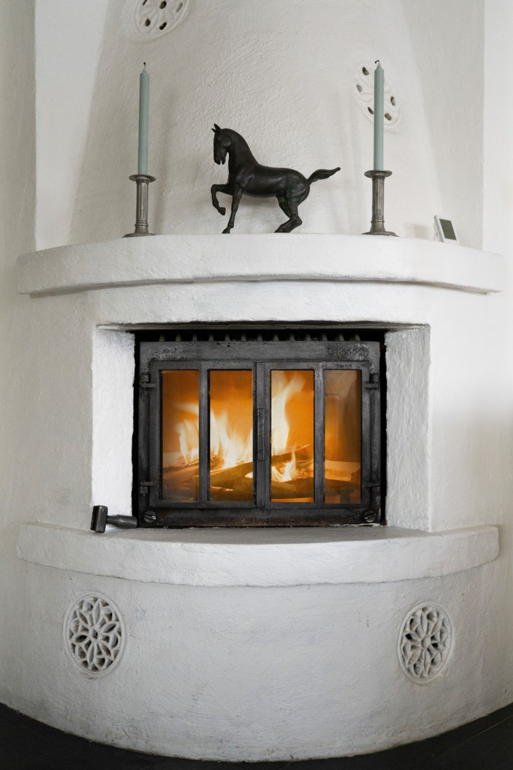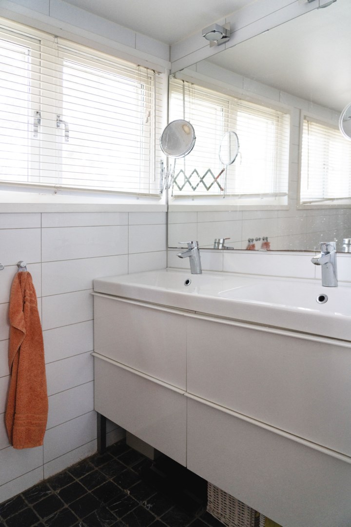 Övre planet rymmer flera sovrum, ett arbetsrum och ytterligare ett badrum med dusch och dubbelhandfat. Den ljusa och luftiga atmosfären förstärks av snedtak, trägolv och klassiska fönster med vackra detaljer.