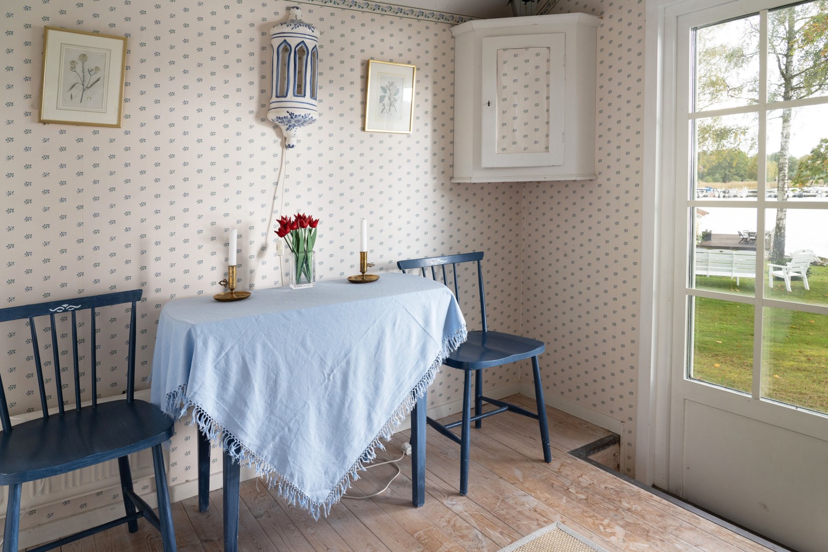 På tomten finns ett charmigt gästhus med ett sovrum, ett mindre kök och matplats, perfekt för familj, vänner eller generationsboende. Gästhuset har en ombonad och tidlös känsla med trägolv, tapeter i klassiskt mönster och stora fönster som släpper in rikligt med ljus, enligt säljarens uppgift om cirka 15 kvm.