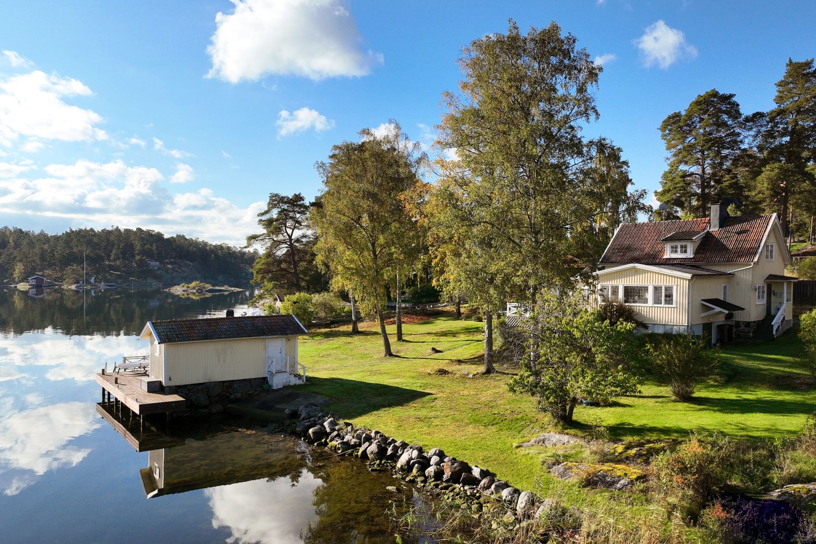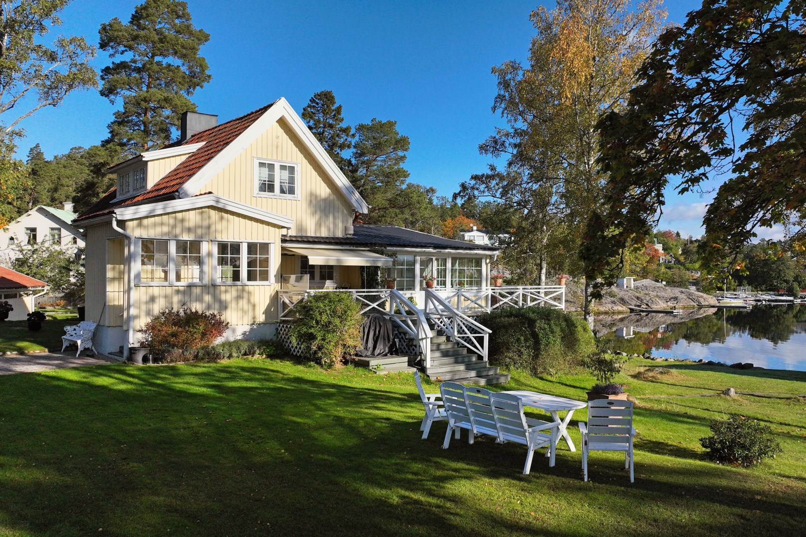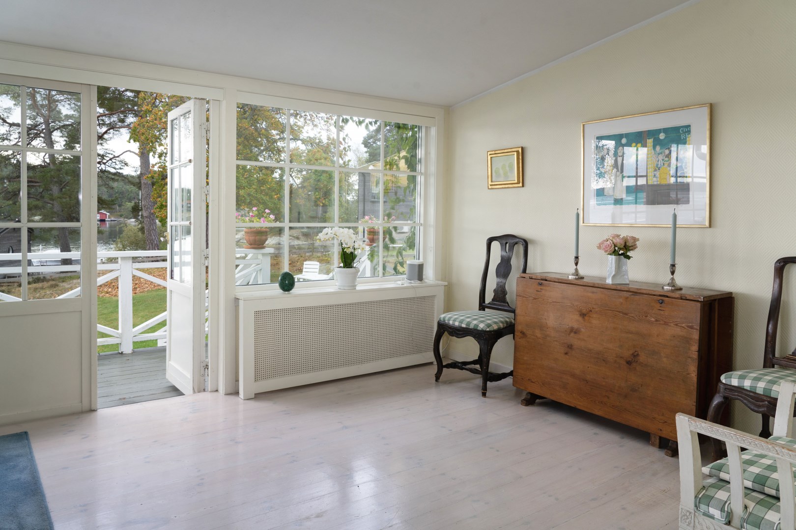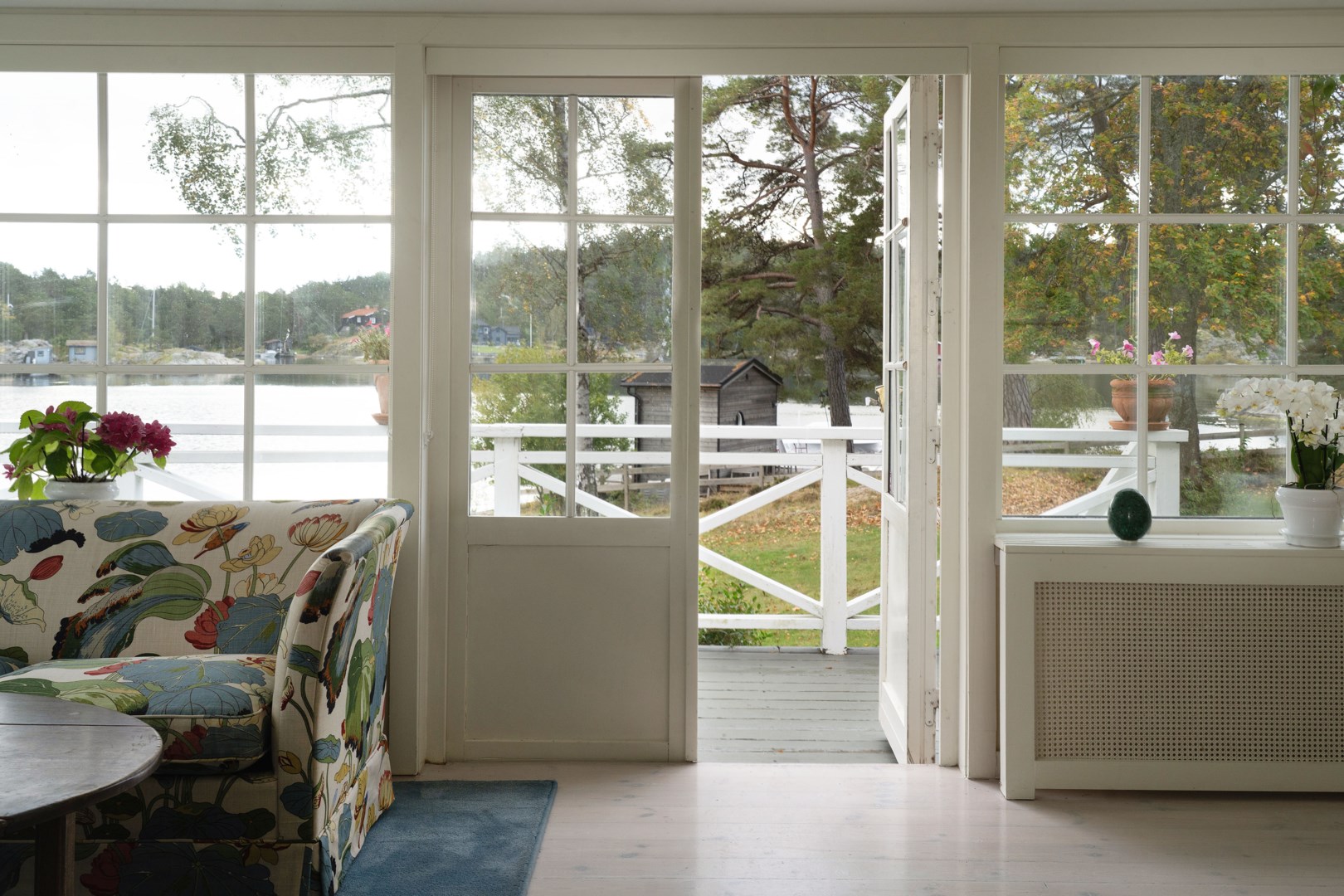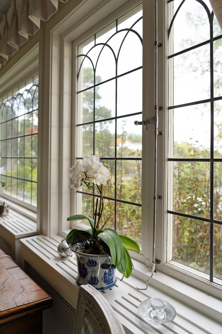 Huvudbyggnaden i klassisk skärgårdsstil andas charm och harmoni. Det stora vardagsrummet präglas av vackra spröjsade fönster, öppen spis och generösa ytor för umgänge. Intill ligger den inglasade verandan, husets hjärta, där ljuset flödar in genom stora fönsterpartier och utsikten över vattnet blir en del av interiören. Här kan man följa årstidernas skiftningar och njuta av solens strålar långt in på dagen.