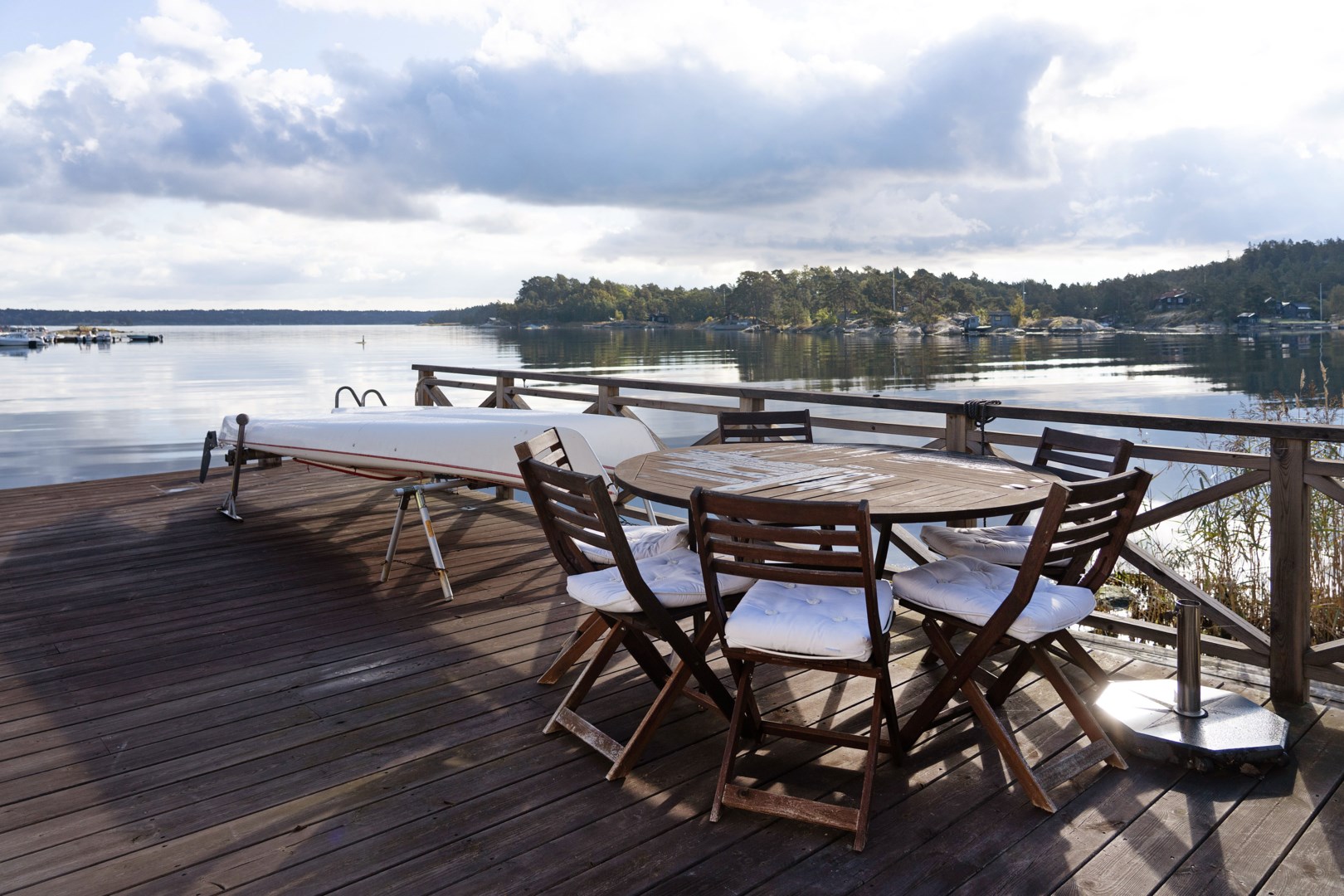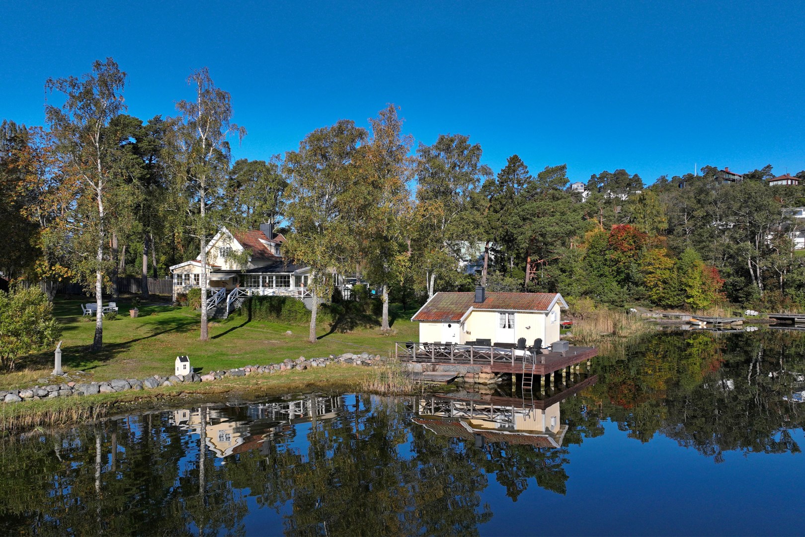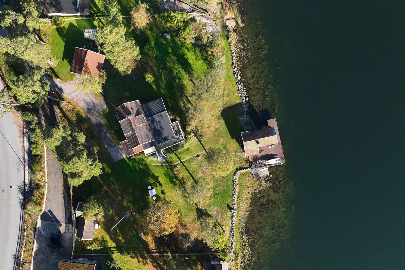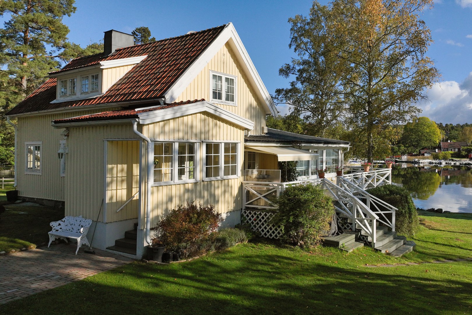 Huvudbyggnaden i klassisk skärgårdsstil andas charm och harmoni. Det stora vardagsrummet präglas av vackra spröjsade fönster, öppen spis och generösa ytor för umgänge. Intill ligger den inglasade verandan, husets hjärta, där ljuset flödar in genom stora fönsterpartier och utsikten över vattnet blir en del av interiören. Här kan man följa årstidernas skiftningar och njuta av solens strålar långt in på dagen.
