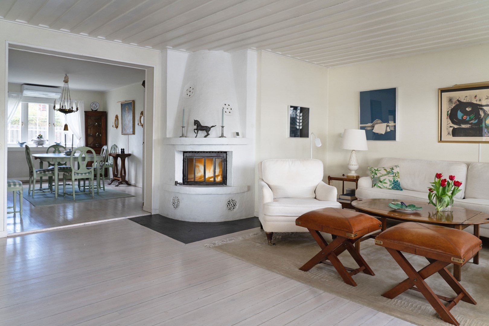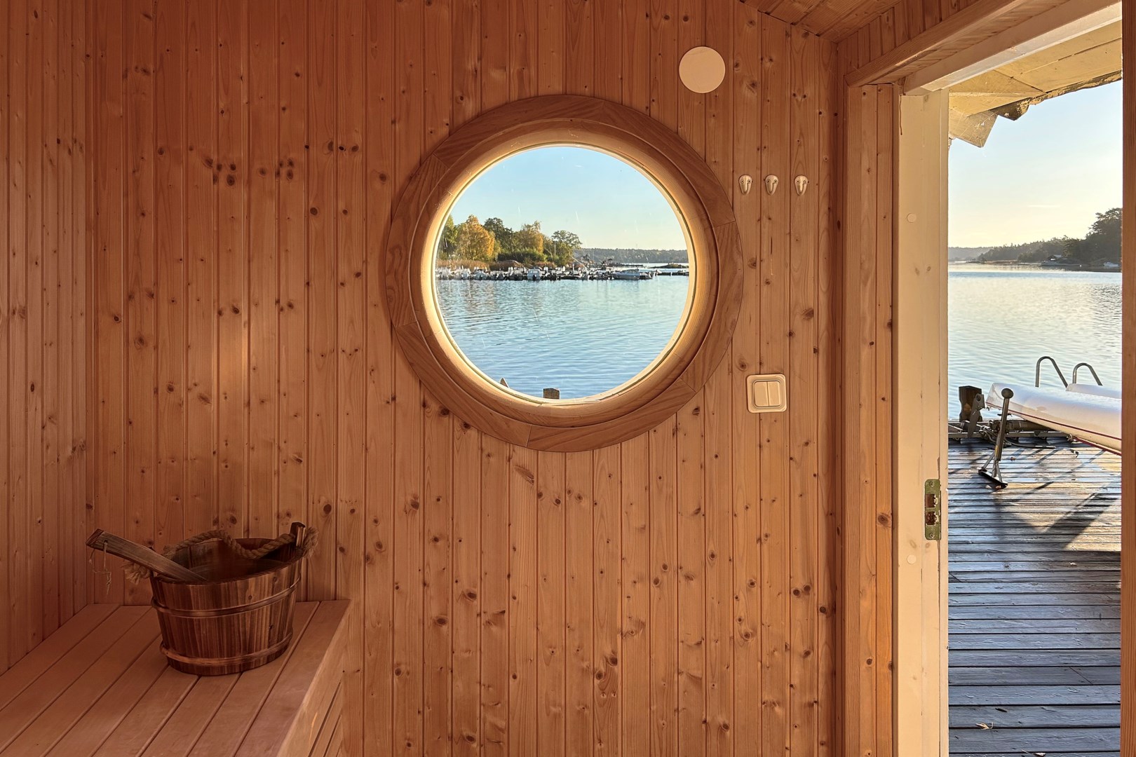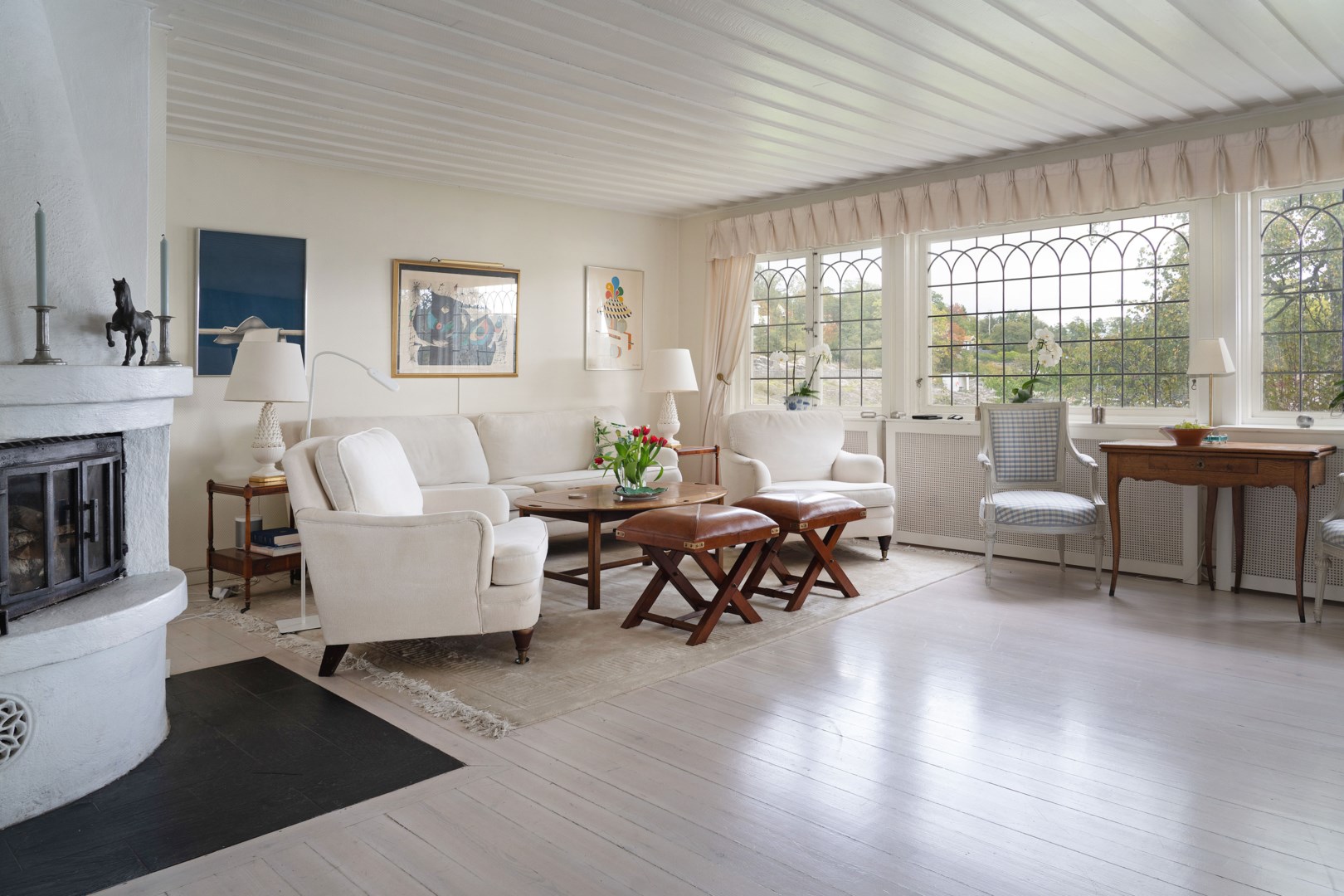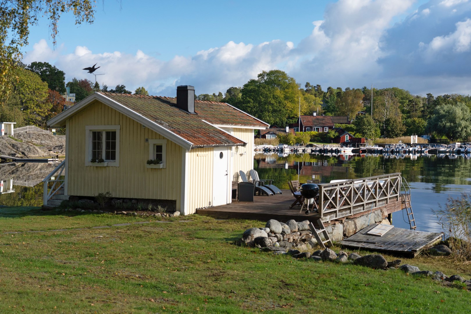 Huvudbyggnaden i klassisk skärgårdsstil andas charm och harmoni. Det stora vardagsrummet präglas av vackra spröjsade fönster, öppen spis och generösa ytor för umgänge. Intill ligger den inglasade verandan, husets hjärta, där ljuset flödar in genom stora fönsterpartier och utsikten över vattnet blir en del av interiören. Här kan man följa årstidernas skiftningar och njuta av solens strålar långt in på dagen.