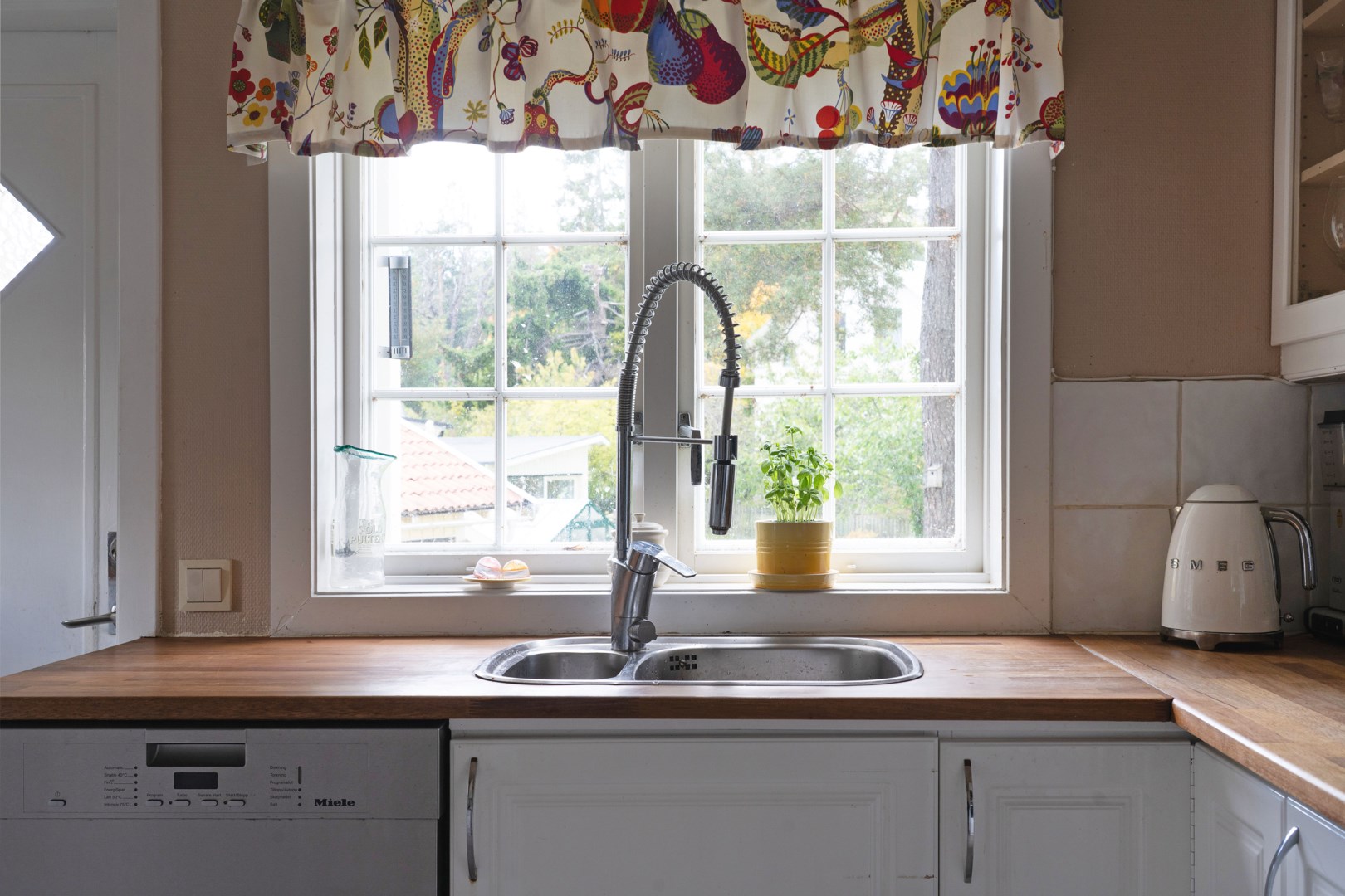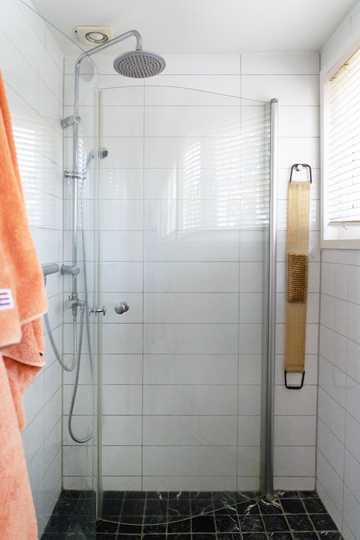 Köket är trivsamt och funktionellt med ljusa snickerier, fina arbetsytor och fönster mot trädgården. Intill finns en ljus matsal med plats för större middagar. På entréplanet finns även ett helkaklat badrum med dusch, praktiskt placerat nära altanen för den som kommer direkt upp från ett dopp i viken.