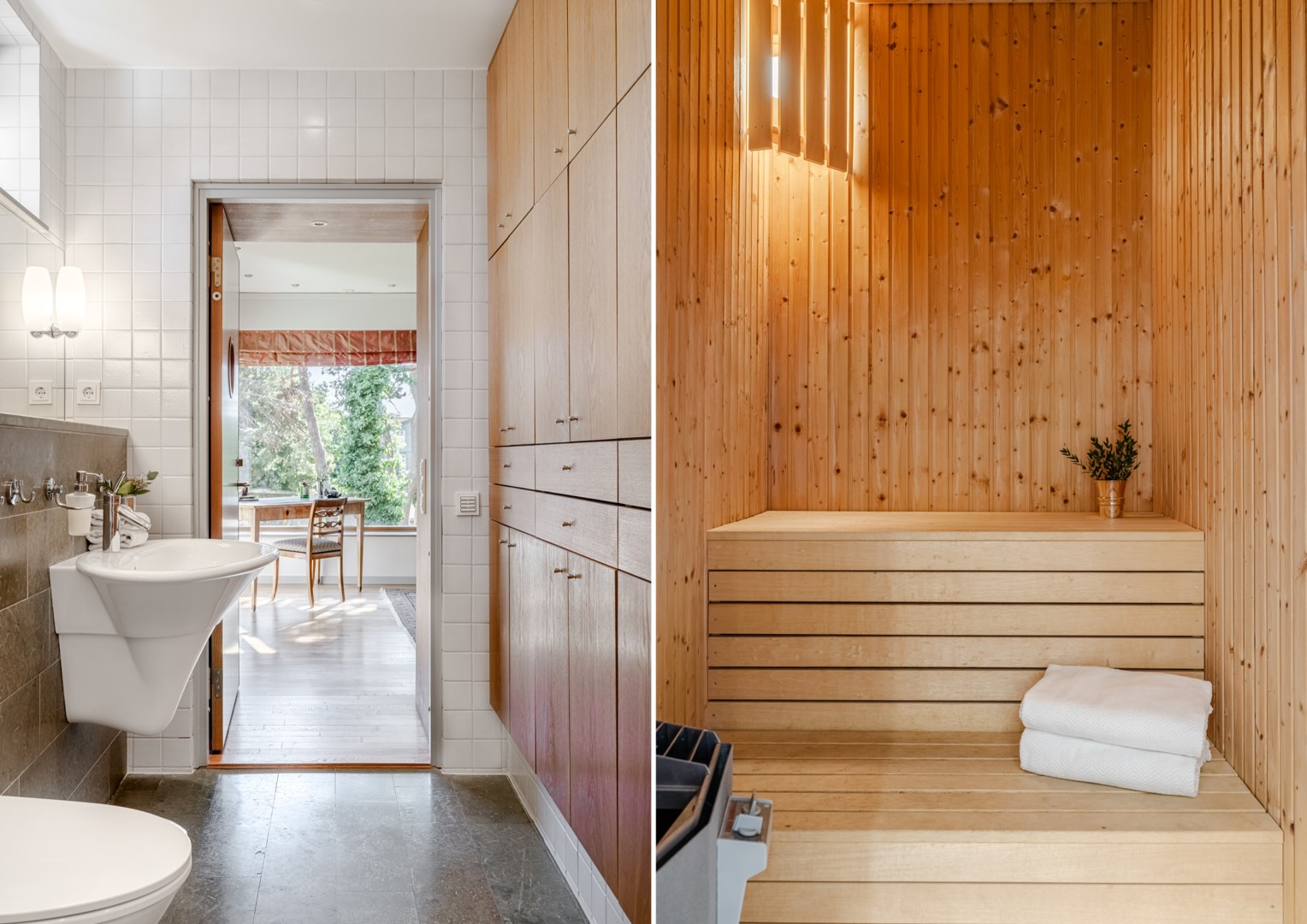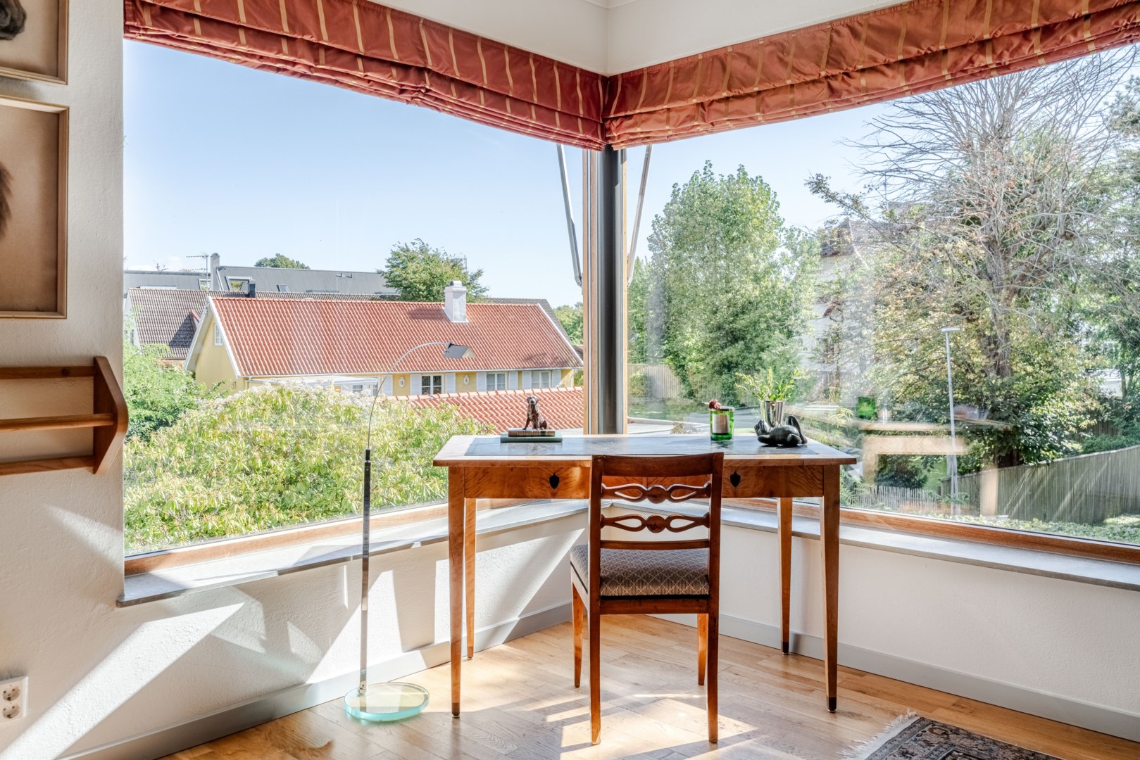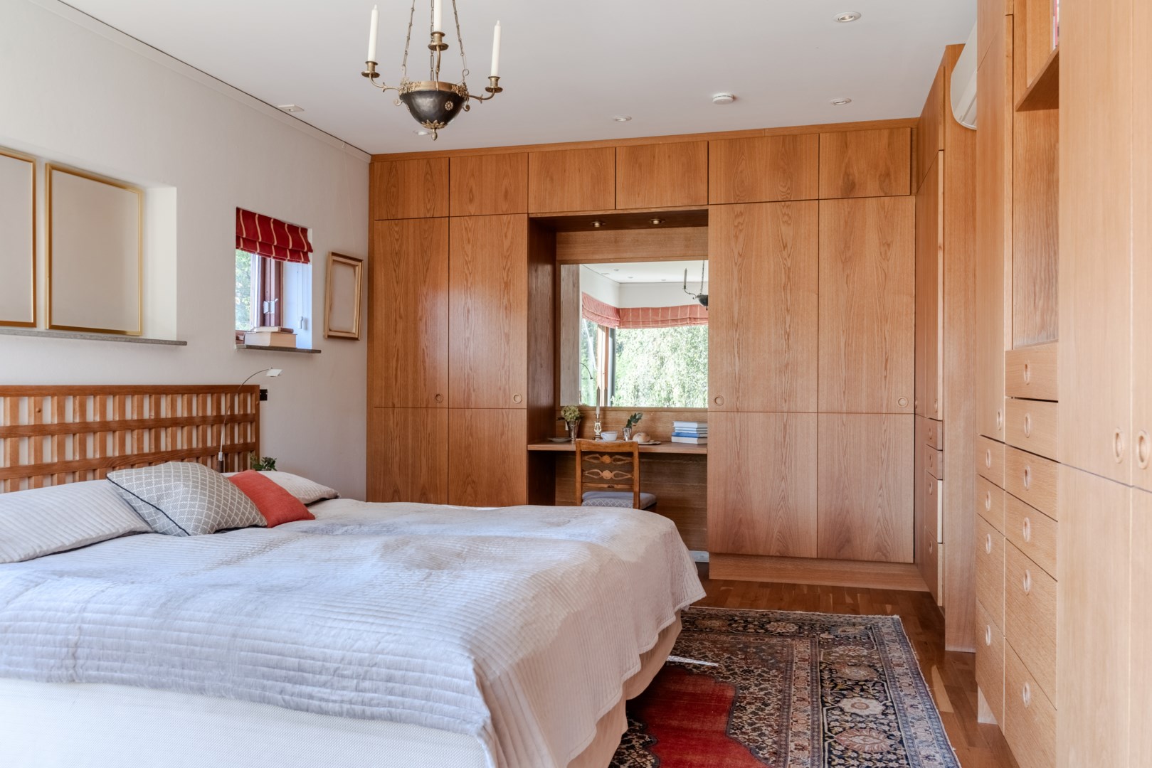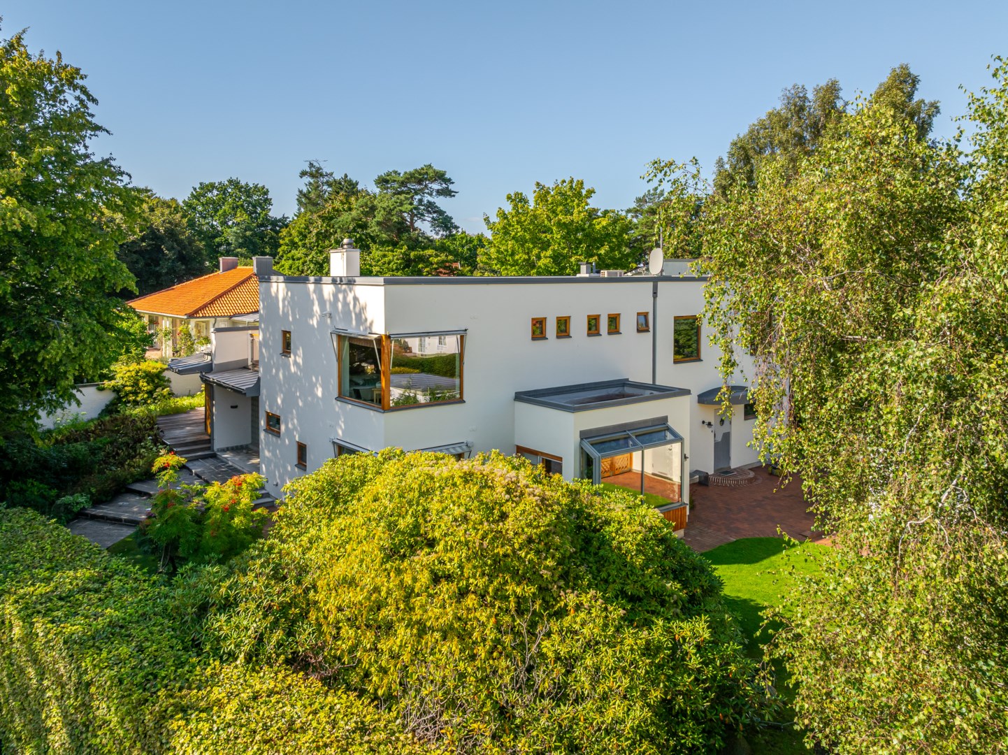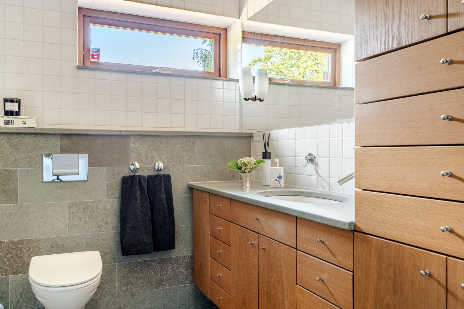 Sovrummen har samma arkitektoniska konsekvens som resten av huset: fasta fönsteromfattningar i trä, infälld belysning, noggrant avvägda proportioner. Det är en interiör där det fasta och det föränderliga samspelar i full balans. Master bedroom är kanske husets mest poetiska rum – med skrivbord i ett glasat hörn där man nästan svävar över trädtopparna och ett platsbyggt tidlöst sminkbord som för tankarna till en femstjärnig hotellsvit. Som om det spa-liknande ensuite badrummet intill inte vore nog, så finns även en generös social takterrass utanför som får konstmuseet Louisiana i Danmark att blekna i arkitektonisk skönhet.