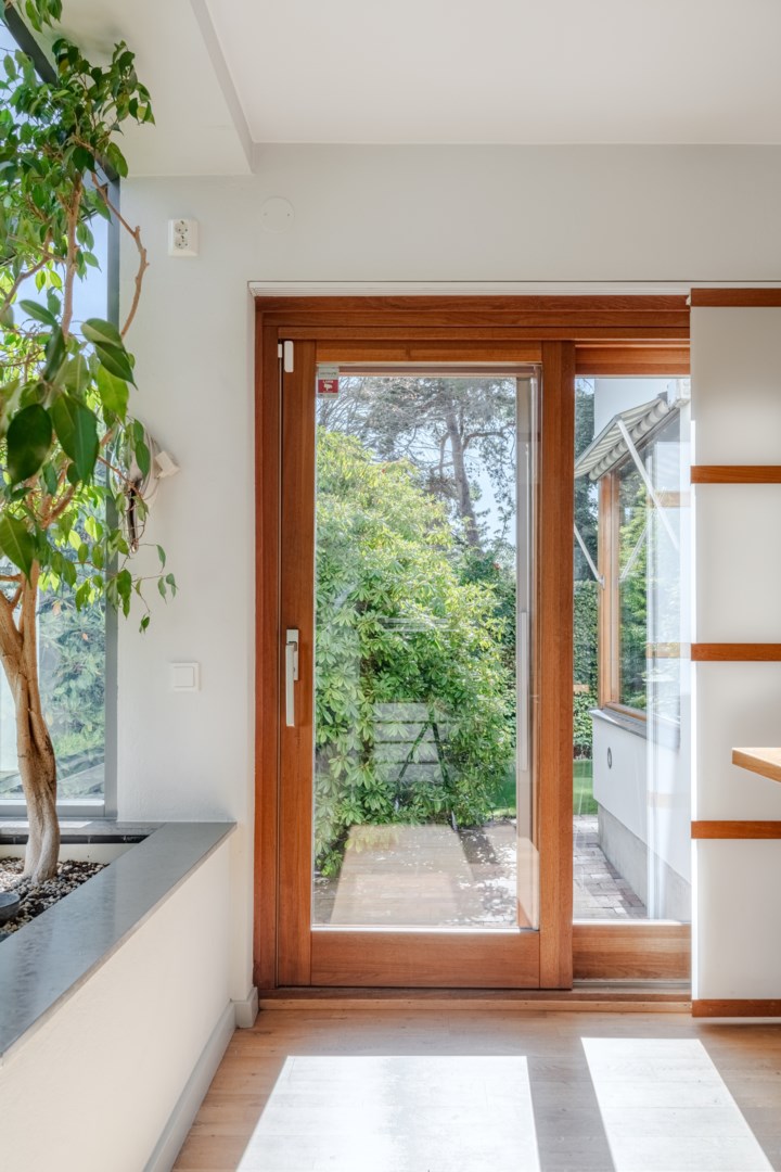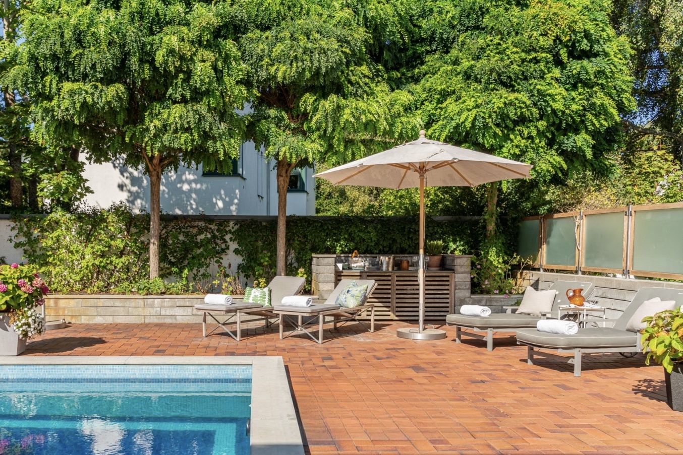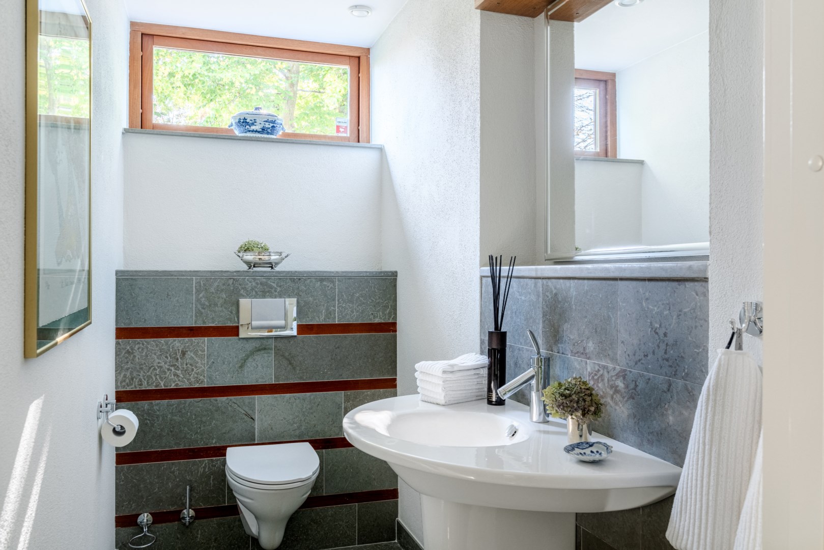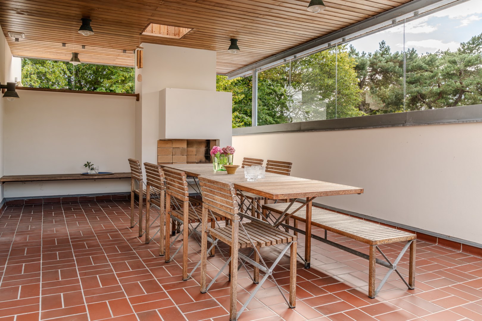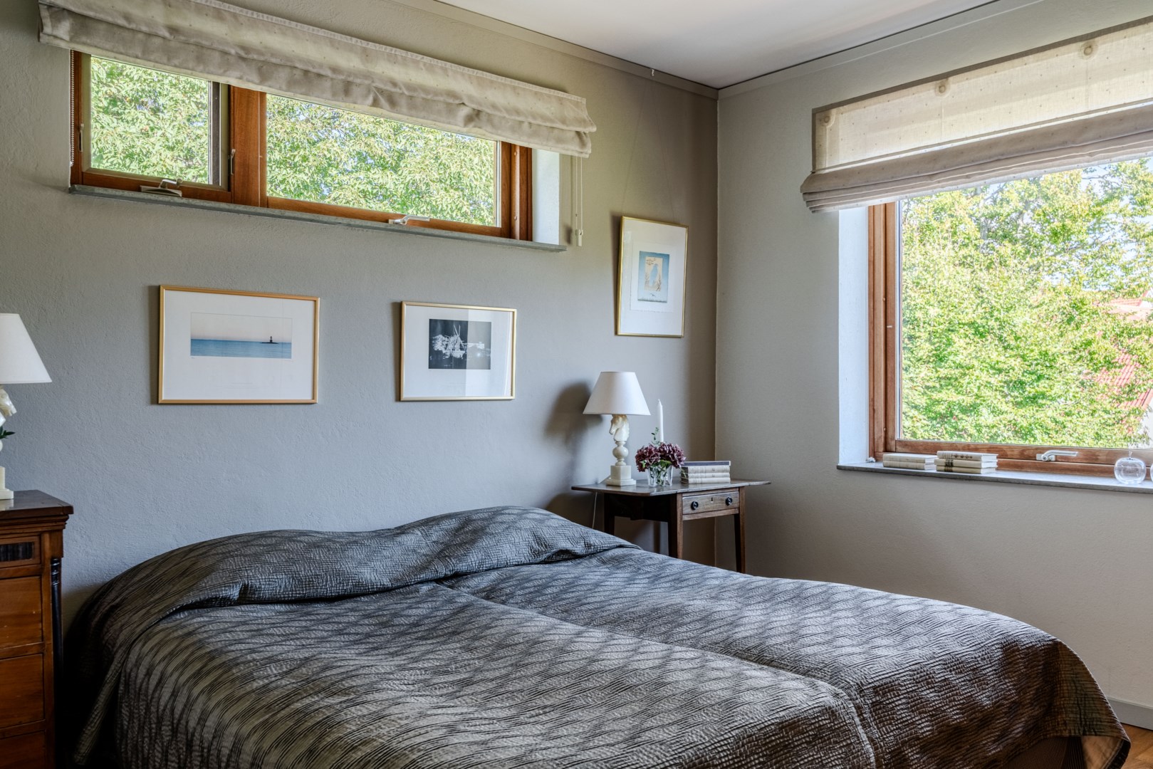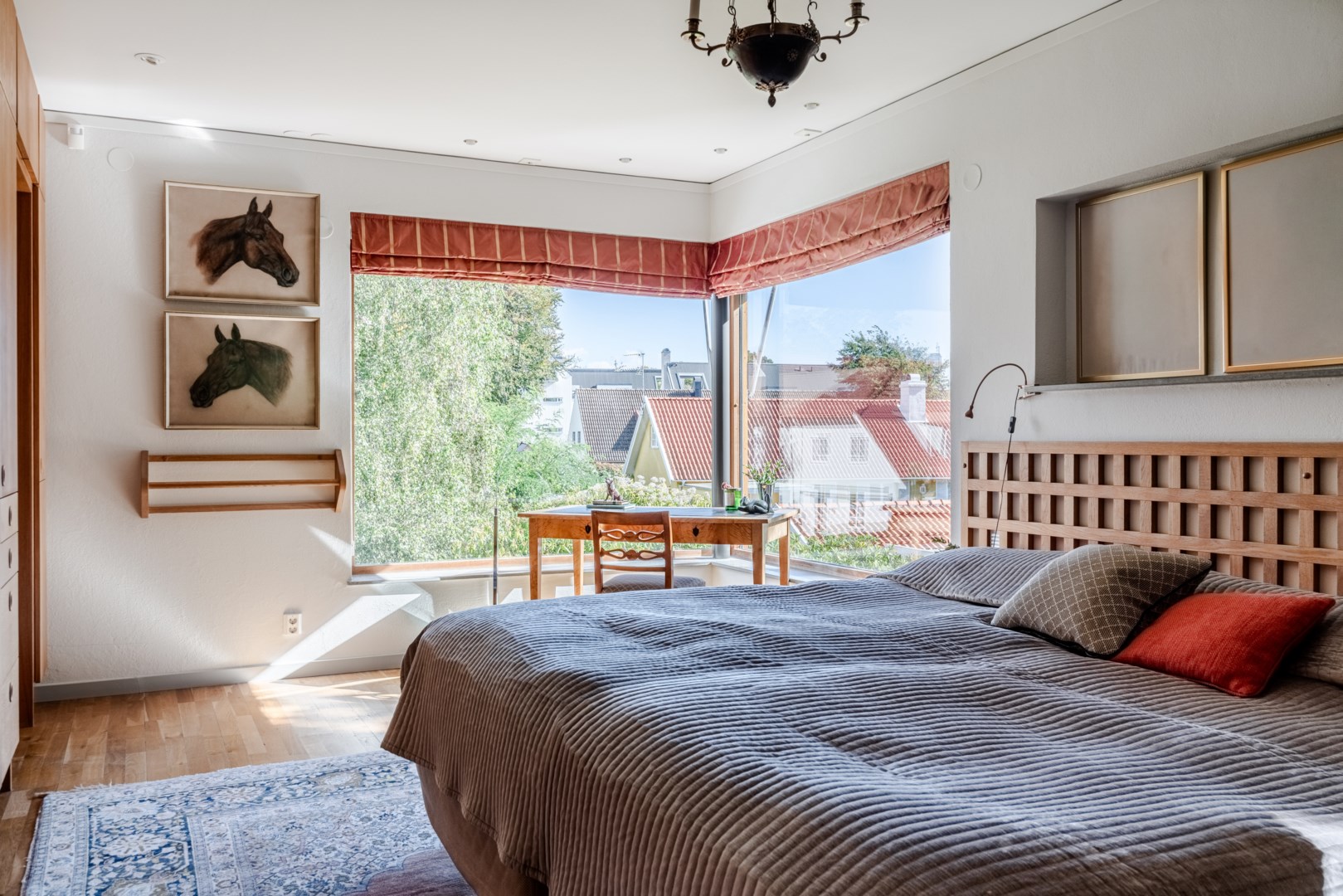 Sovrummen har samma arkitektoniska konsekvens som resten av huset: fasta fönsteromfattningar i trä, infälld belysning, noggrant avvägda proportioner. Det är en interiör där det fasta och det föränderliga samspelar i full balans. Master bedroom är kanske husets mest poetiska rum – med skrivbord i ett glasat hörn där man nästan svävar över trädtopparna och ett platsbyggt tidlöst sminkbord som för tankarna till en femstjärnig hotellsvit. Som om det spa-liknande ensuite badrummet intill inte vore nog, så finns även en generös social takterrass utanför som får konstmuseet Louisiana i Danmark att blekna i arkitektonisk skönhet.
