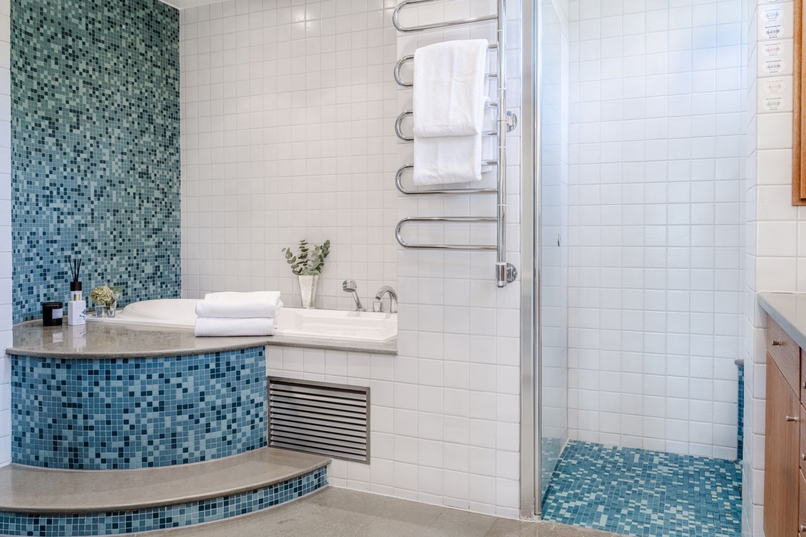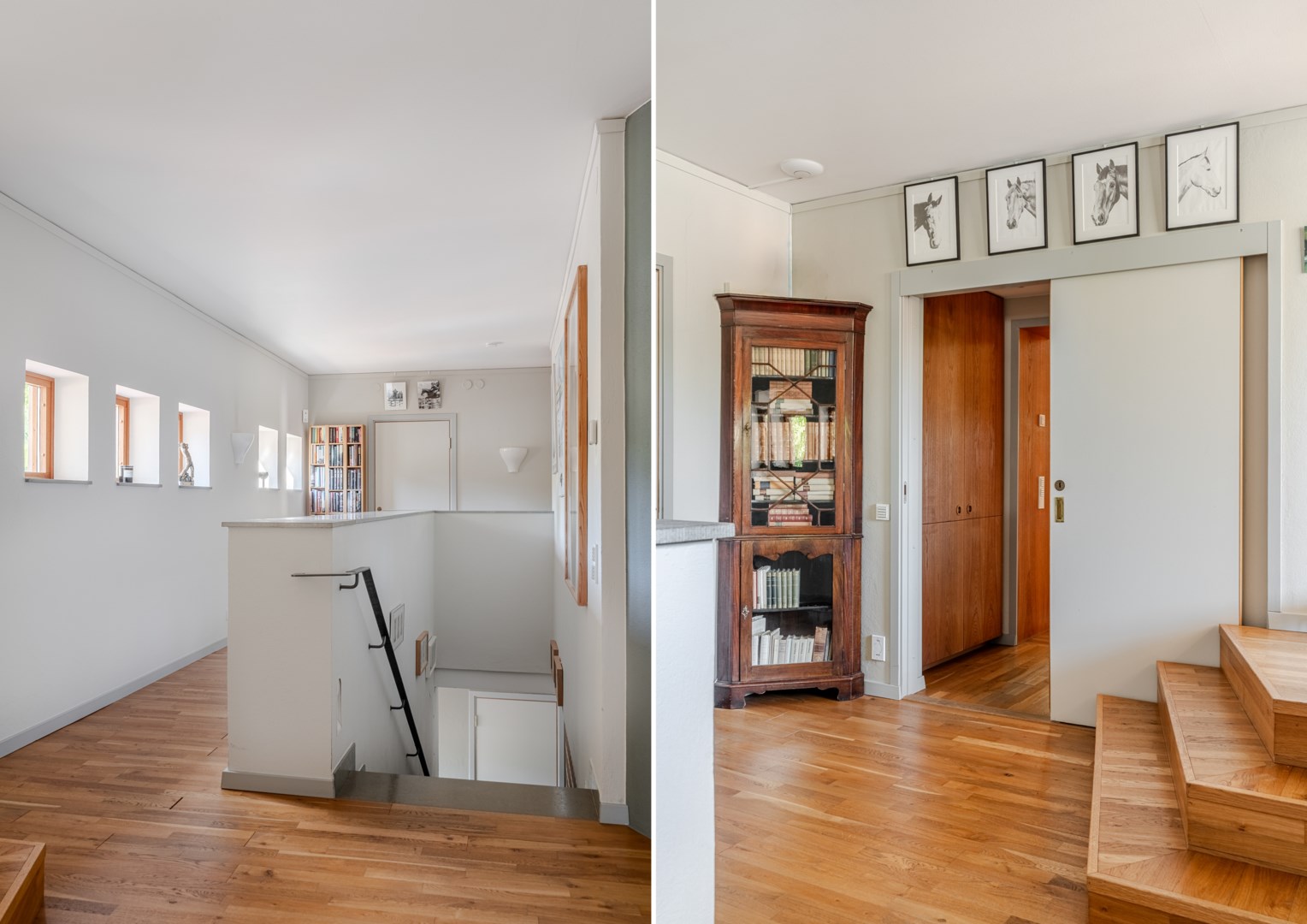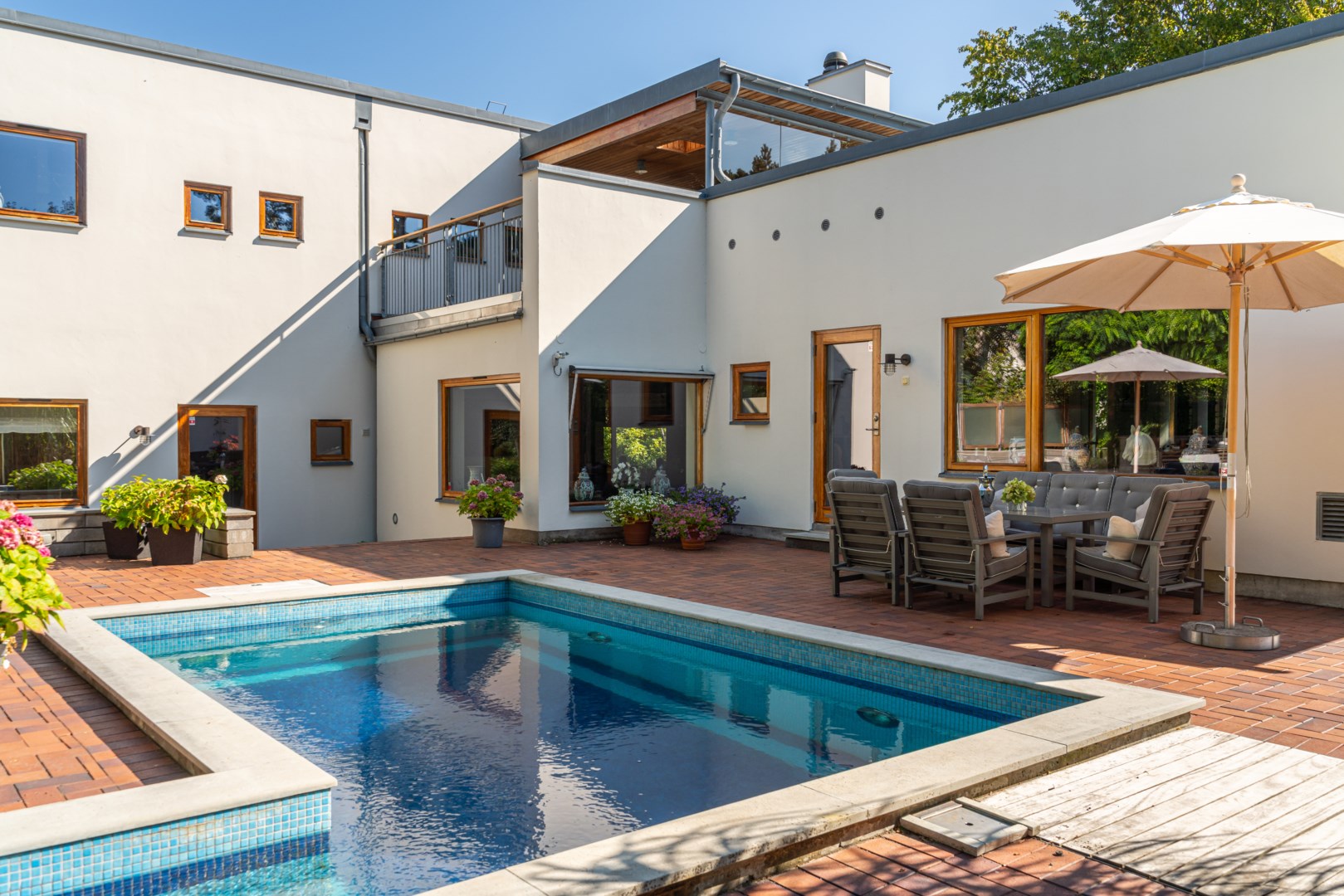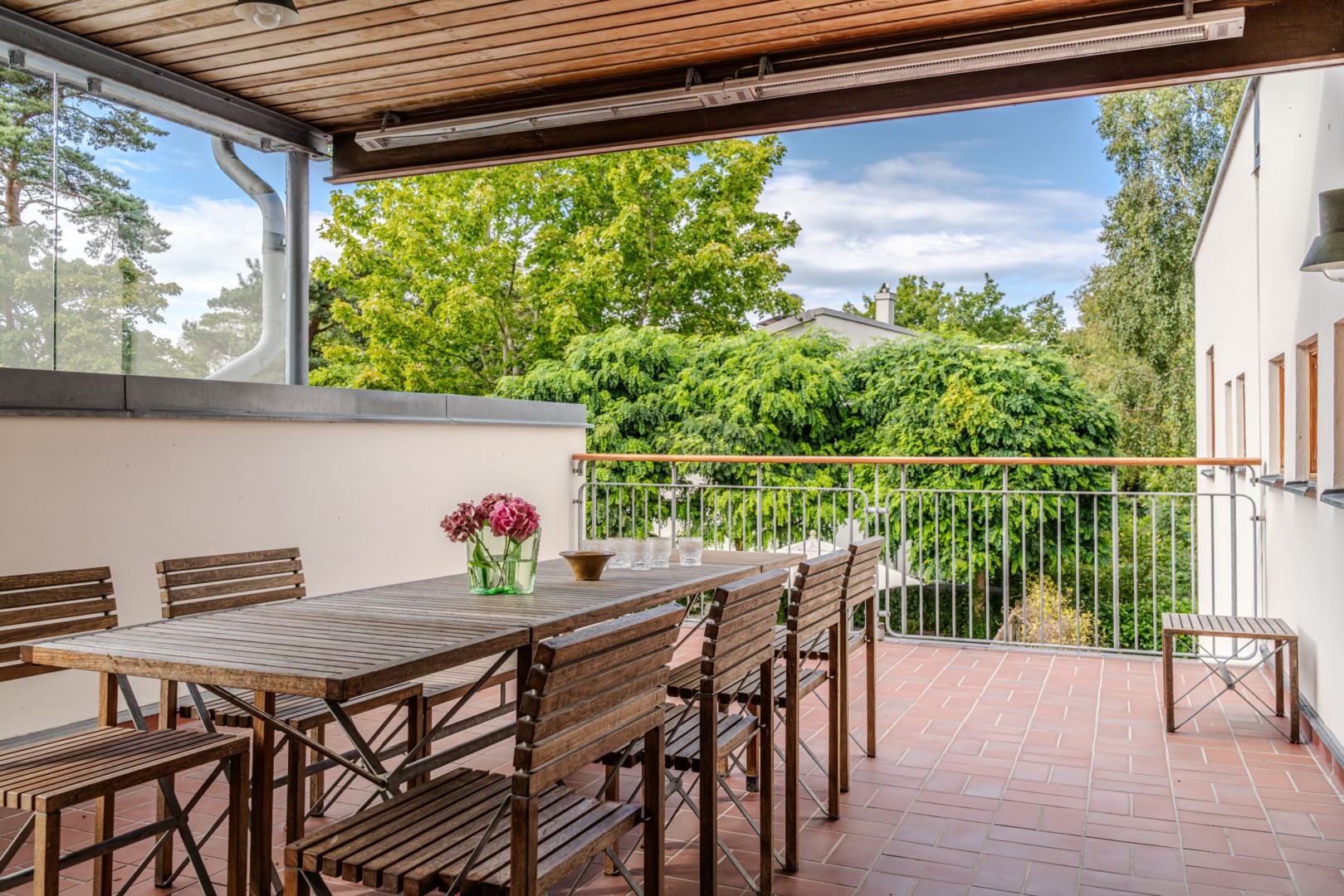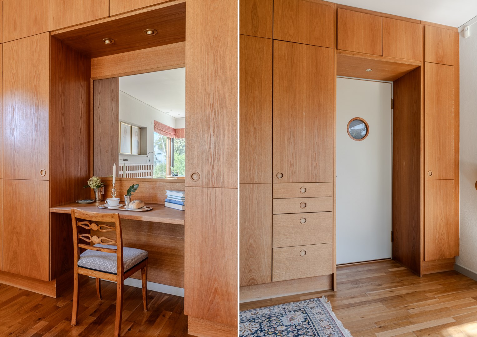 Sovrummen har samma arkitektoniska konsekvens som resten av huset: fasta fönsteromfattningar i trä, infälld belysning, noggrant avvägda proportioner. Det är en interiör där det fasta och det föränderliga samspelar i full balans. Master bedroom är kanske husets mest poetiska rum – med skrivbord i ett glasat hörn där man nästan svävar över trädtopparna och ett platsbyggt tidlöst sminkbord som för tankarna till en femstjärnig hotellsvit. Som om det spa-liknande ensuite badrummet intill inte vore nog, så finns även en generös social takterrass utanför som får konstmuseet Louisiana i Danmark att blekna i arkitektonisk skönhet.