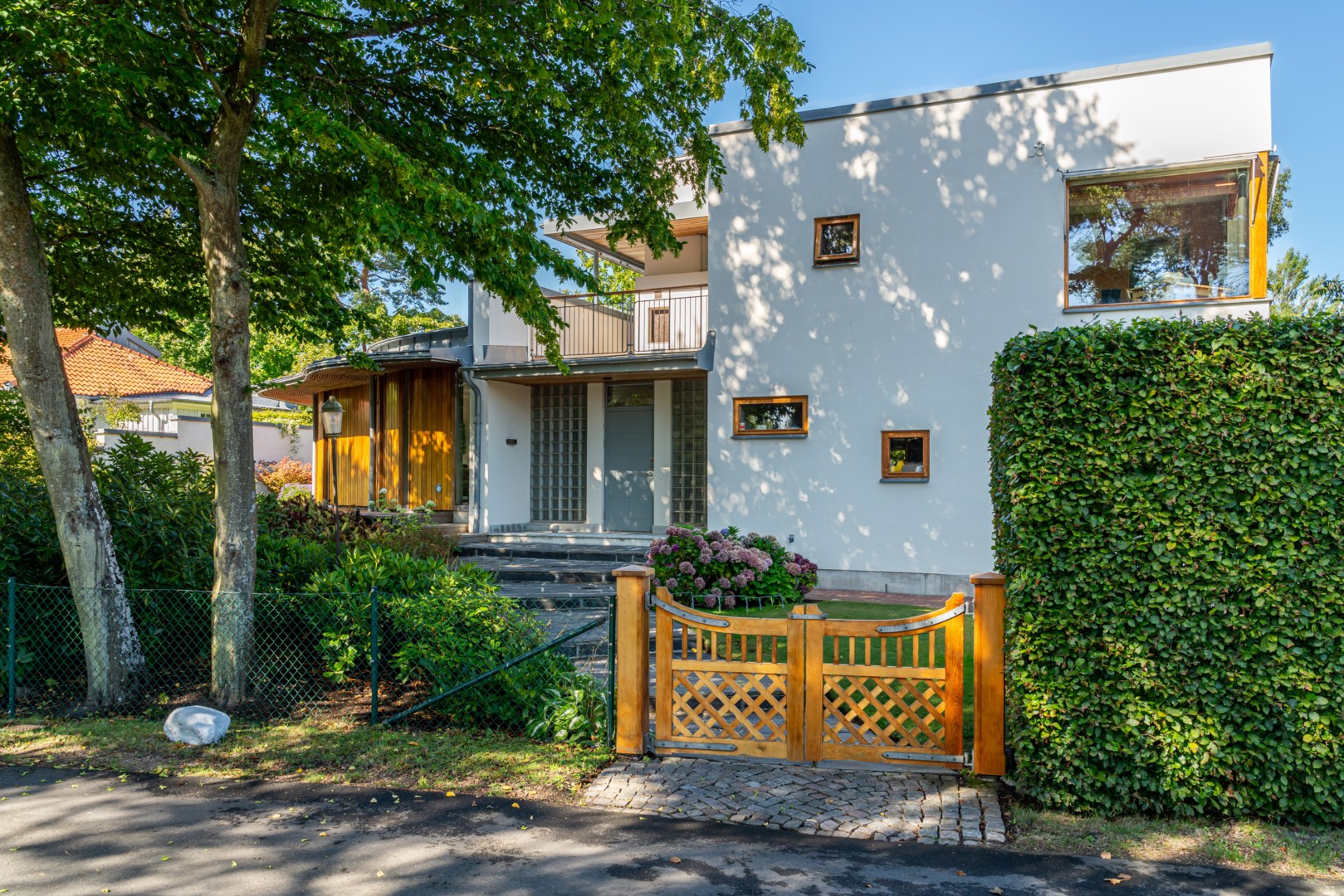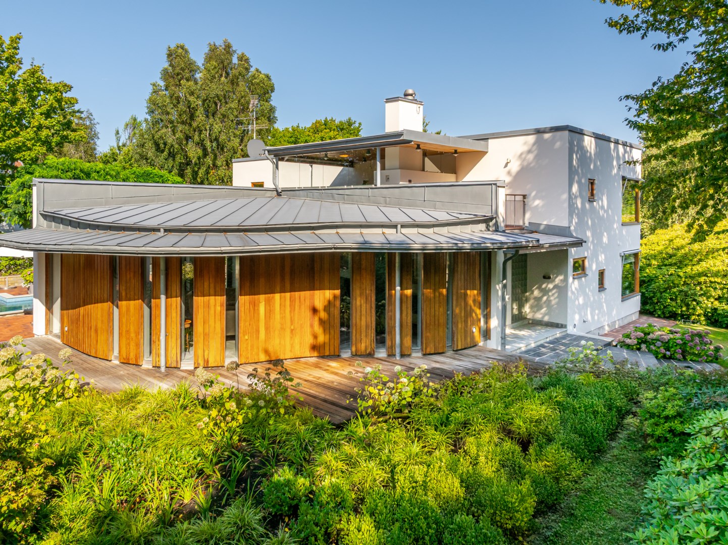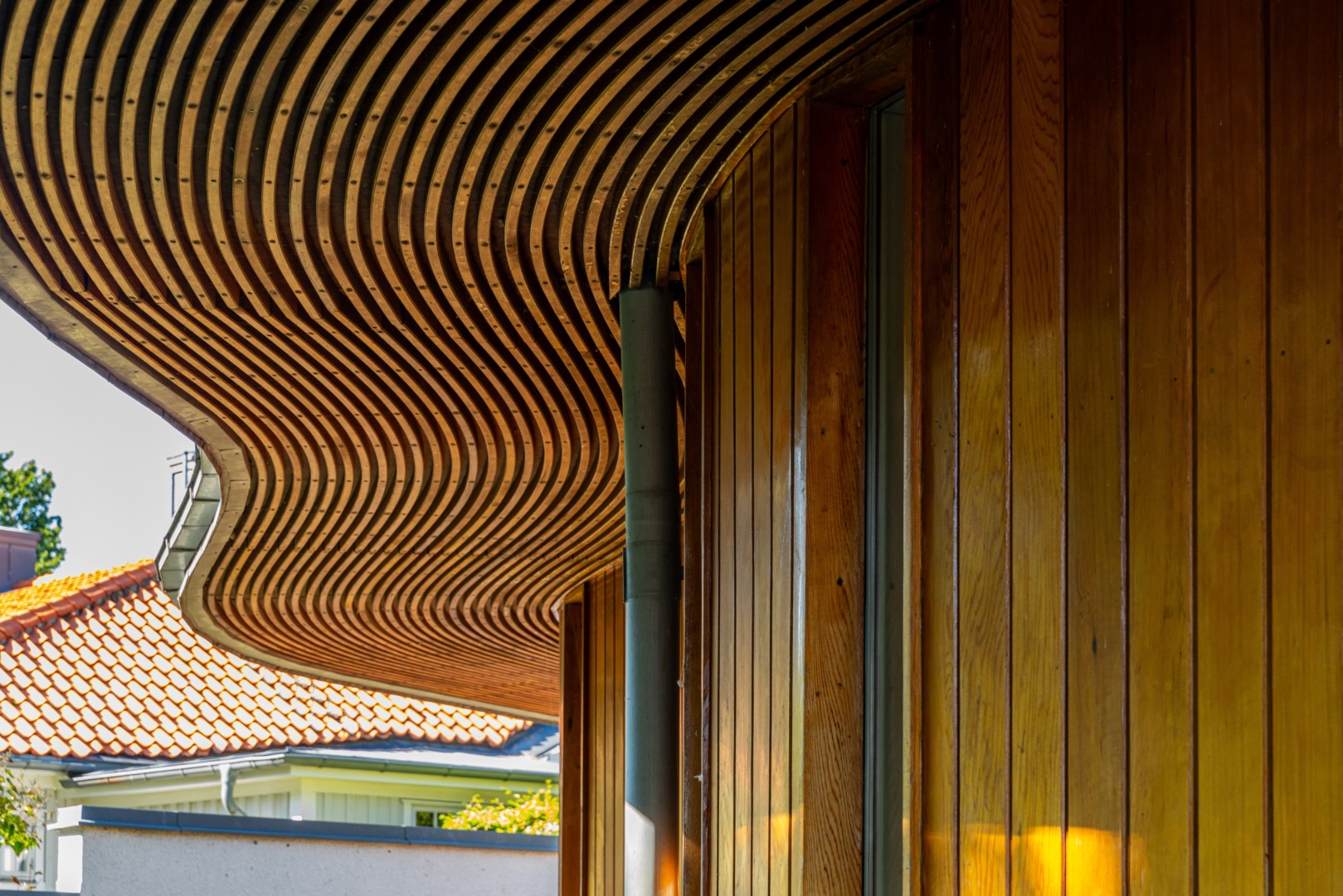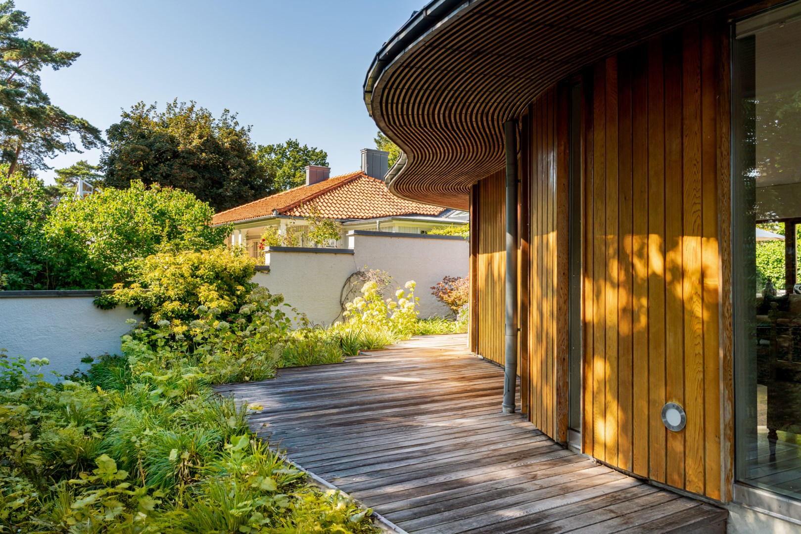 Husets mest framträdande drag är den böljande, vågformade fasaden som löper längs trädgårdens sydvästra sida. Den rör sig med landskapet, lika organisk som grönskan intill och bjuder samtidigt in till rörelse – en promenad längs husets böljande linje. Kombinationen av vitputsade kubiska volymer och varma, vertikalt lagda träpaneler i rundade former skapar en harmonisk kontrast mellan stram geometri och naturens mjukhet. Taklandskapet består av plåtbearbetade volymer i zinkgrå ton, med precisa avslut och integrerade hängrännor – en detaljrikedom som visar på en noggrant genomförd arkitektur. Glaspartierna är djupt infällda i träomfattningar, vilket både ger visuell tyngd och för tankarna till Aaltos karakteristiska fönsterdetaljer.