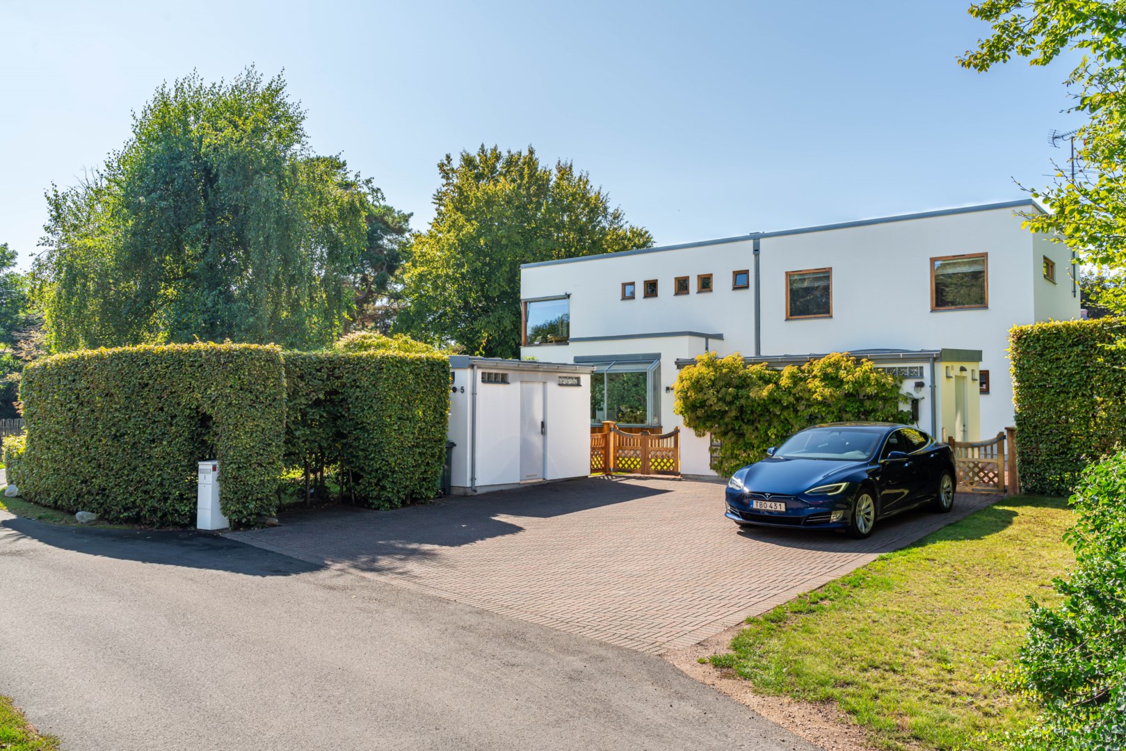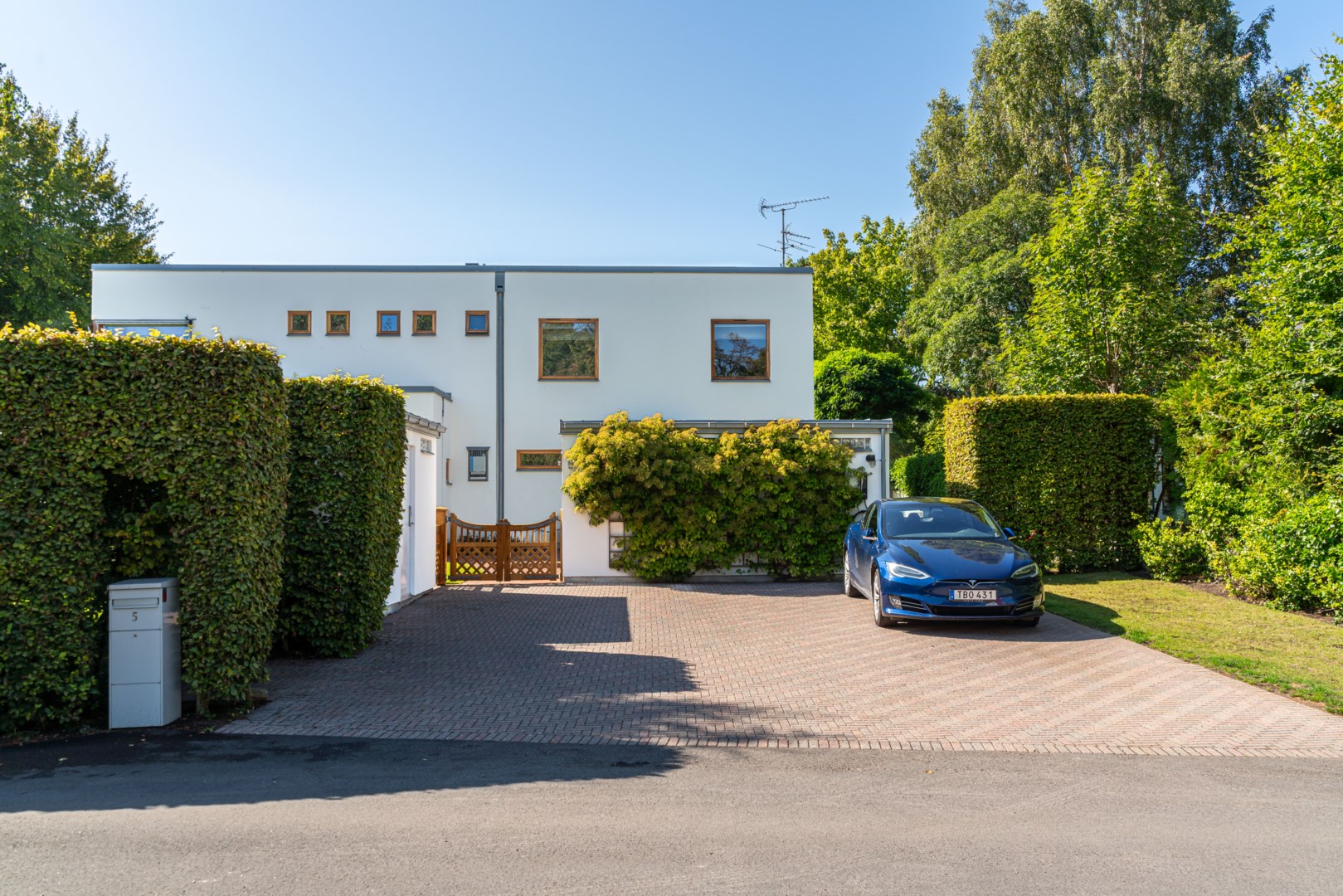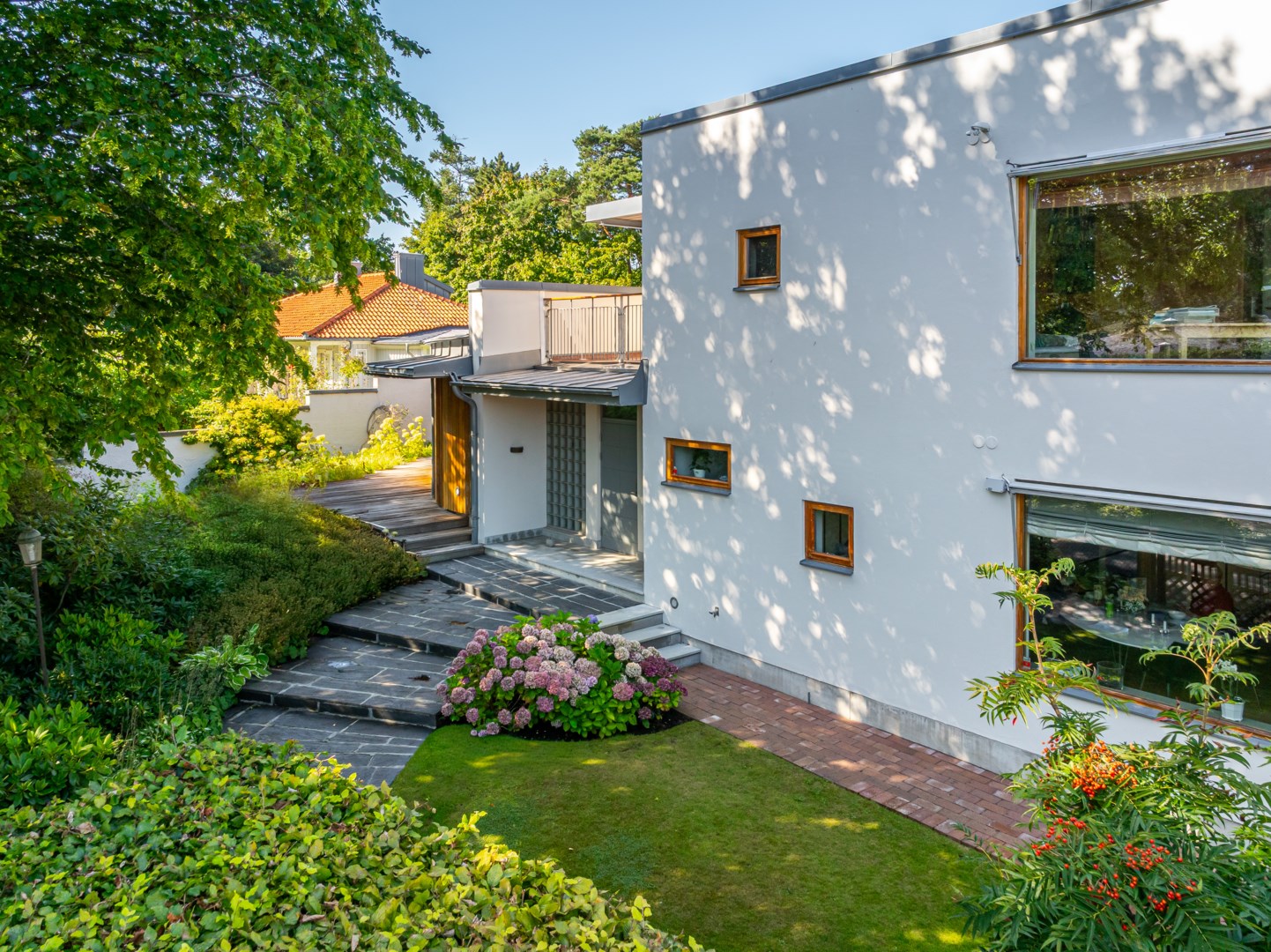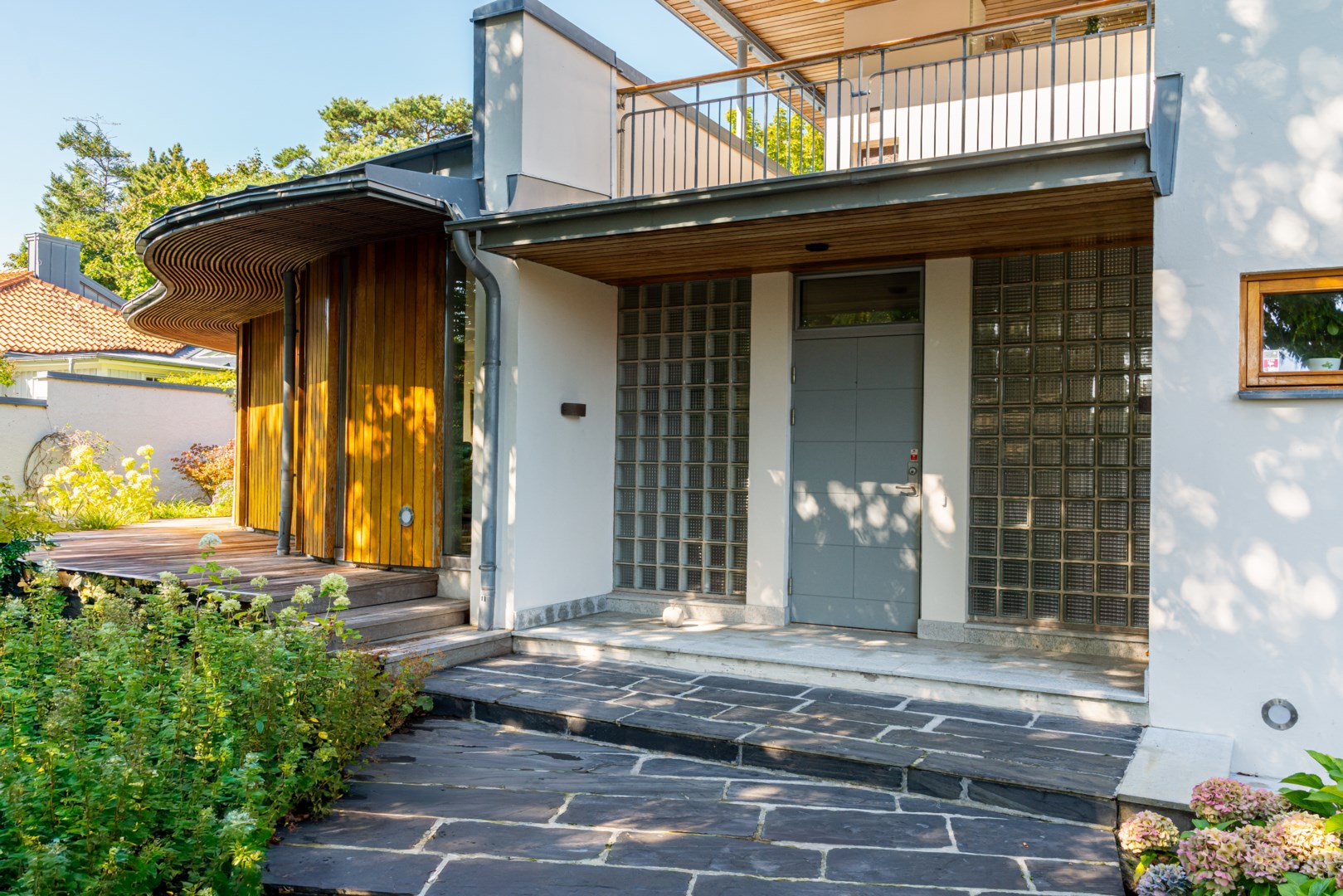 Husets mest framträdande drag är den böljande, vågformade fasaden som löper längs trädgårdens sydvästra sida. Den rör sig med landskapet, lika organisk som grönskan intill och bjuder samtidigt in till rörelse – en promenad längs husets böljande linje. Kombinationen av vitputsade kubiska volymer och varma, vertikalt lagda träpaneler i rundade former skapar en harmonisk kontrast mellan stram geometri och naturens mjukhet. Taklandskapet består av plåtbearbetade volymer i zinkgrå ton, med precisa avslut och integrerade hängrännor – en detaljrikedom som visar på en noggrant genomförd arkitektur. Glaspartierna är djupt infällda i träomfattningar, vilket både ger visuell tyngd och för tankarna till Aaltos karakteristiska fönsterdetaljer.