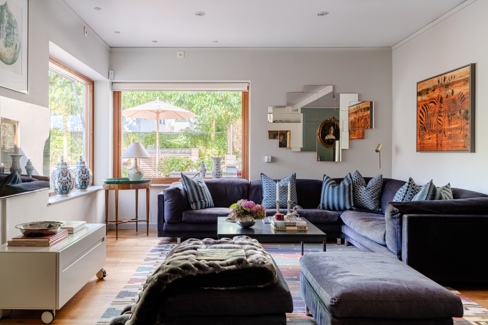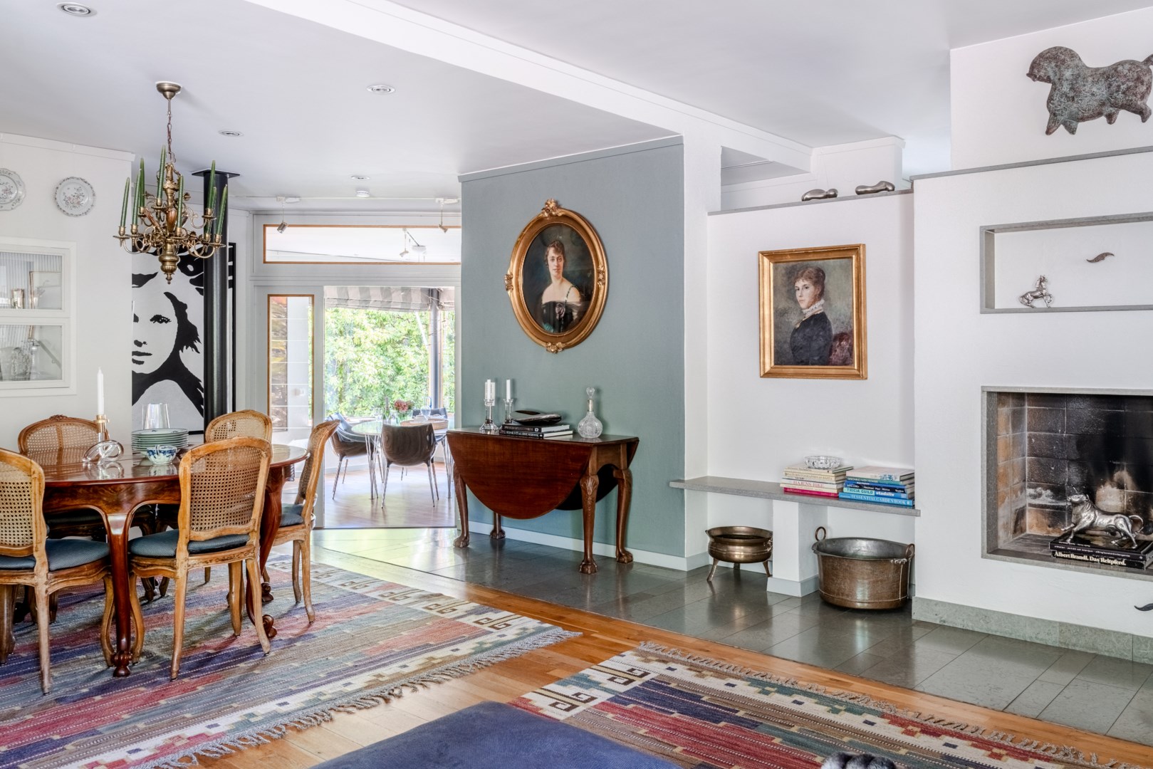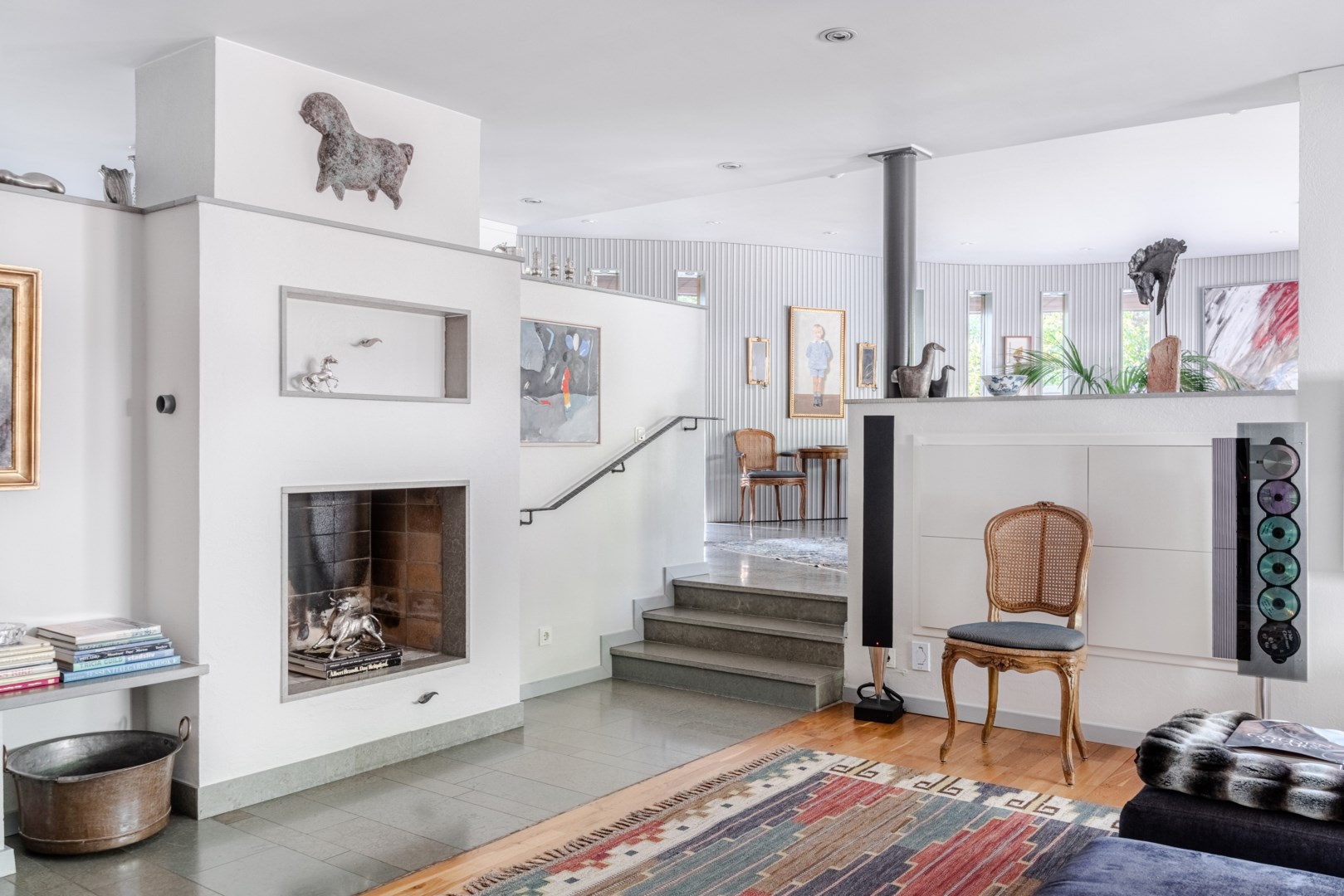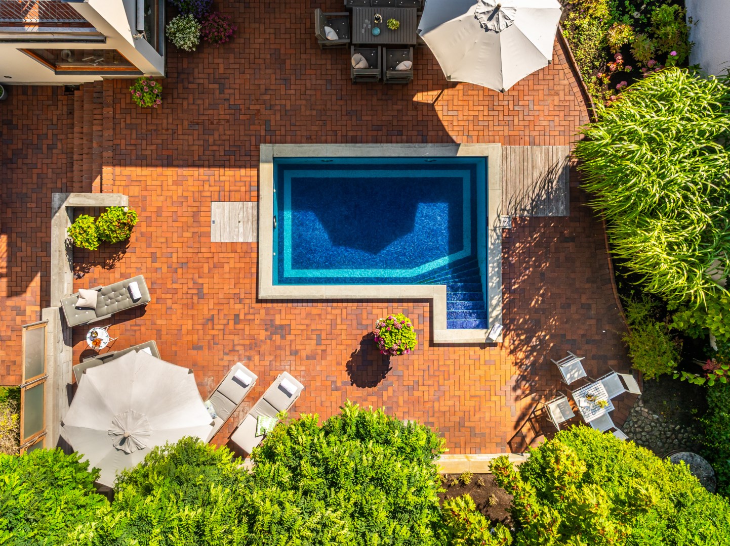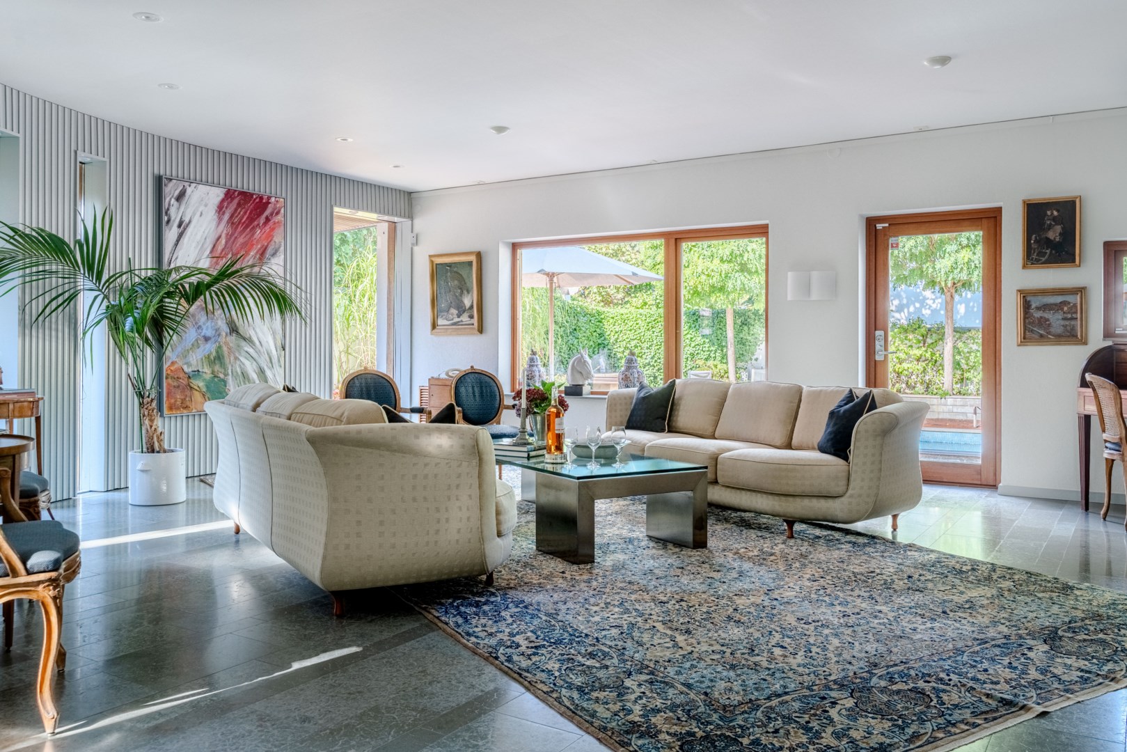 De sociala ytorna med nivåskillnader är utformade för ljus, rörelse och kontakt med trädgården – huskroppen följer markens naturliga höjdskillnader. Sällskapsrummen öppnar sig mot poolterrassen med västersol och stora fönsterpartier i massiv träomfattning ramar in grönskan och utemiljöerna som levande tavlor. Den generösa loungedelen andas världsvanhet och får varje gäst att känna sig priviligerad. Vardagsrummet och matsalen är som tagna ur Architectural Digest, och lämpar sig lika väl för intima middagar och hemmakvällar som för coctailtillställningar och långbord framför den mästerligt formgivna öppna spisen.