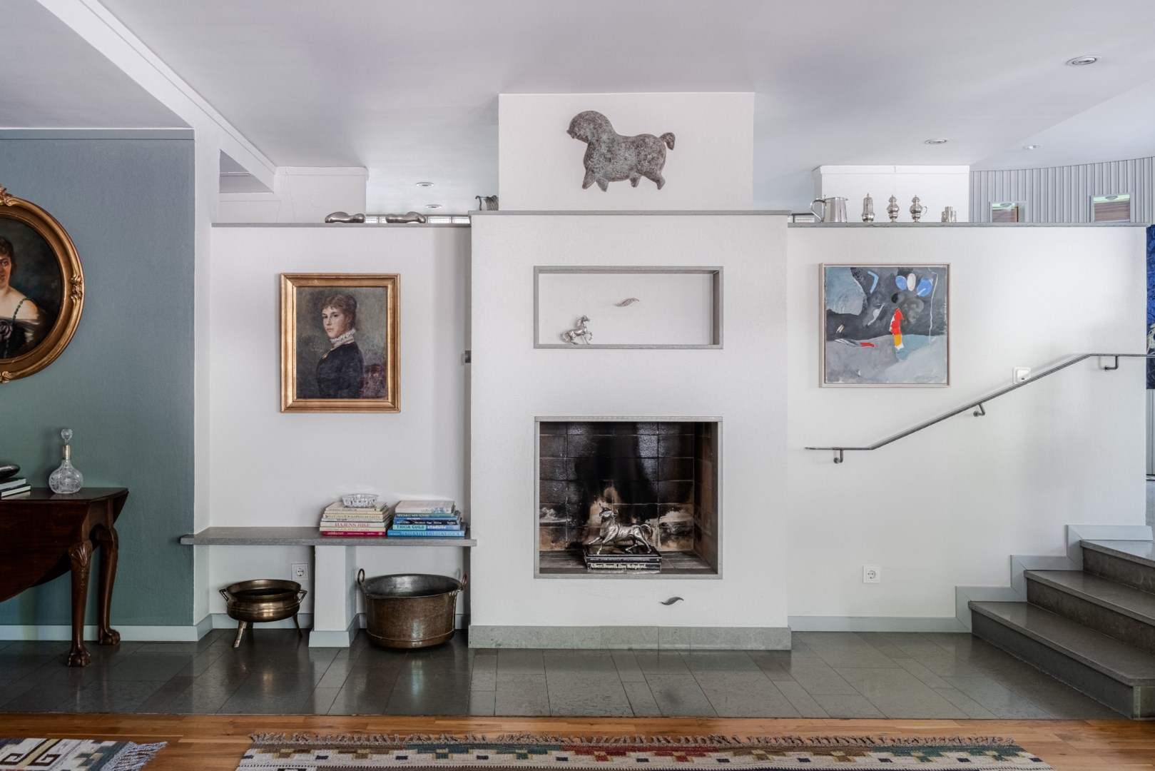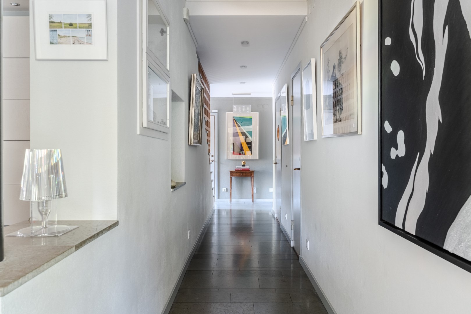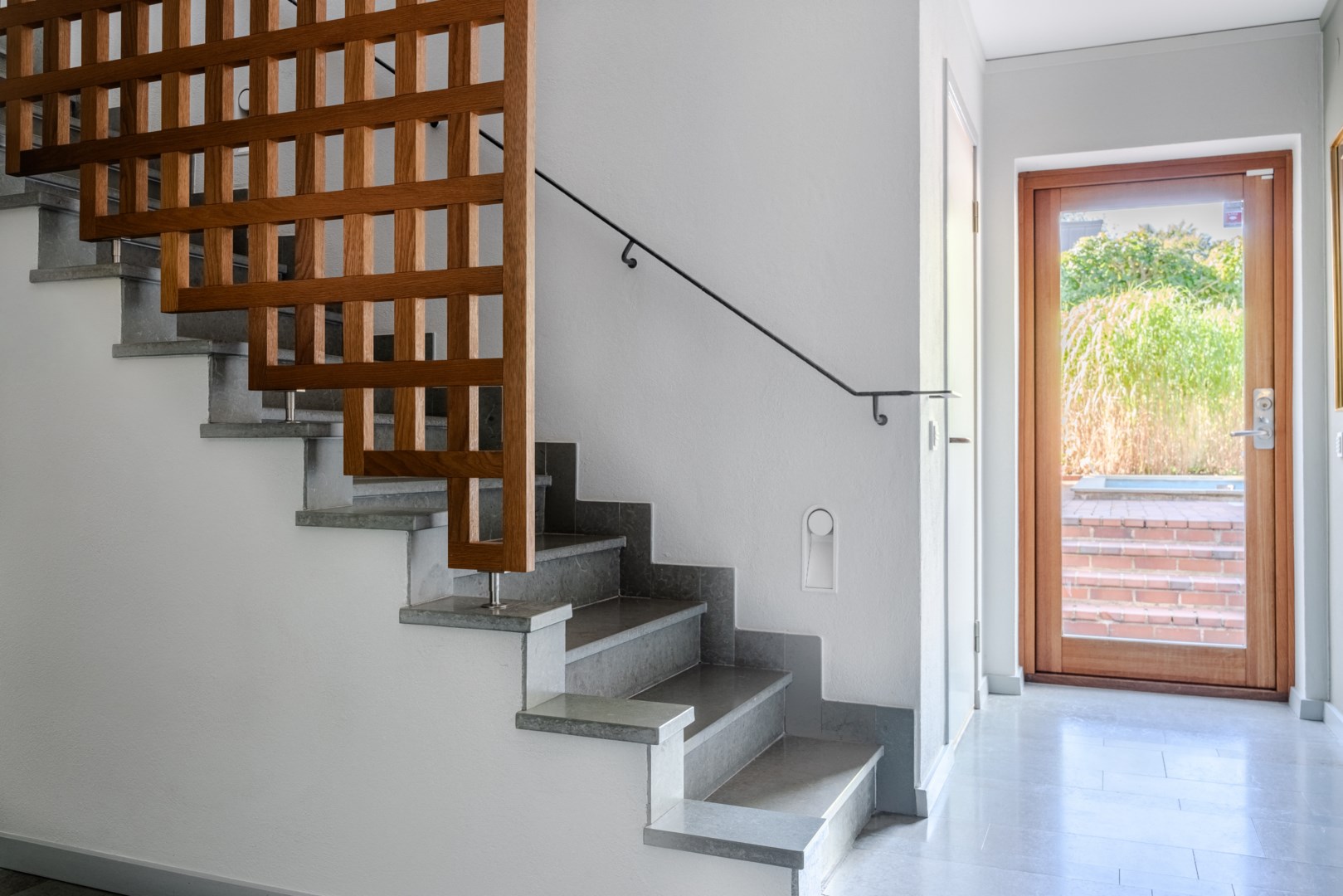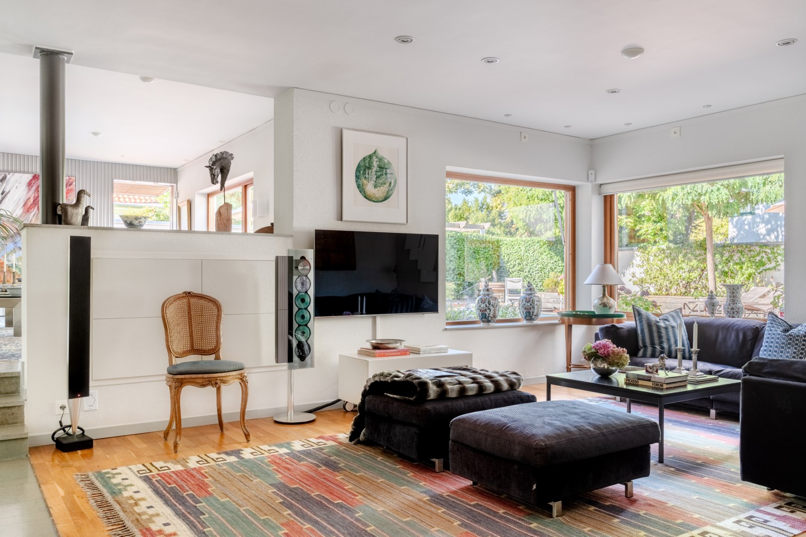 Den fasta inredningen är diskret och genomarbetad, med integrerade nischer och belysning som framhäver konst och textilier. Köket är både funktionellt och socialt, med frukostbord intill skyhöga rhododendron, altandörrar ut mot trädgården och en perfekt tempererad vinkällare i anslutning. Harmoniserande ärliga materialval genomsyrar husets samtliga rum, i form av ek, kalksten, vitputsade väggar, borstat stål, teak och glas – från de exklusiva badrummen och den fulländade trappan till de fyra utsökta sovrummen.