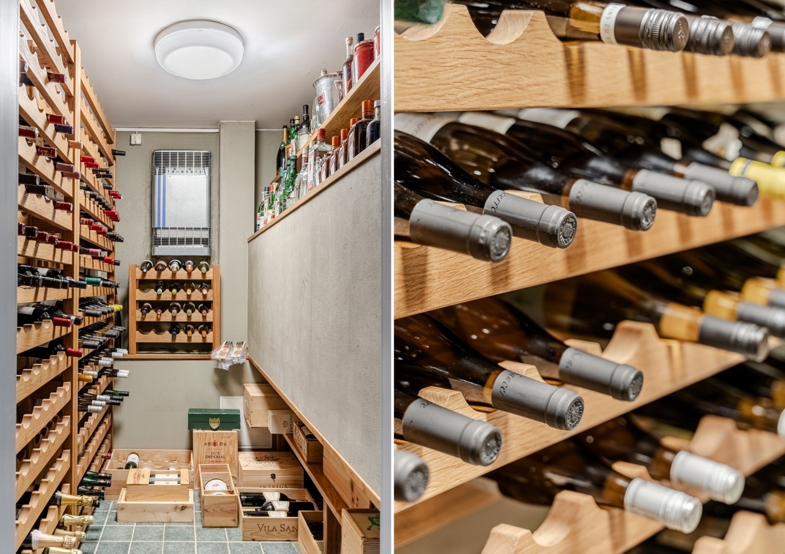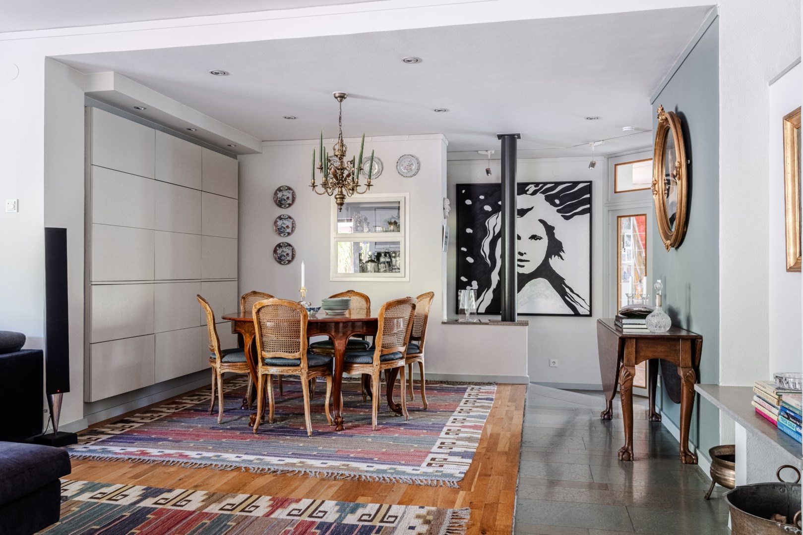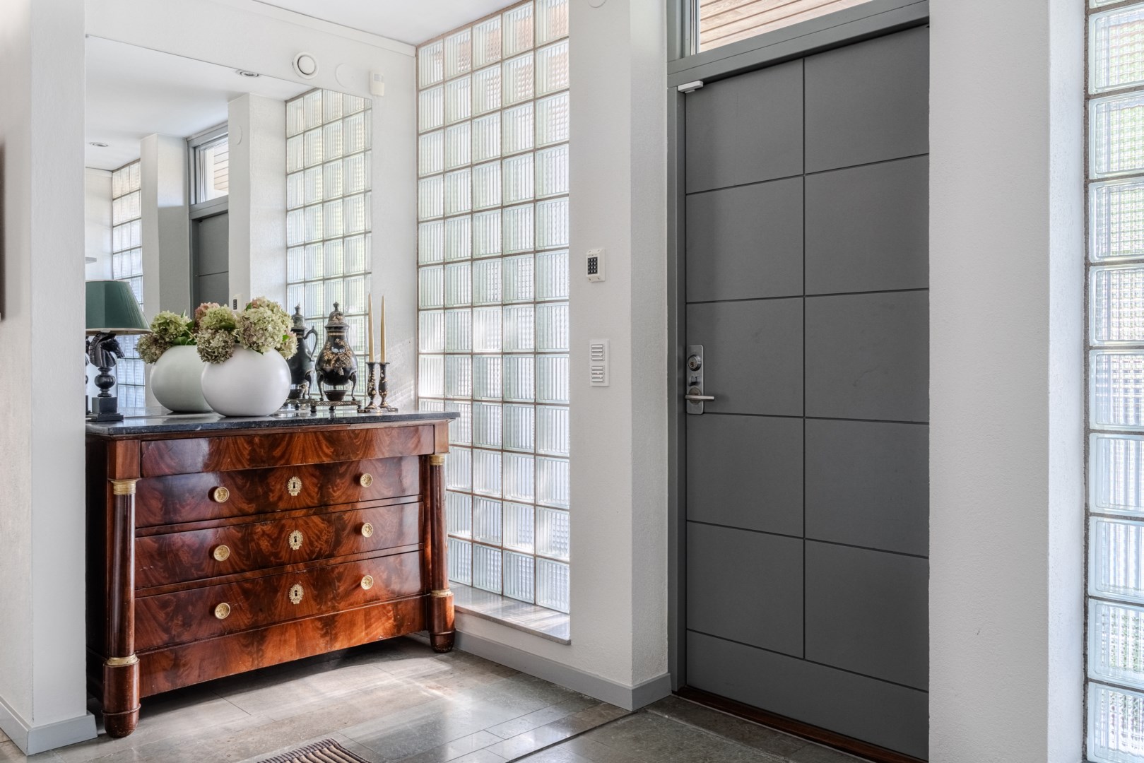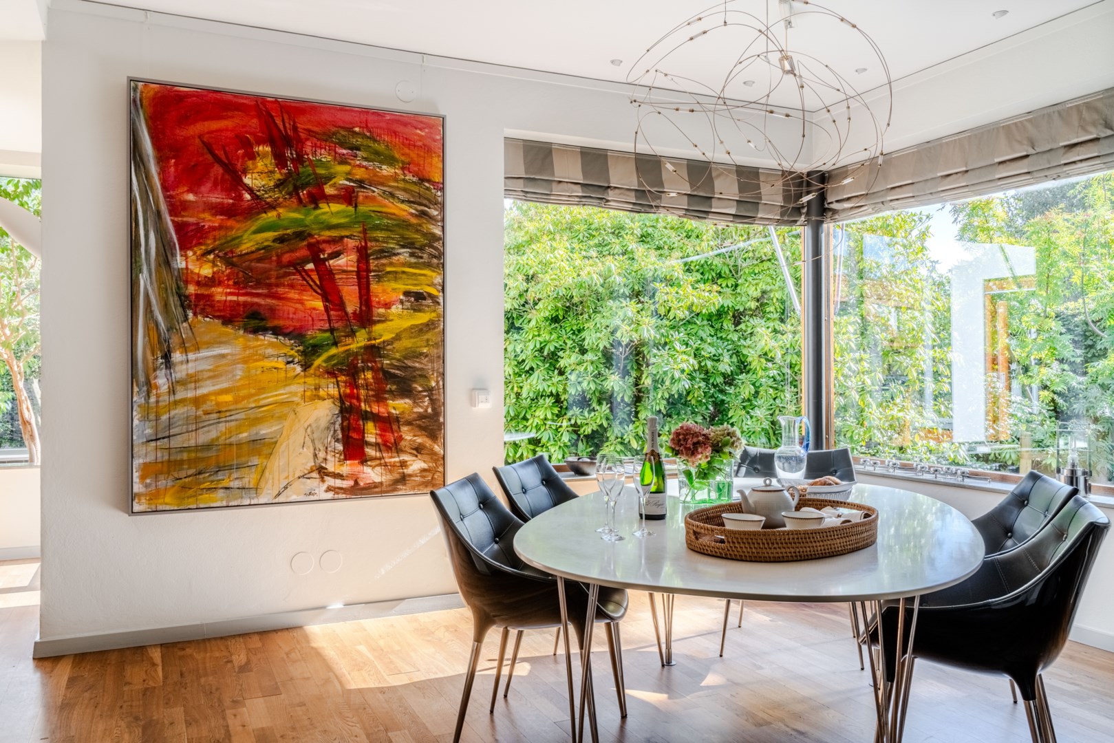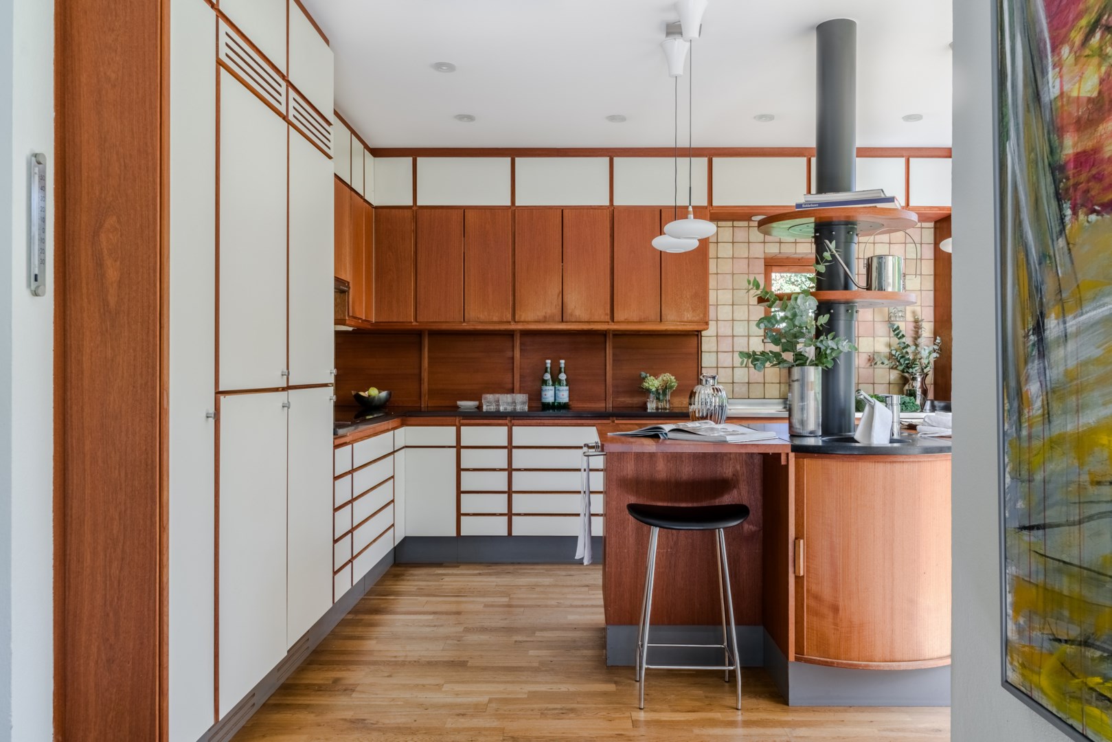 Den fasta inredningen är diskret och genomarbetad, med integrerade nischer och belysning som framhäver konst och textilier. Köket är både funktionellt och socialt, med frukostbord intill skyhöga rhododendron, altandörrar ut mot trädgården och en perfekt tempererad vinkällare i anslutning. Harmoniserande ärliga materialval genomsyrar husets samtliga rum, i form av ek, kalksten, vitputsade väggar, borstat stål, teak och glas – från de exklusiva badrummen och den fulländade trappan till de fyra utsökta sovrummen.