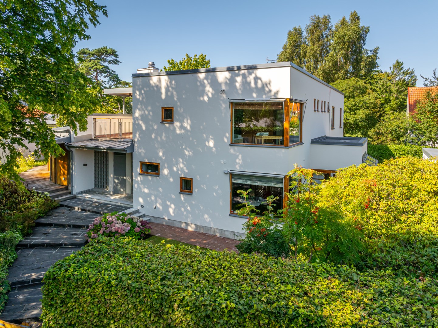 Den goda smaken återkommer i de övriga utemiljöerna, såsom den böljande skiffertrappan upp till huvudentrén och poolområdet som hämtat ur Slim Aarons fotokonst på temat “attractive people doing attractive things in attractive places”. Villans fulländade delar, såväl som den imponerande helheten, gör detta hem till ett av de allra mest framstående arkitektoniska mästerverken i gamla Falsterbo, tillsammans med Josef Franks funktionalistiska villor. En glamour och utsökthet präglar vardagslivet i detta hem, samtidigt som enkelheten och råheten i det strama formspråket berör på djupet.