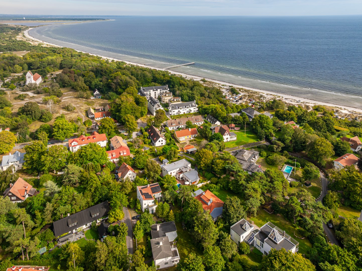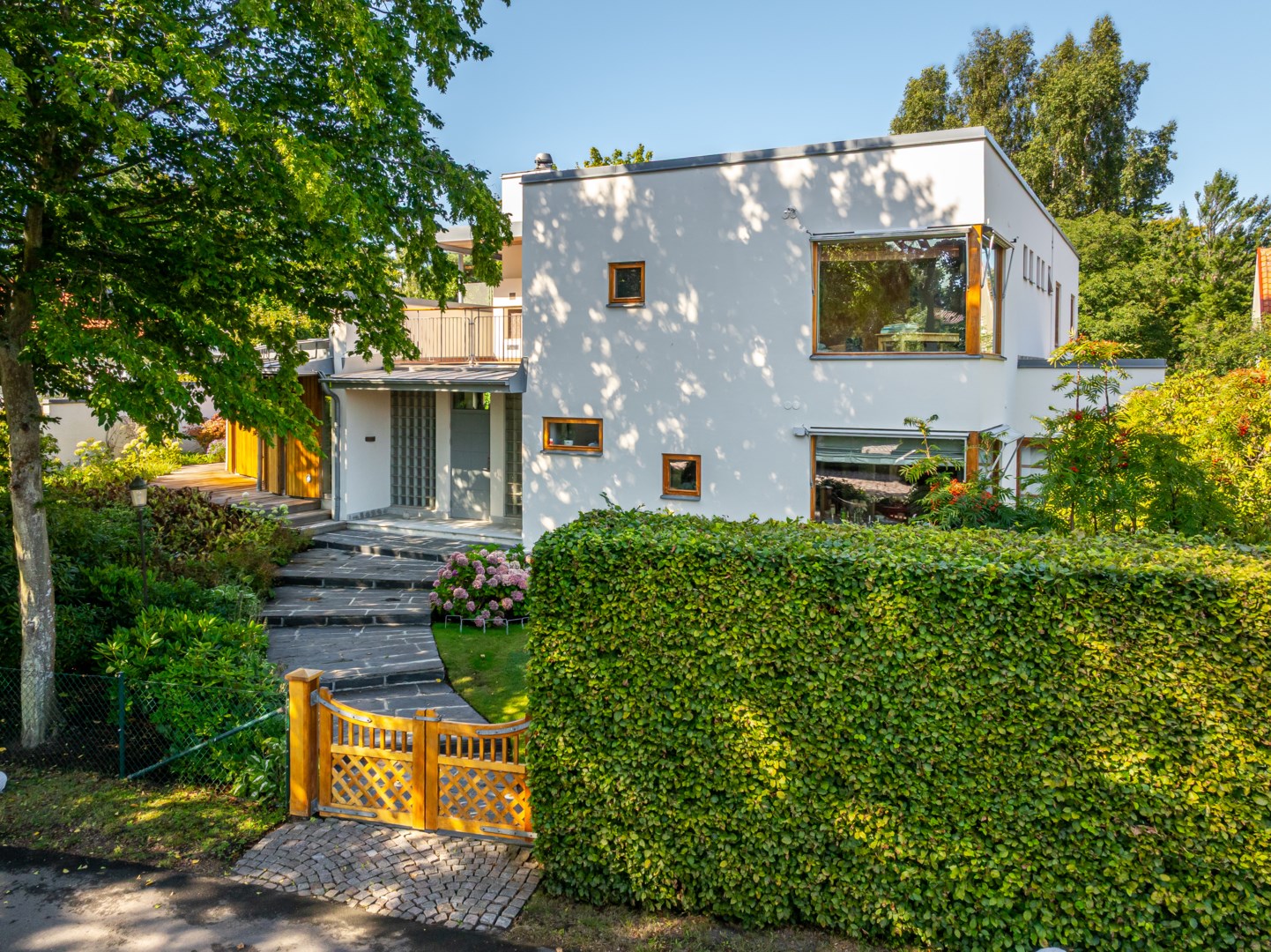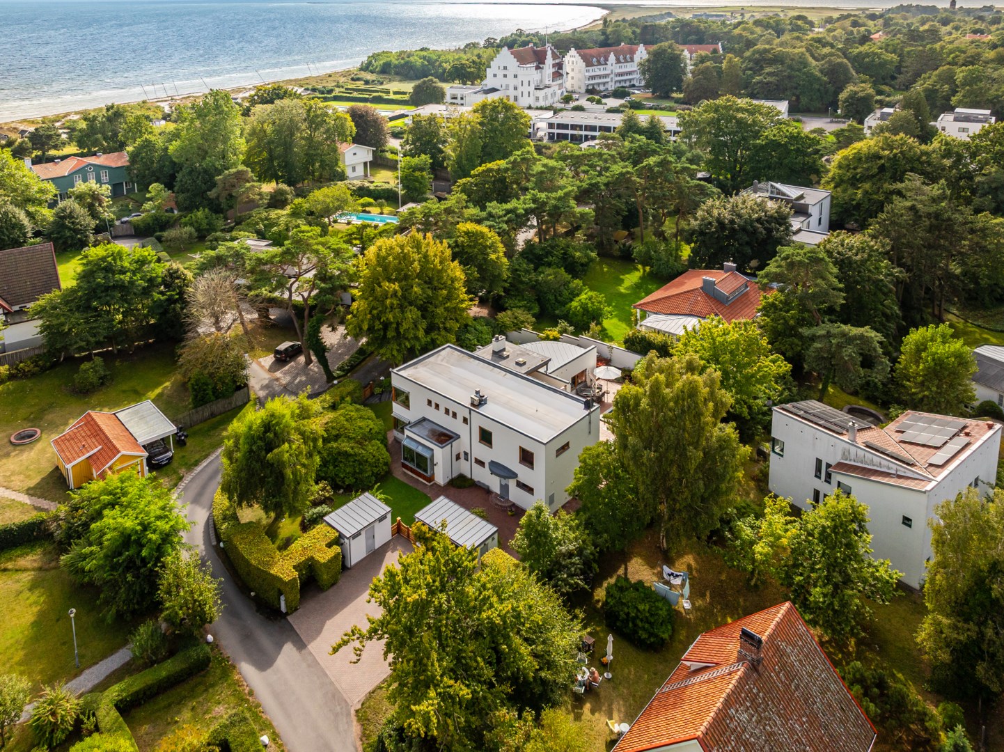 Beläget på en av Falsterbos allra mest eftertraktade adresser, en parallellgata till Sjögatan – den anrika och mer privata Anklamvägen – står denna imponerande moderna villa, som kombinerar det funktionalistiska formspråkets precision med ett humanistiskt uttryck. Uppdraget till arkitekten var att skapa ett hem där form och funktion möts med självklar elegans – där arkitekturen skulle tala samma språk som naturen runtomkring. Den böljande fasaden, de tidlösa materialen och det ljusfyllda interiöra flödet gör att huset känns levande, föränderligt och tidlöst. Ett av Falsterbos mest karaktärsstarka exempel på nordisk modernism.