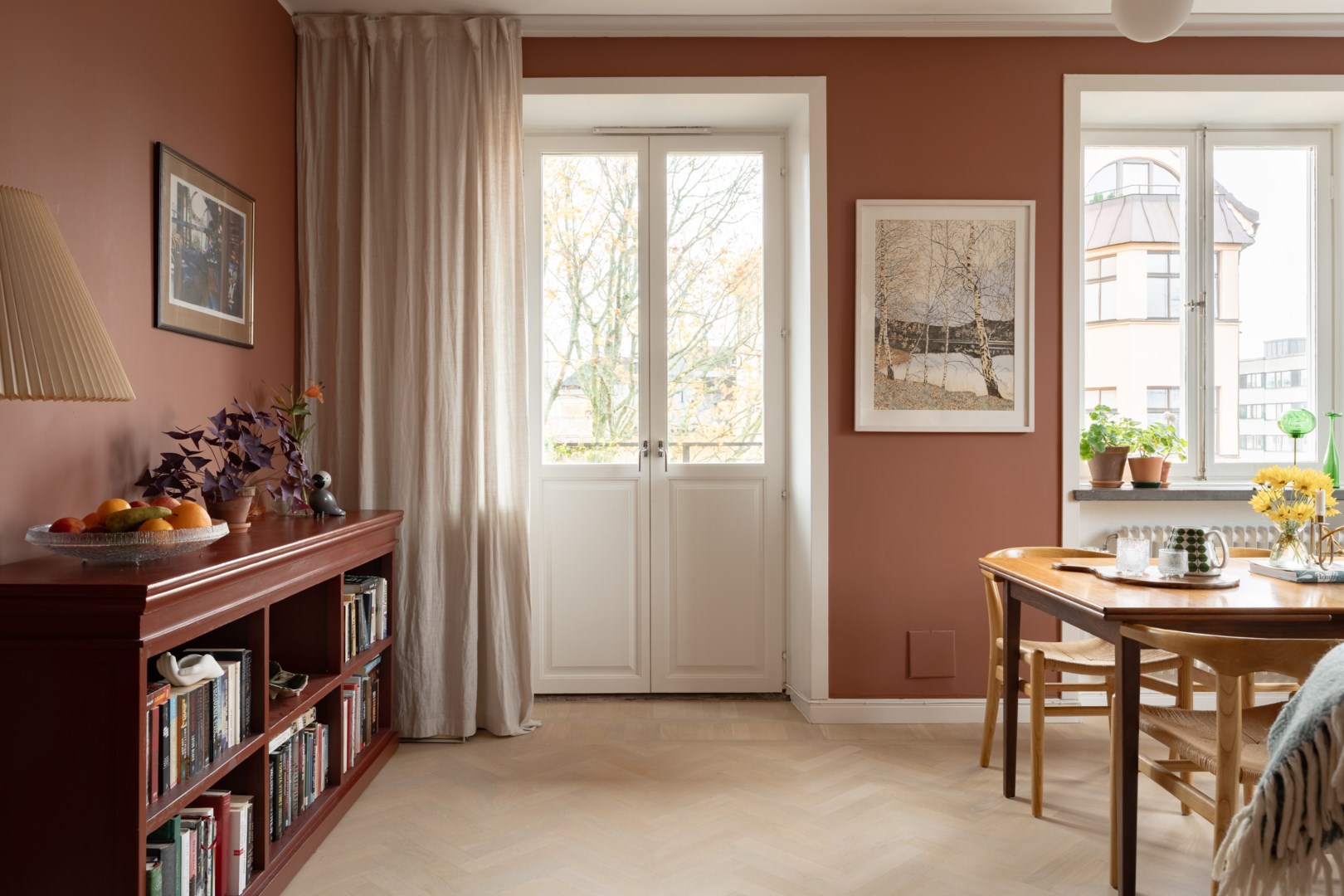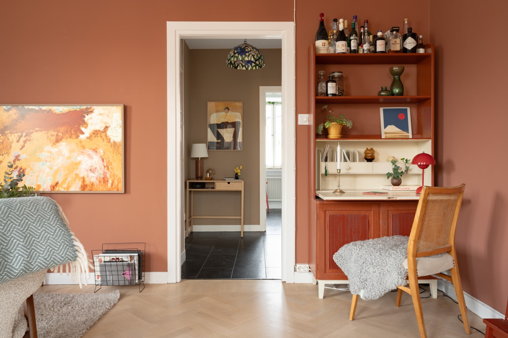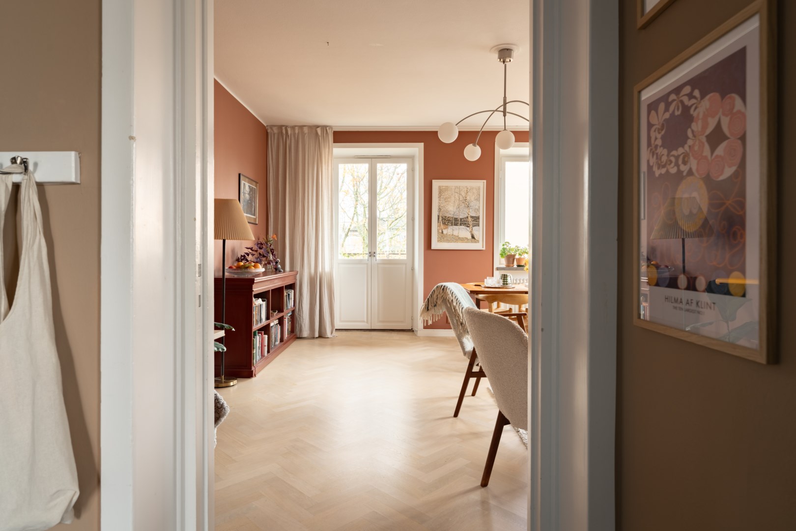 Några originaldetaljer som bevarats är spegeldörrar och hallinredning (garderober samt kläd-/hatthylla) liksom varsamt renoverade originalfönster. I sov- och vardagsrum ligger tidsenlig fiskbensparkett.