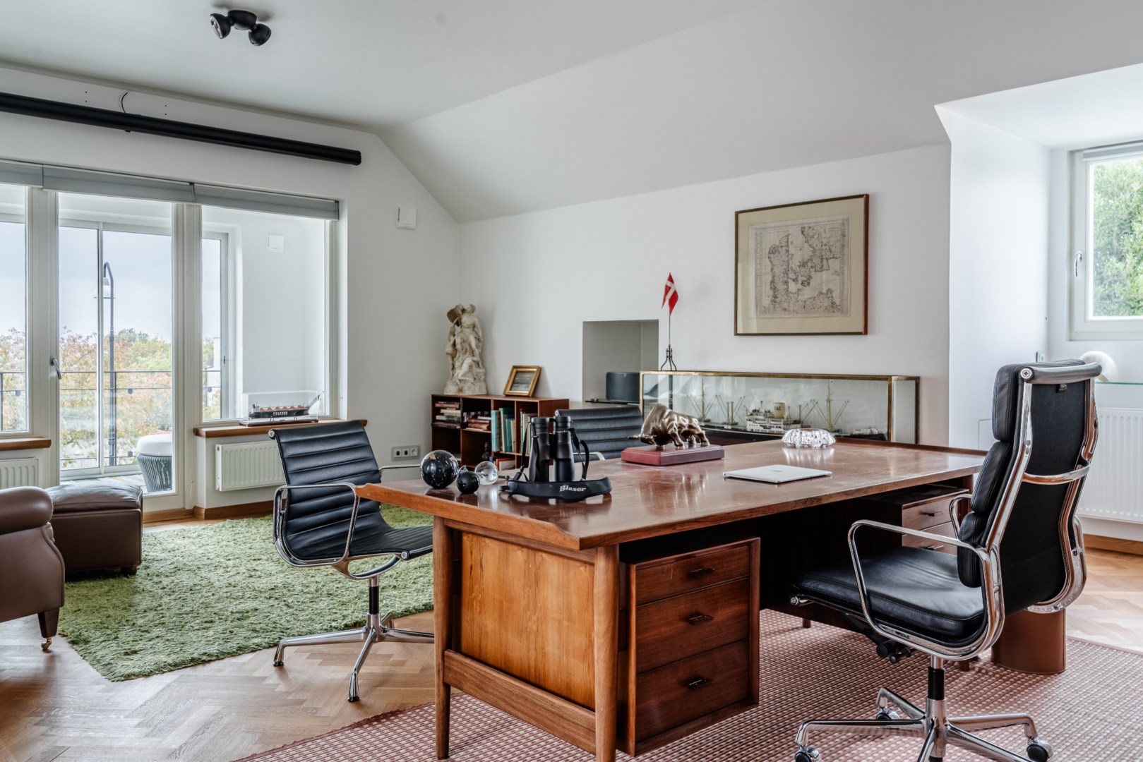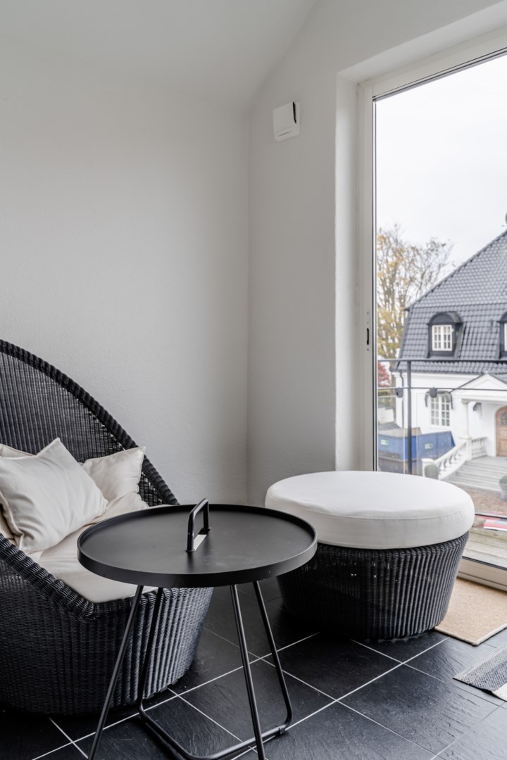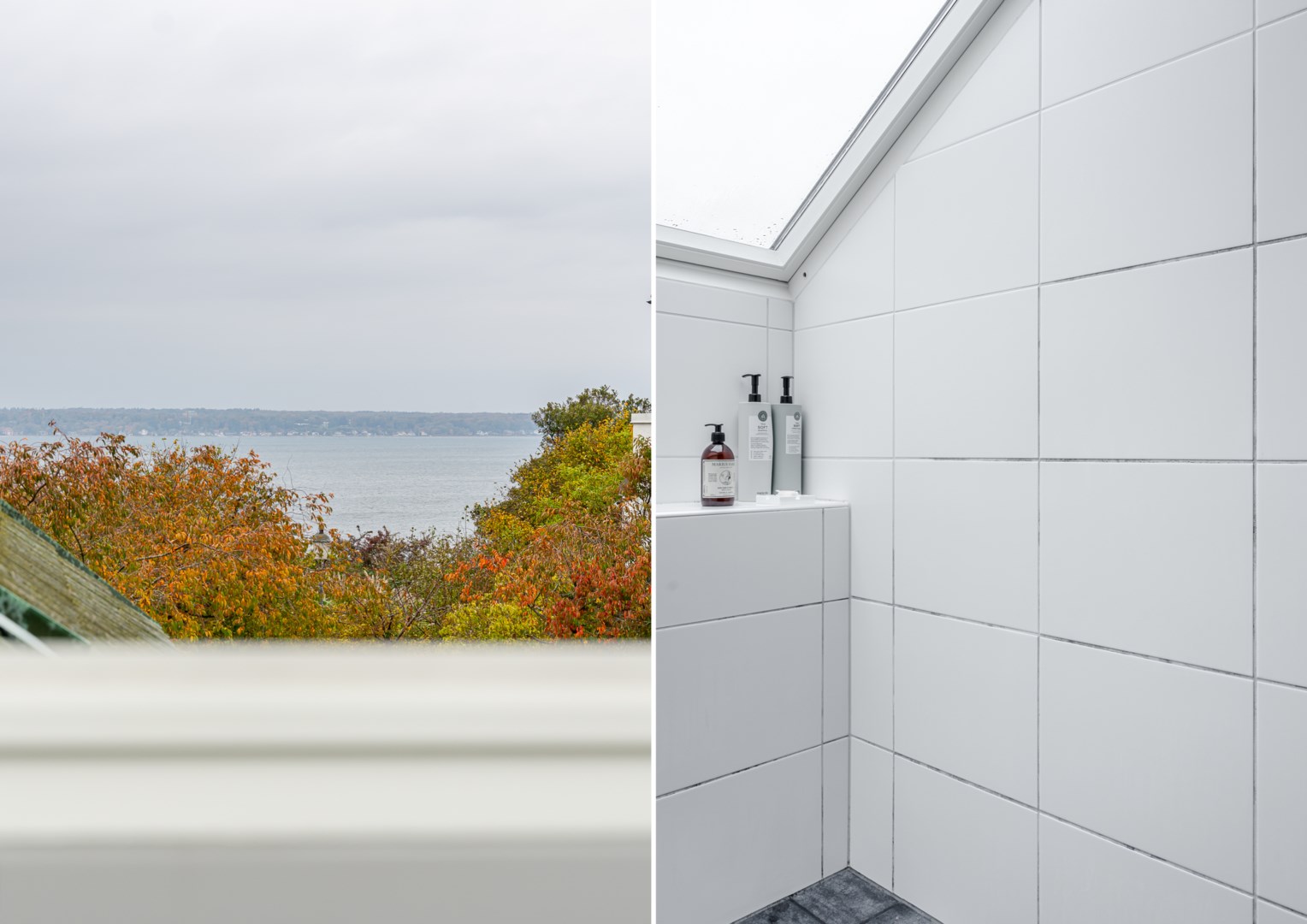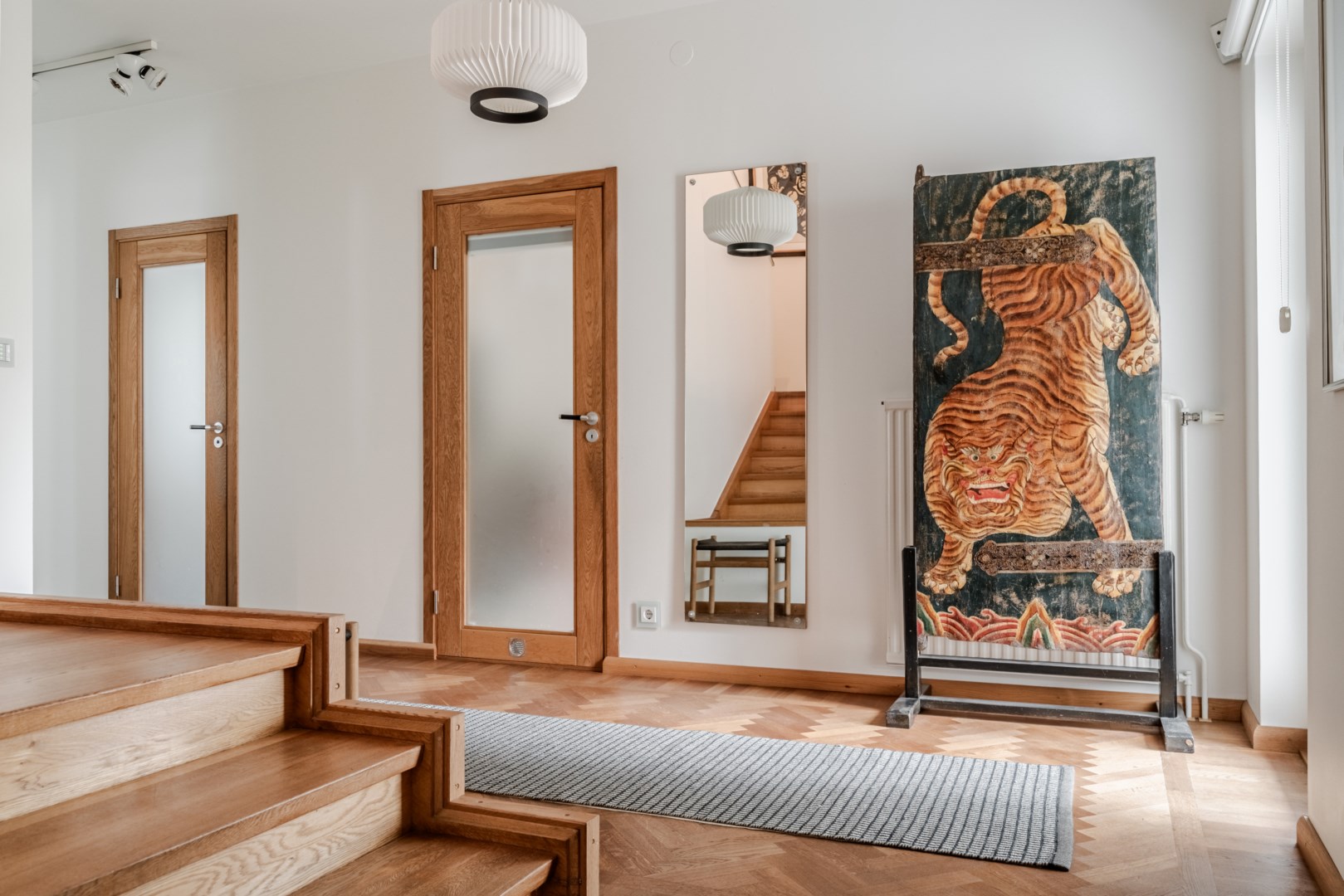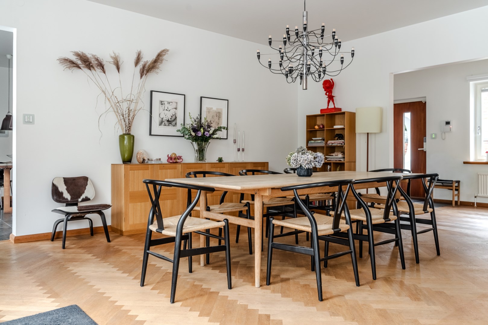 Interiört präglas huset av rejäla materialval och ett planerat flöde mellan vardagsrum och matsal, där stora fönster öppnar upp mot trädgården och den upphöjda terrassen. Bulthaup köket är placerat i direkt anslutning och utformat med en helväggslösning i valnöt med maskinpark från Gaggenau, en strikt, effektiv miljö där yta och linjeföring tillåts dominera. Planlösningen är fördelad i flera nivåer, där sällskapsytor och privata rum skiljs med tydlig struktur. Övre plan rymmer bland annat ett allrum likväl sovrum med utblick mot havet genom skjutdörrsparti och balkong i västerläge. Källarplanet är inrett för aktivitet och funktion, med glasad bastu, dusch, träningsyta med separat entré och vinkällare samt direktaccess till garage.