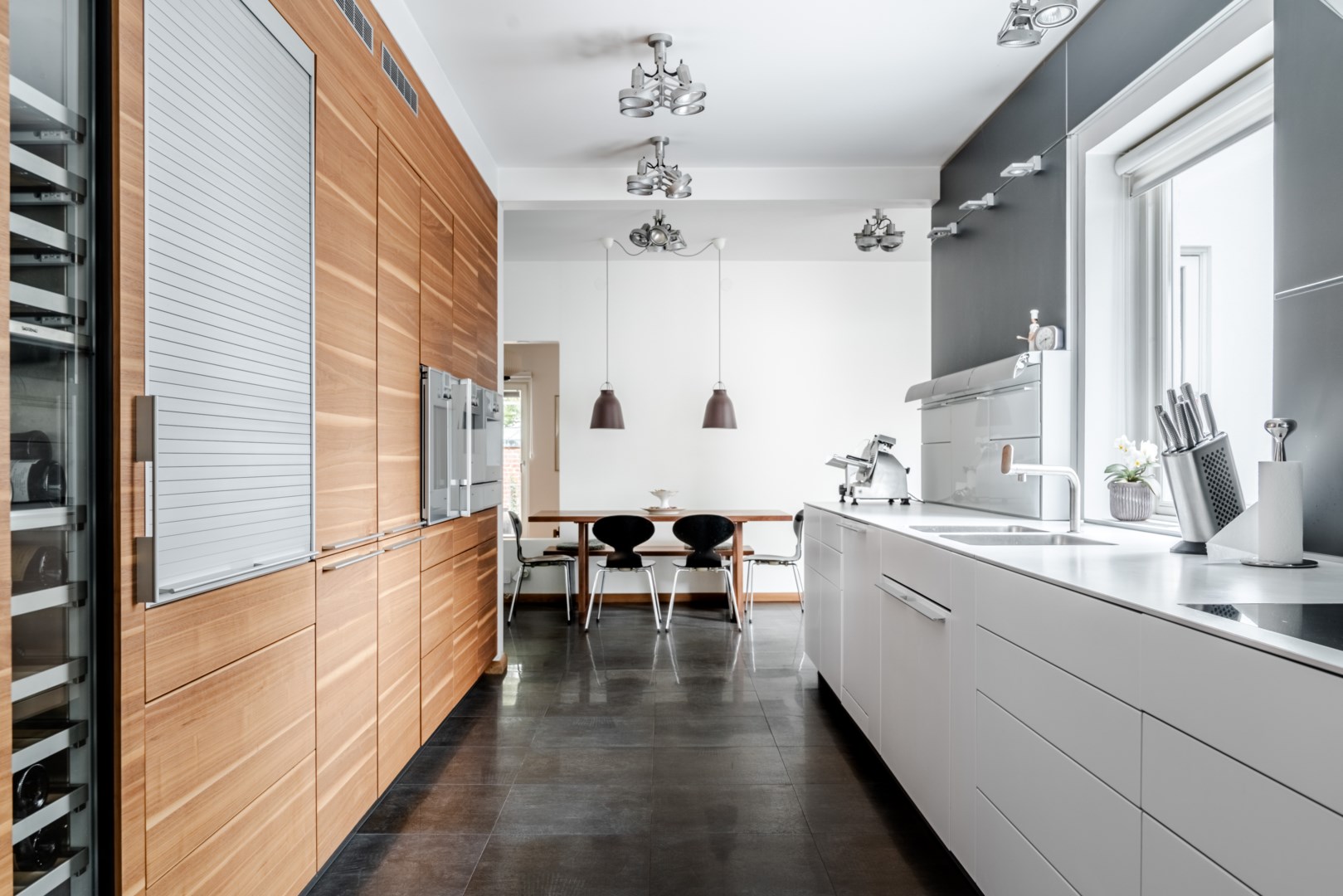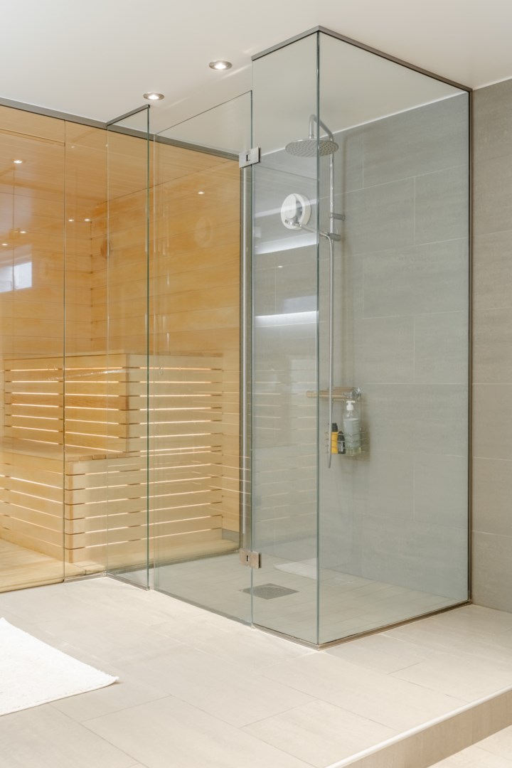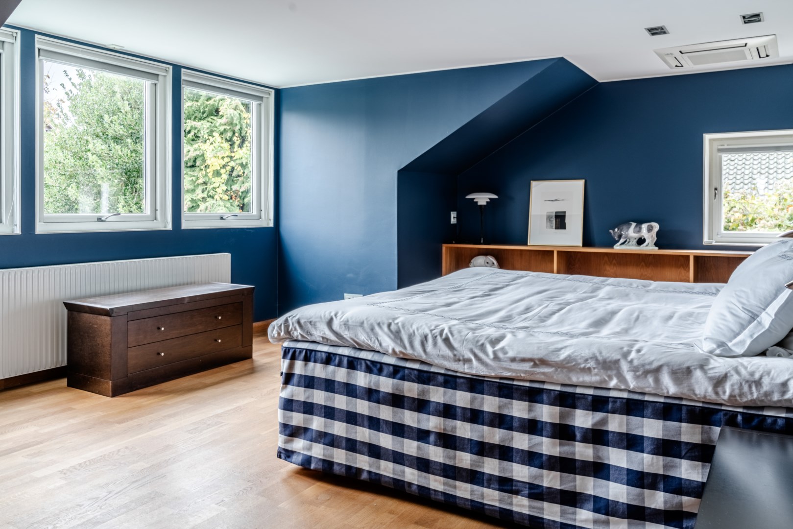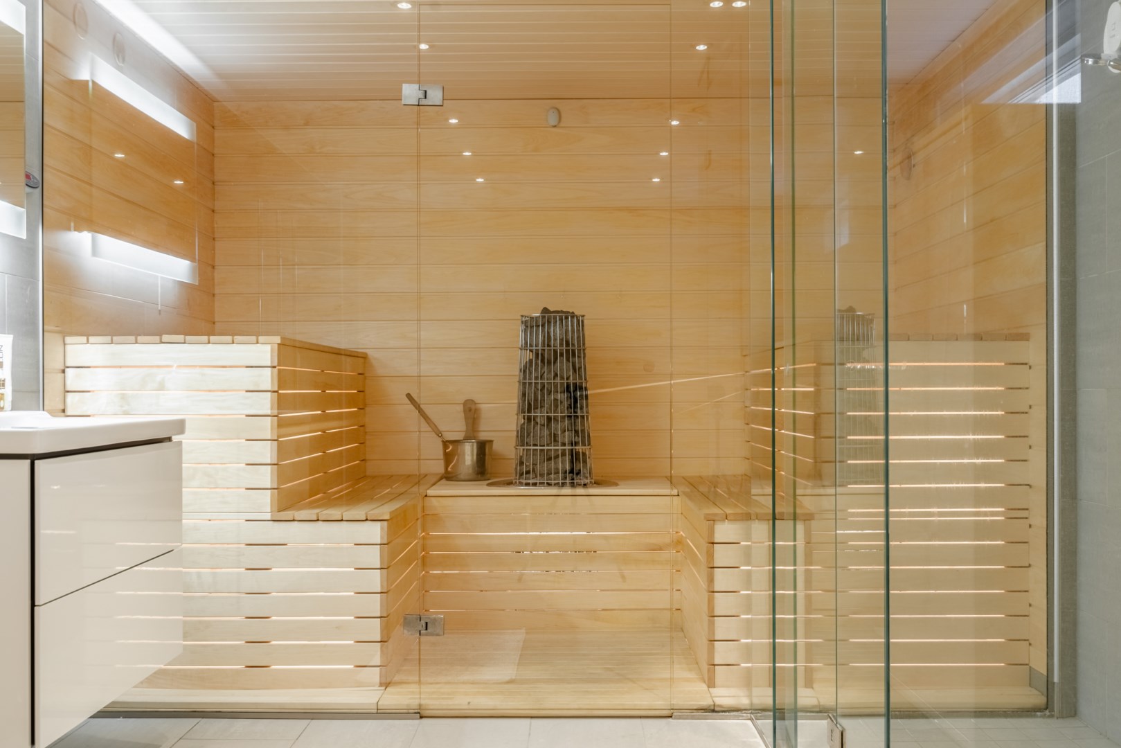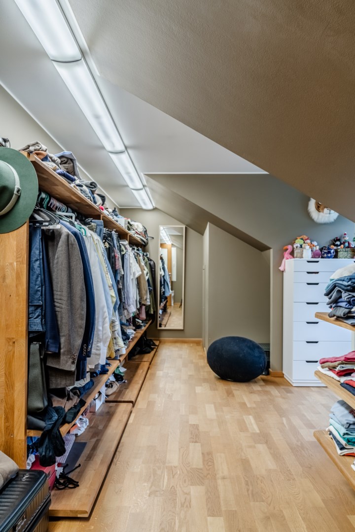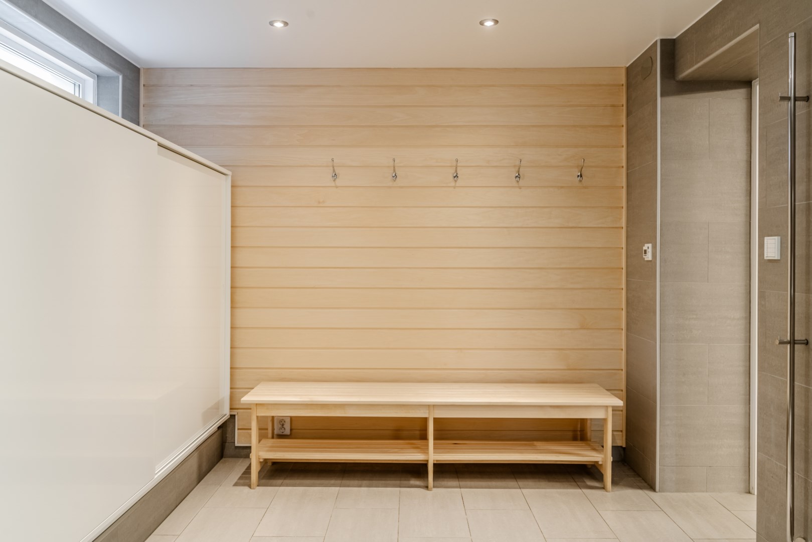 Interiört präglas huset av rejäla materialval och ett planerat flöde mellan vardagsrum och matsal, där stora fönster öppnar upp mot trädgården och den upphöjda terrassen. Bulthaup köket är placerat i direkt anslutning och utformat med en helväggslösning i valnöt med maskinpark från Gaggenau, en strikt, effektiv miljö där yta och linjeföring tillåts dominera. Planlösningen är fördelad i flera nivåer, där sällskapsytor och privata rum skiljs med tydlig struktur. Övre plan rymmer bland annat ett allrum likväl sovrum med utblick mot havet genom skjutdörrsparti och balkong i västerläge. Källarplanet är inrett för aktivitet och funktion, med glasad bastu, dusch, träningsyta med separat entré och vinkällare samt direktaccess till garage.