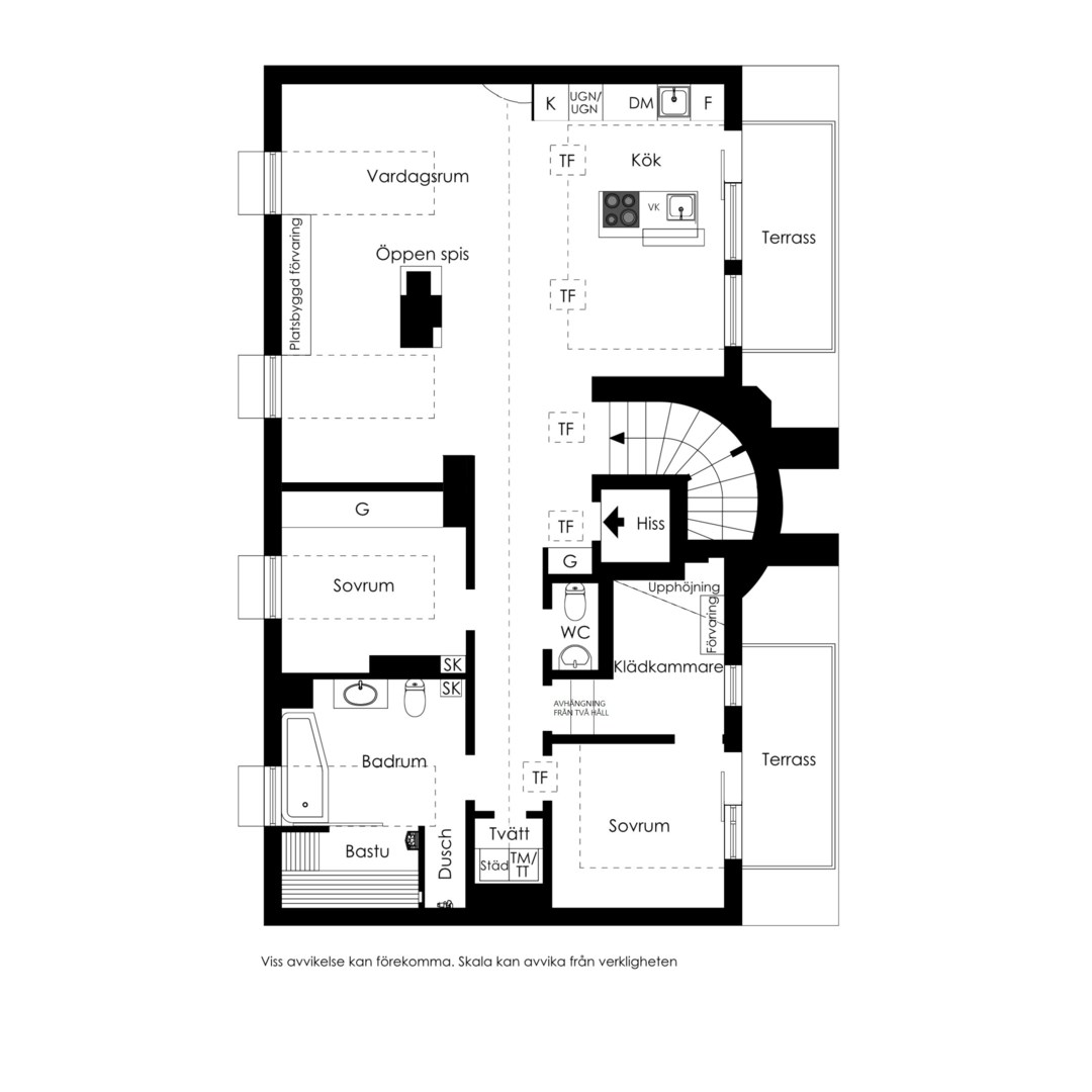 Här kommer du direkt in i våningen via låsbar hiss. Två terrasser som ligger mot gård. En terrass från kök och en från sovrum. Mycket påkostat badrum med både bad, dusch och bastu med utsikt mot Liljeholmsviken. Separat tvättstugedel med TM&TT (Gaggenau). Det finns även en mycket charmig separat WC.