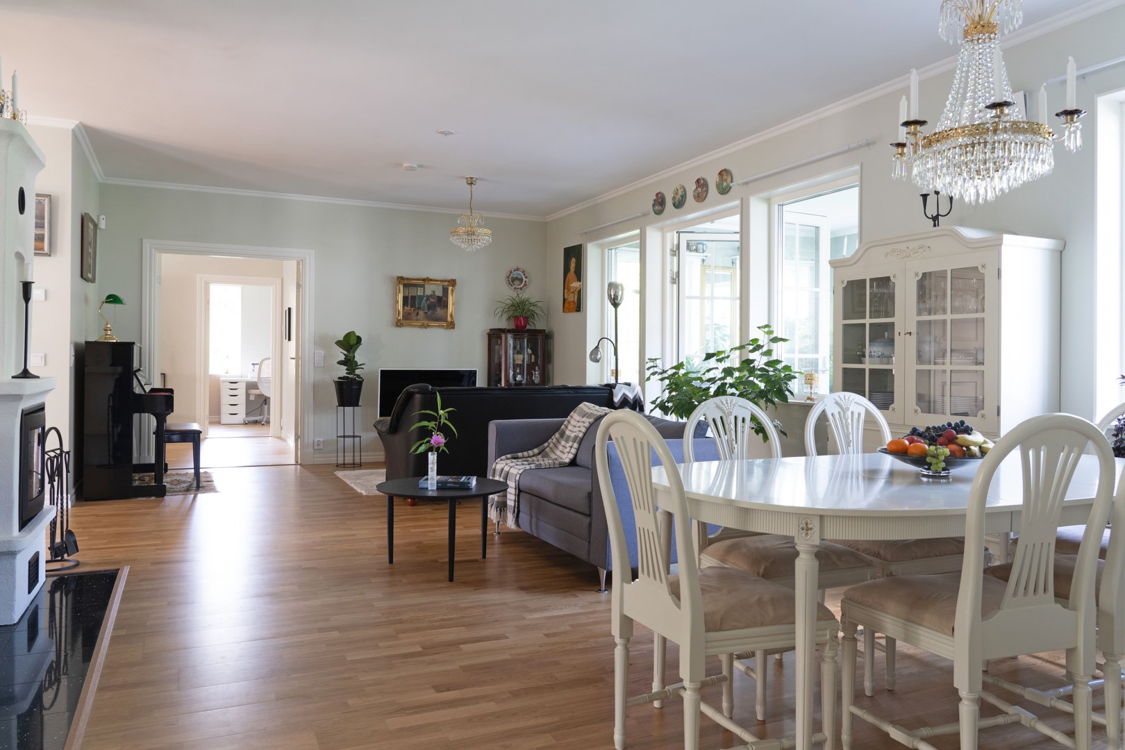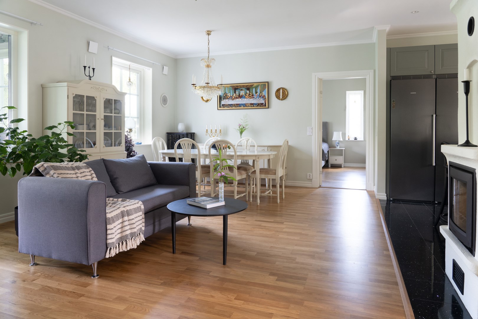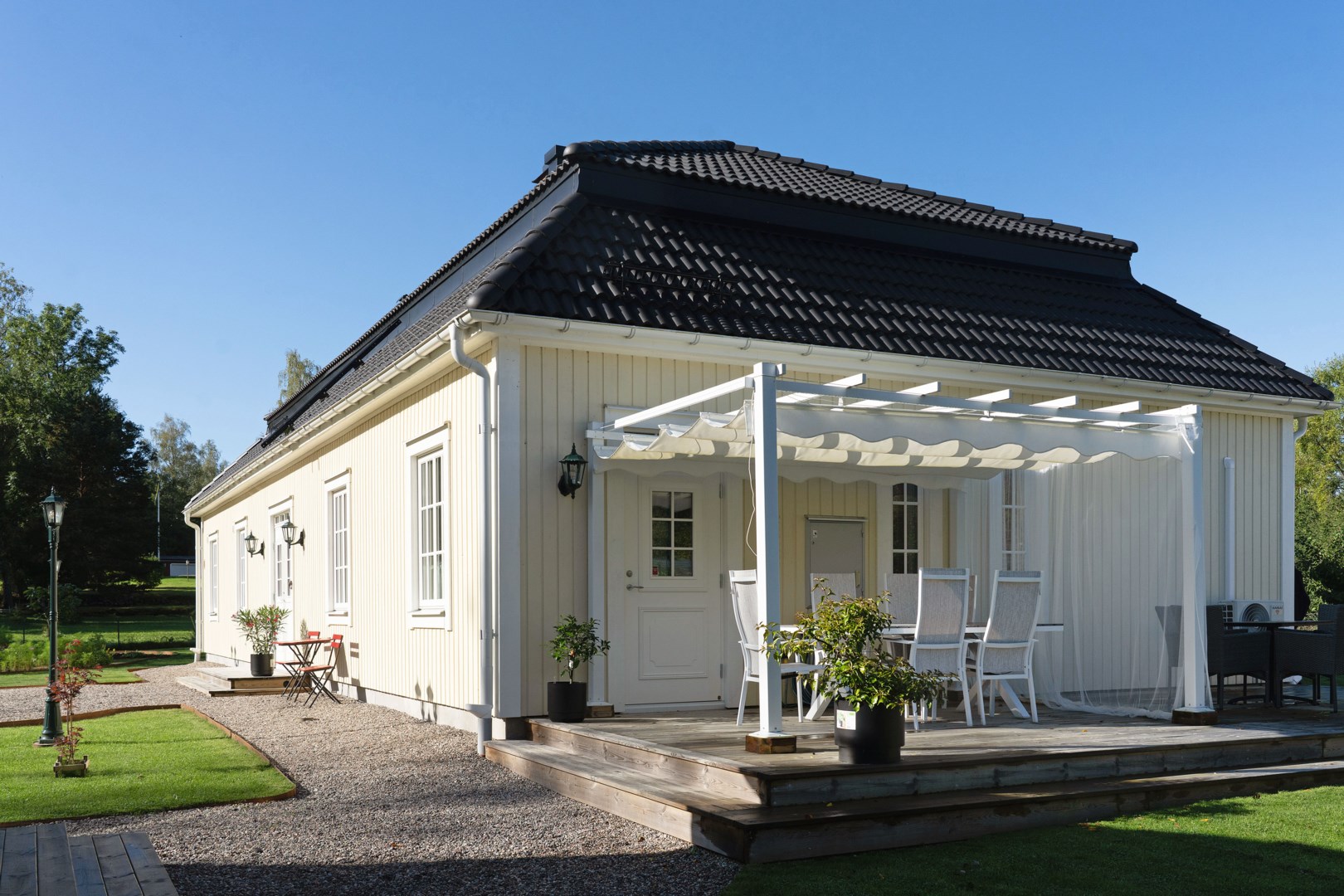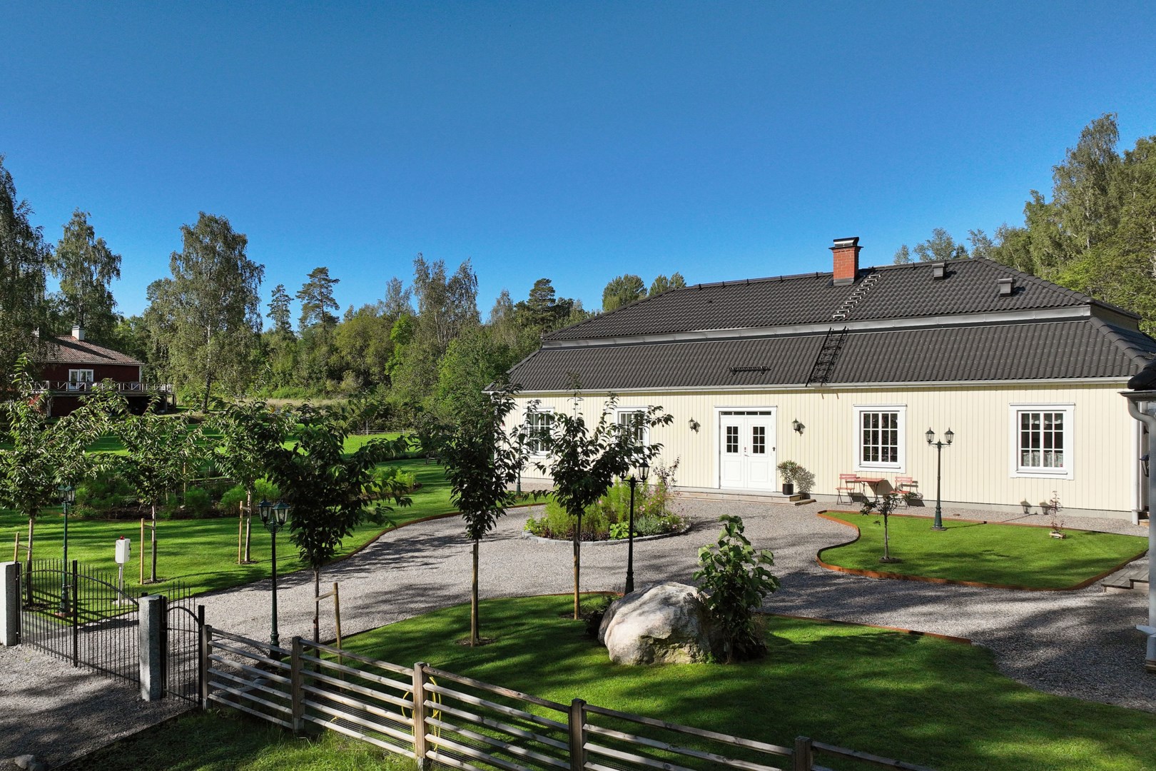 Grusad uppfart leder fram till entrén, där en rund plantering utgör en tydlig mittpunkt. Villan har genomgående ekgolv och vattenburen golvvärme via frånlufts-värmepump. Hall med pardörrar, klinkergolv och praktiska skjutdörrsgarderober. Kök från Marbodal i lantlig stil har granitbänkskiva, spröjsade skåp, skafferi och vitvaror från Siemens. Induktionshäll med infälld takfläkt. Vedeldad gjutjärnsspis och svart glittrande klinkergolv blandar den lantligt charmiga känslan med lyx. Matsal och sällskapsrum ligger intill köket i öppen planlösning med kamin och utgång till ett isolerat uterum med klinkergolv och trädgårdsaccess. Utemiljön bjuder på altan, pergola med skjutbart segeltak och stort trädäck. Villans Master suite har luftvärmepump med AC och eget badrum inrett med badkar, kommod, wc och handduksvärmare. Huset har också en avskild sovrumsavdelning med ytterligare tre sovrum. Helkaklat badrum ligger i anslutning till entrén med duschkabin med massagestrålar. Nära hallen finns ett kombinerat teknikrum och tvättstuga med Siemens-maskiner och groventré mot altanen. Det fristående garaget har praktiskt betonggolv, en eldriven port och en separat förrådsdel samt luftvärmepumo för uppvärmning. Invändigt finns organiserad förvaring med redskapsvägg samt laddare för elbil.