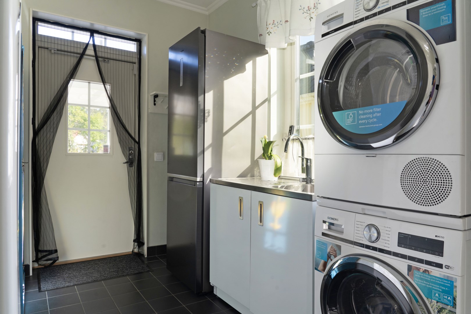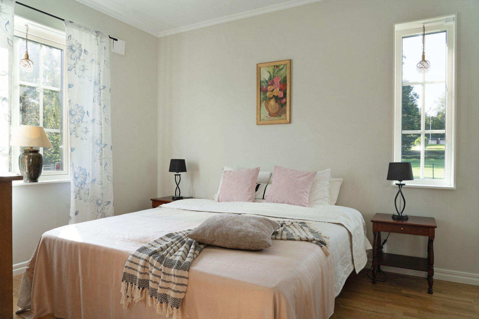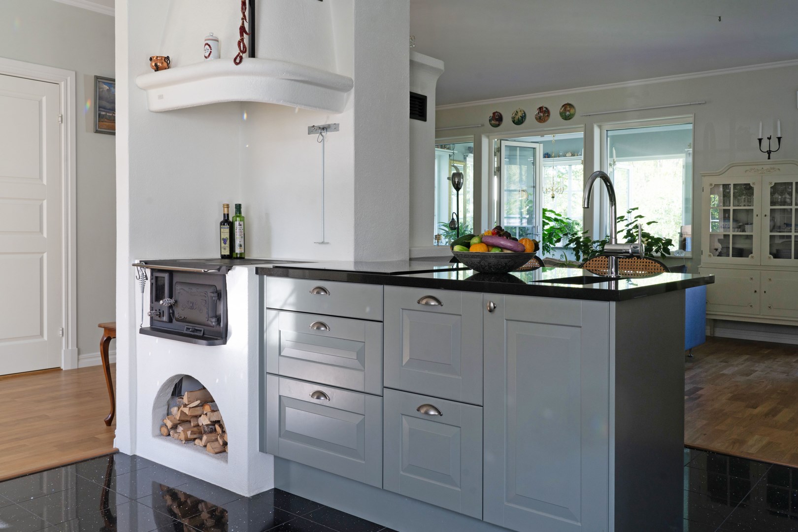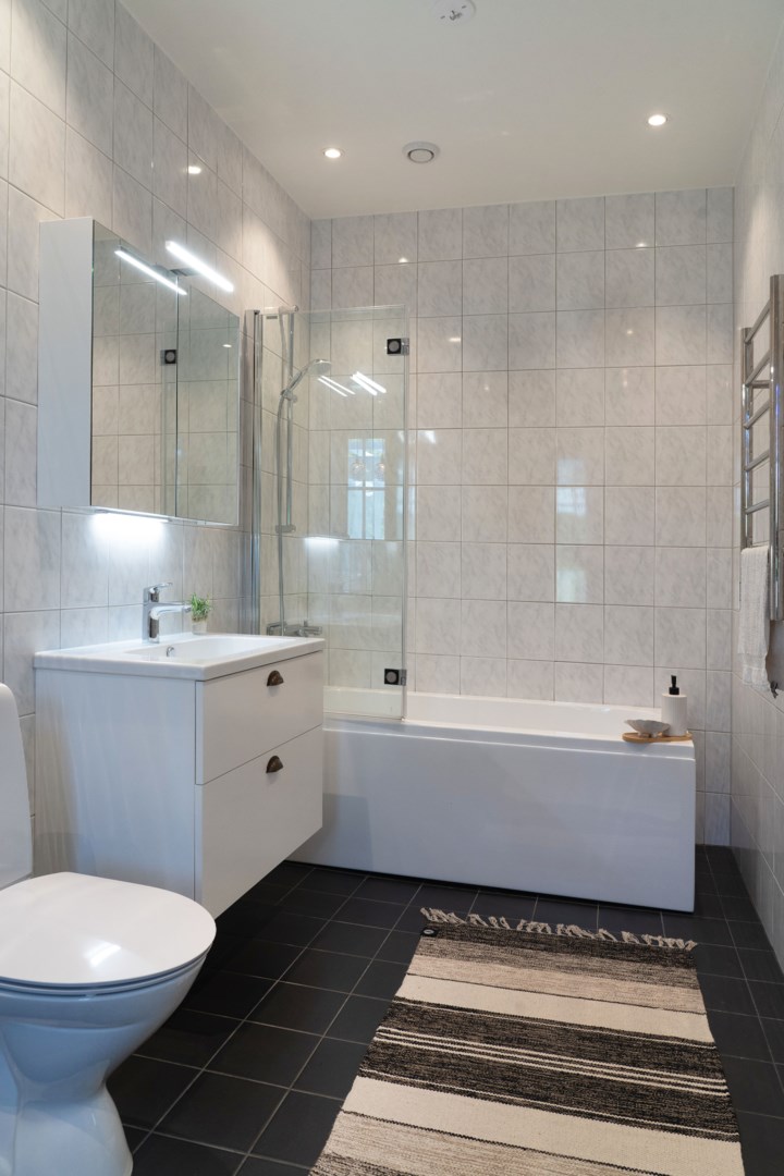 Grusad uppfart leder fram till entrén, där en rund plantering utgör en tydlig mittpunkt. Villan har genomgående ekgolv och vattenburen golvvärme via frånlufts-värmepump. Hall med pardörrar, klinkergolv och praktiska skjutdörrsgarderober. Kök från Marbodal i lantlig stil har granitbänkskiva, spröjsade skåp, skafferi och vitvaror från Siemens. Induktionshäll med infälld takfläkt. Vedeldad gjutjärnsspis och svart glittrande klinkergolv blandar den lantligt charmiga känslan med lyx. Matsal och sällskapsrum ligger intill köket i öppen planlösning med kamin och utgång till ett isolerat uterum med klinkergolv och trädgårdsaccess. Utemiljön bjuder på altan, pergola med skjutbart segeltak och stort trädäck. Villans Master suite har luftvärmepump med AC och eget badrum inrett med badkar, kommod, wc och handduksvärmare. Huset har också en avskild sovrumsavdelning med ytterligare tre sovrum. Helkaklat badrum ligger i anslutning till entrén med duschkabin med massagestrålar. Nära hallen finns ett kombinerat teknikrum och tvättstuga med Siemens-maskiner och groventré mot altanen. Det fristående garaget har praktiskt betonggolv, en eldriven port och en separat förrådsdel samt luftvärmepumo för uppvärmning. Invändigt finns organiserad förvaring med redskapsvägg samt laddare för elbil.