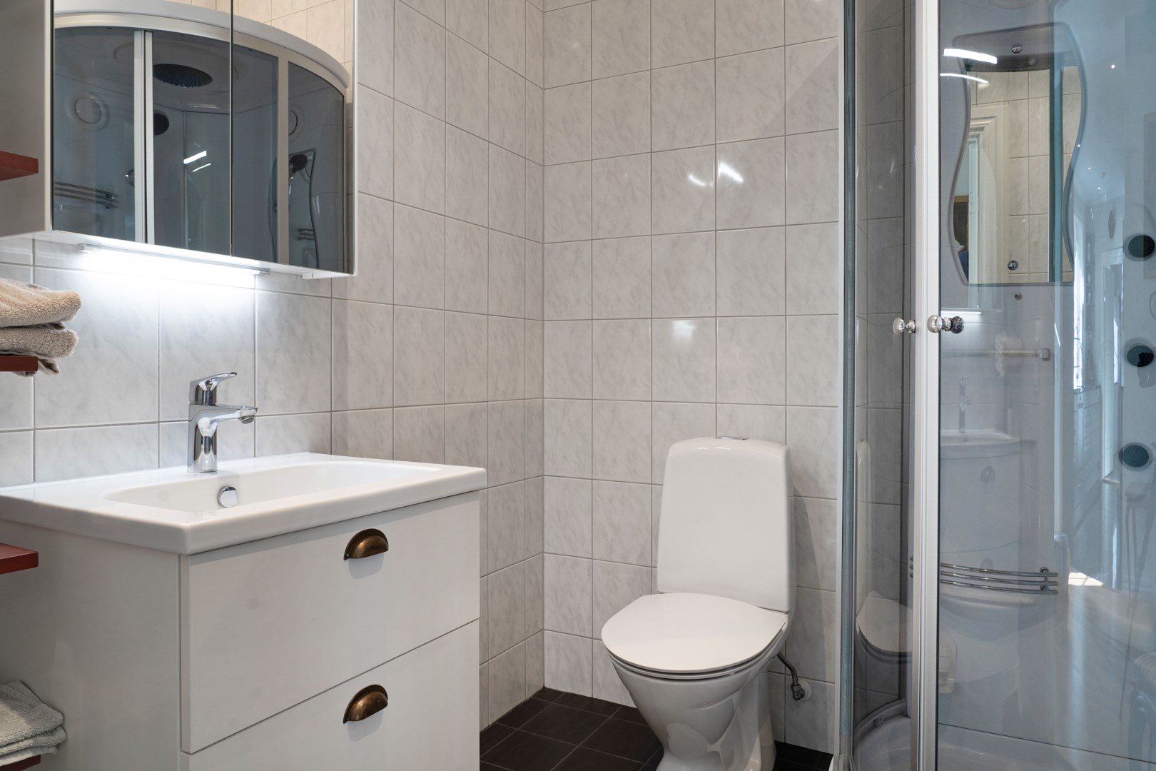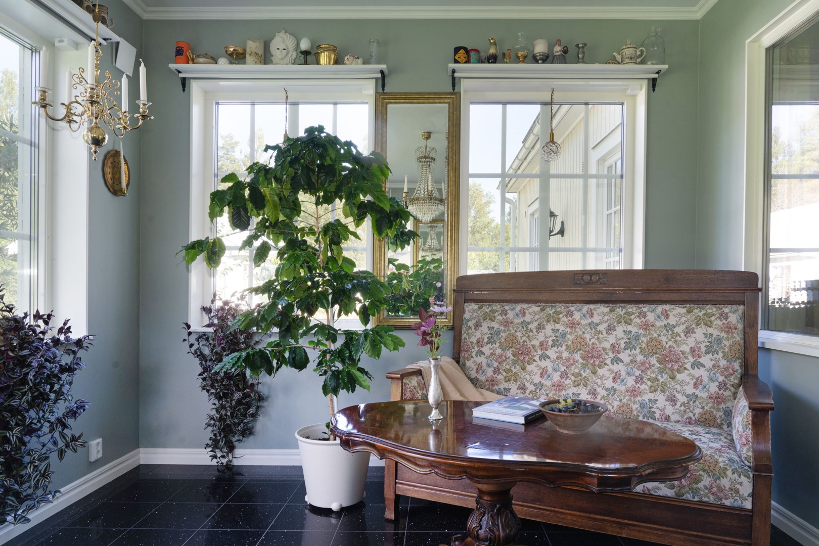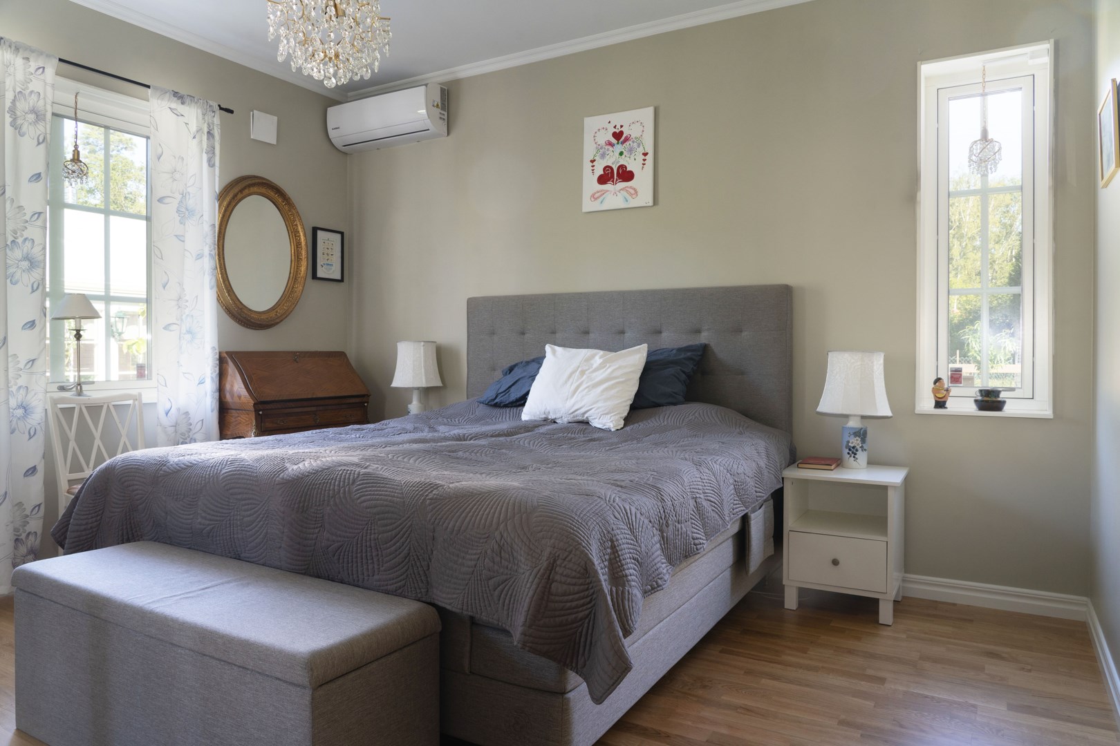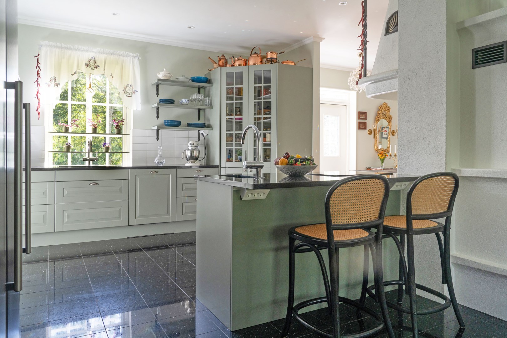Grusad uppfart leder fram till entrén, där en rund plantering utgör en tydlig mittpunkt. Villan har genomgående ekgolv och vattenburen golvvärme via frånlufts-värmepump. Hall med pardörrar, klinkergolv och praktiska skjutdörrsgarderober. Kök från Marbodal i lantlig stil har granitbänkskiva, spröjsade skåp, skafferi och vitvaror från Siemens. Induktionshäll med infälld takfläkt. Vedeldad gjutjärnsspis och svart glittrande klinkergolv blandar den lantligt charmiga känslan med lyx. Matsal och sällskapsrum ligger intill köket i öppen planlösning med kamin och utgång till ett isolerat uterum med klinkergolv och trädgårdsaccess. Utemiljön bjuder på altan, pergola med skjutbart segeltak och stort trädäck. Villans Master suite har luftvärmepump med AC och eget badrum inrett med badkar, kommod, wc och handduksvärmare. Huset har också en avskild sovrumsavdelning med ytterligare tre sovrum. Helkaklat badrum ligger i anslutning till entrén med duschkabin med massagestrålar. Nära hallen finns ett kombinerat teknikrum och tvättstuga med Siemens-maskiner och groventré mot altanen. Det fristående garaget har praktiskt betonggolv, en eldriven port och en separat förrådsdel samt luftvärmepumo för uppvärmning. Invändigt finns organiserad förvaring med redskapsvägg samt laddare för elbil.