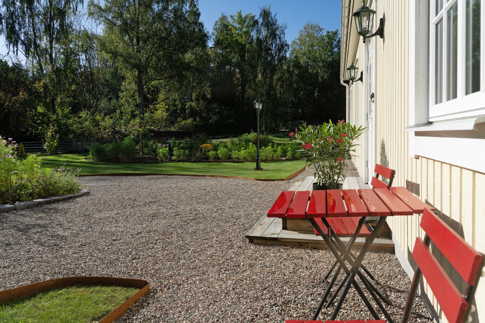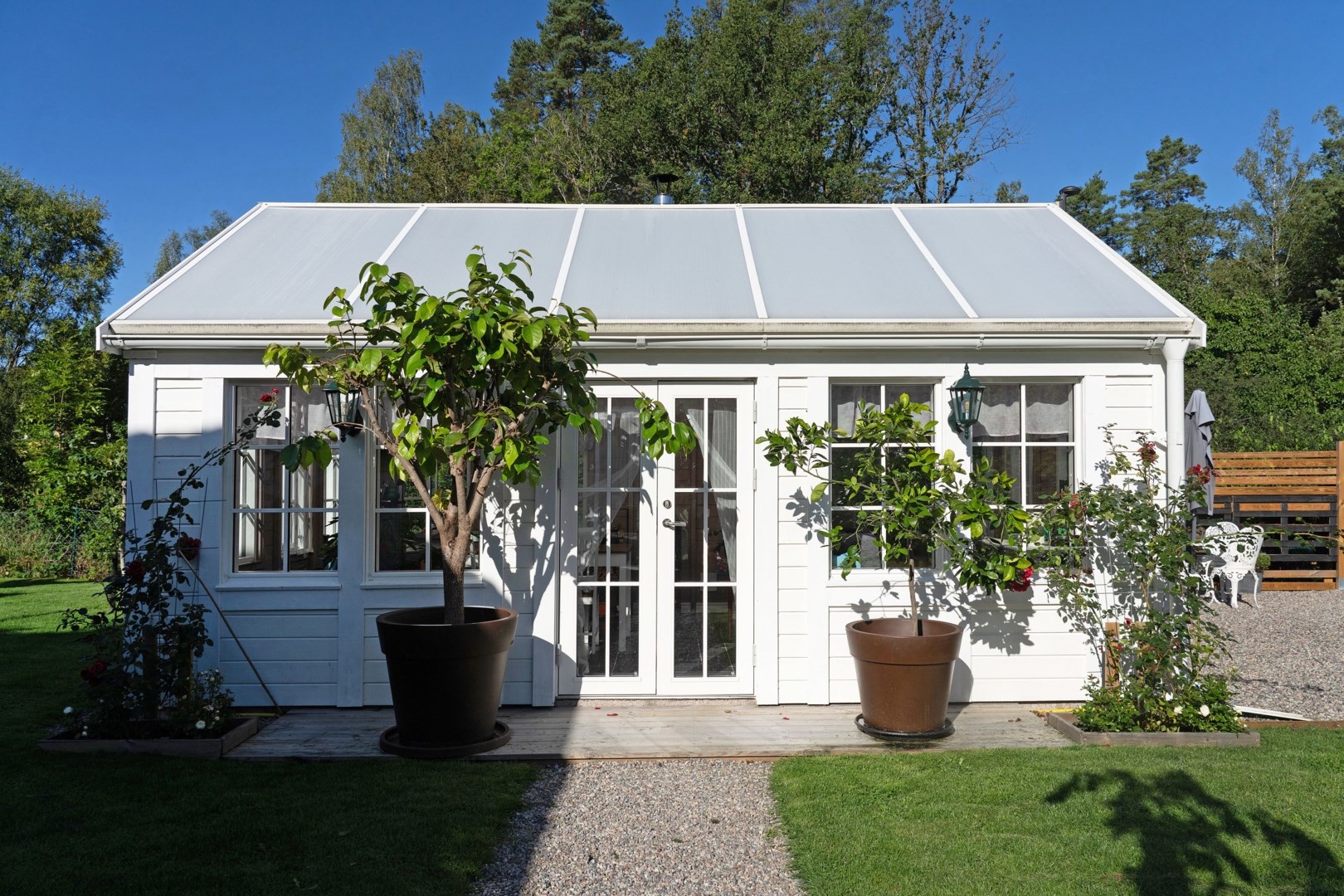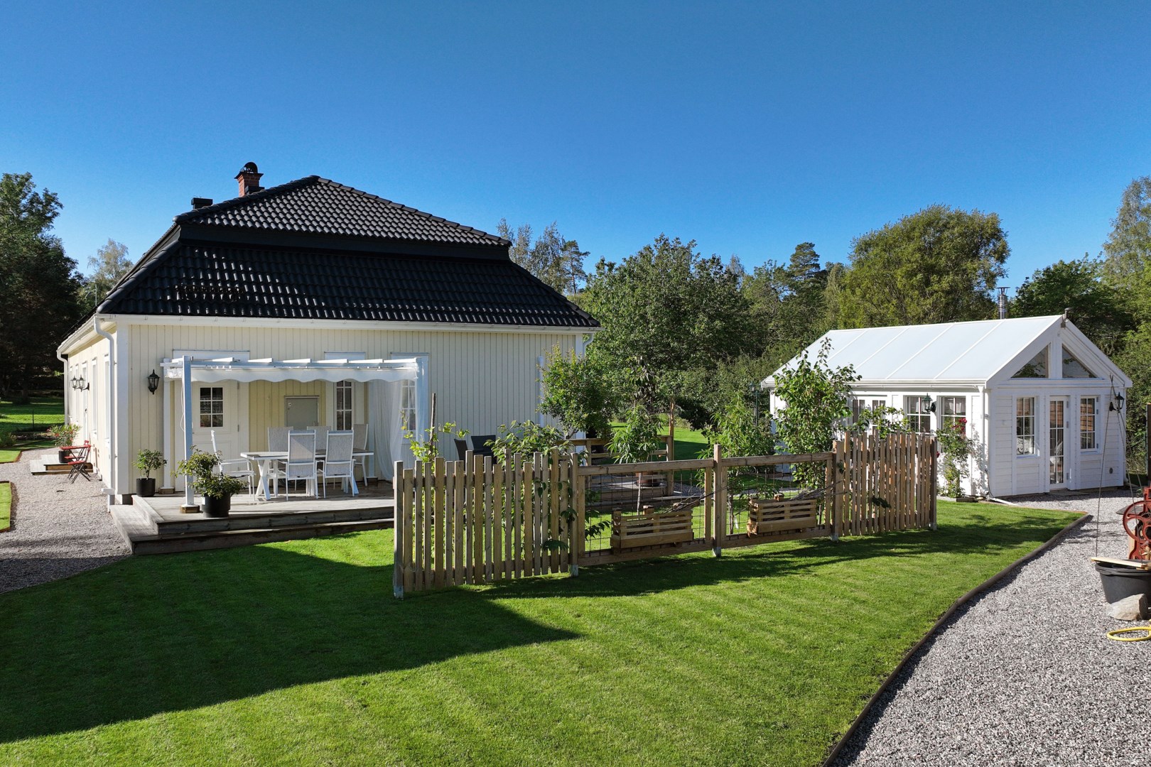 Trädgårdstomten är generös, om över 2000 kvm, och mycket välskött. Här finns stora, plana gräsytor som ramas in med kantavskiljare mot de grusade partierna. Fastigheten omges av ett staket med järngrind vid infarten. Flera fina planteringar är placerade runt om i trädgården. För den odlingsintresserade har trädgården inhägnade odlingsbäddar samt en väl tilltagen växthustunnel. På tomten finns även ett inrett orangeri med klinkergolv samt vedkamin och målad träpanel som passar för avkoppling, mysiga middagar eller för en pausfika. Trädgården erbjuder flera olika sorters äpplen i den trevliga och uppväxande äppellunden. Robotgräsklippare som styrs med gps sköter gräsmattan på ett bekvämt sätt. Lantliga utomhuslampor ger god belysning på både uppfarten och runt om på tomten.