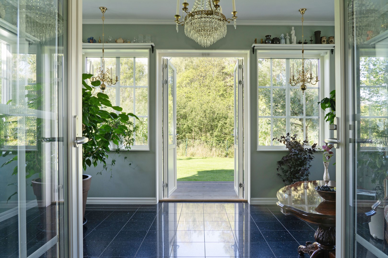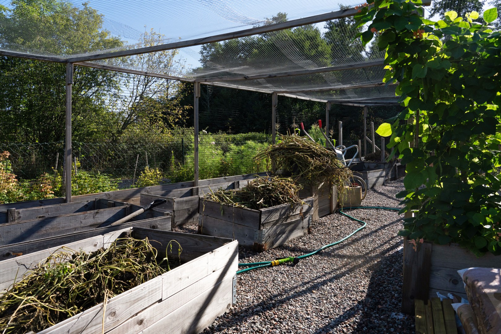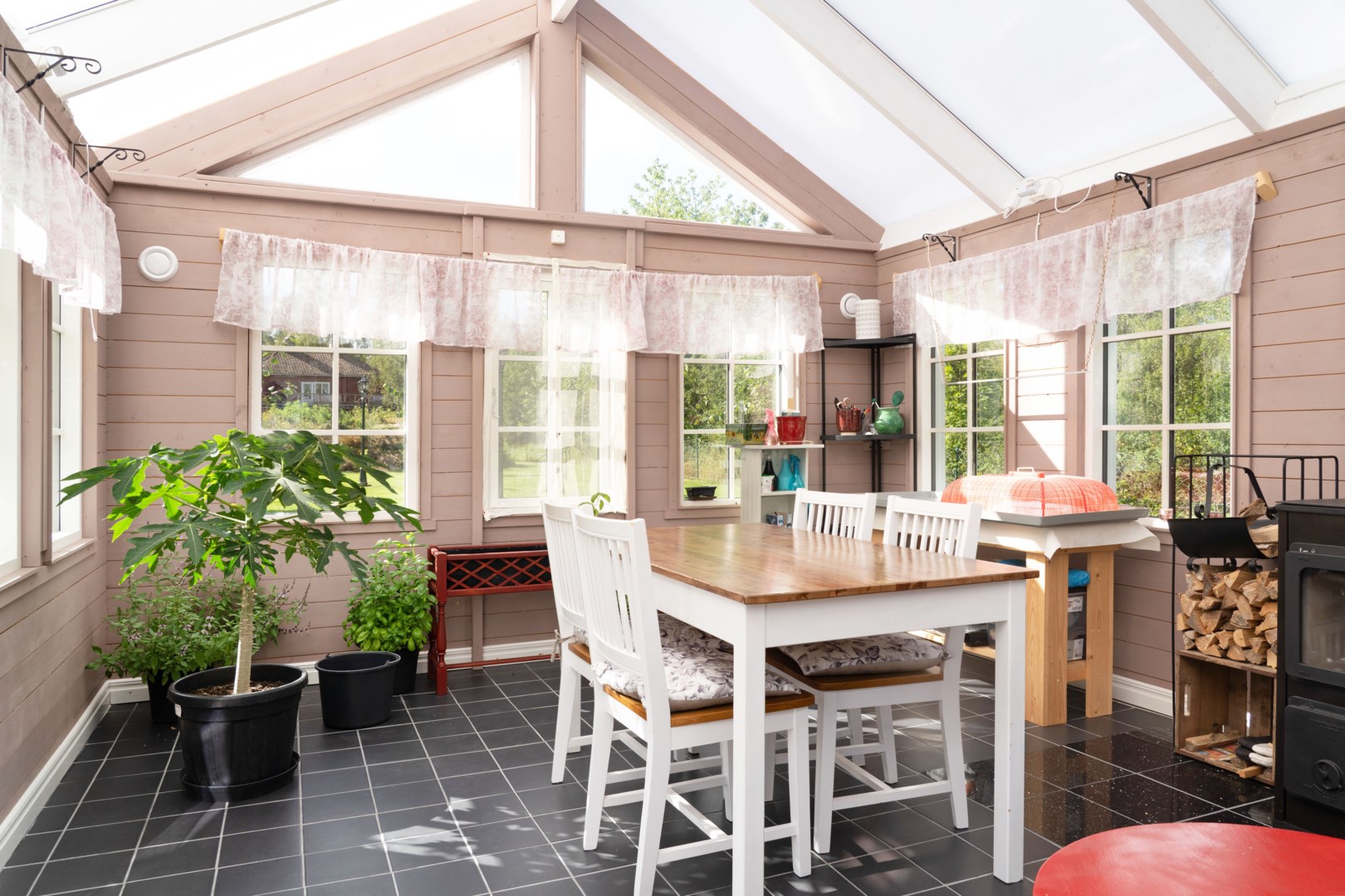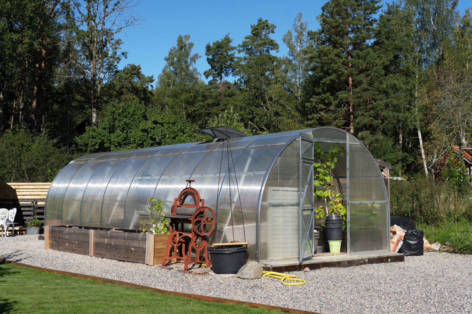 Trädgårdstomten är generös, om över 2000 kvm, och mycket välskött. Här finns stora, plana gräsytor som ramas in med kantavskiljare mot de grusade partierna. Fastigheten omges av ett staket med järngrind vid infarten. Flera fina planteringar är placerade runt om i trädgården. För den odlingsintresserade har trädgården inhägnade odlingsbäddar samt en väl tilltagen växthustunnel. På tomten finns även ett inrett orangeri med klinkergolv samt vedkamin och målad träpanel som passar för avkoppling, mysiga middagar eller för en pausfika. Trädgården erbjuder flera olika sorters äpplen i den trevliga och uppväxande äppellunden. Robotgräsklippare som styrs med gps sköter gräsmattan på ett bekvämt sätt. Lantliga utomhuslampor ger god belysning på både uppfarten och runt om på tomten.