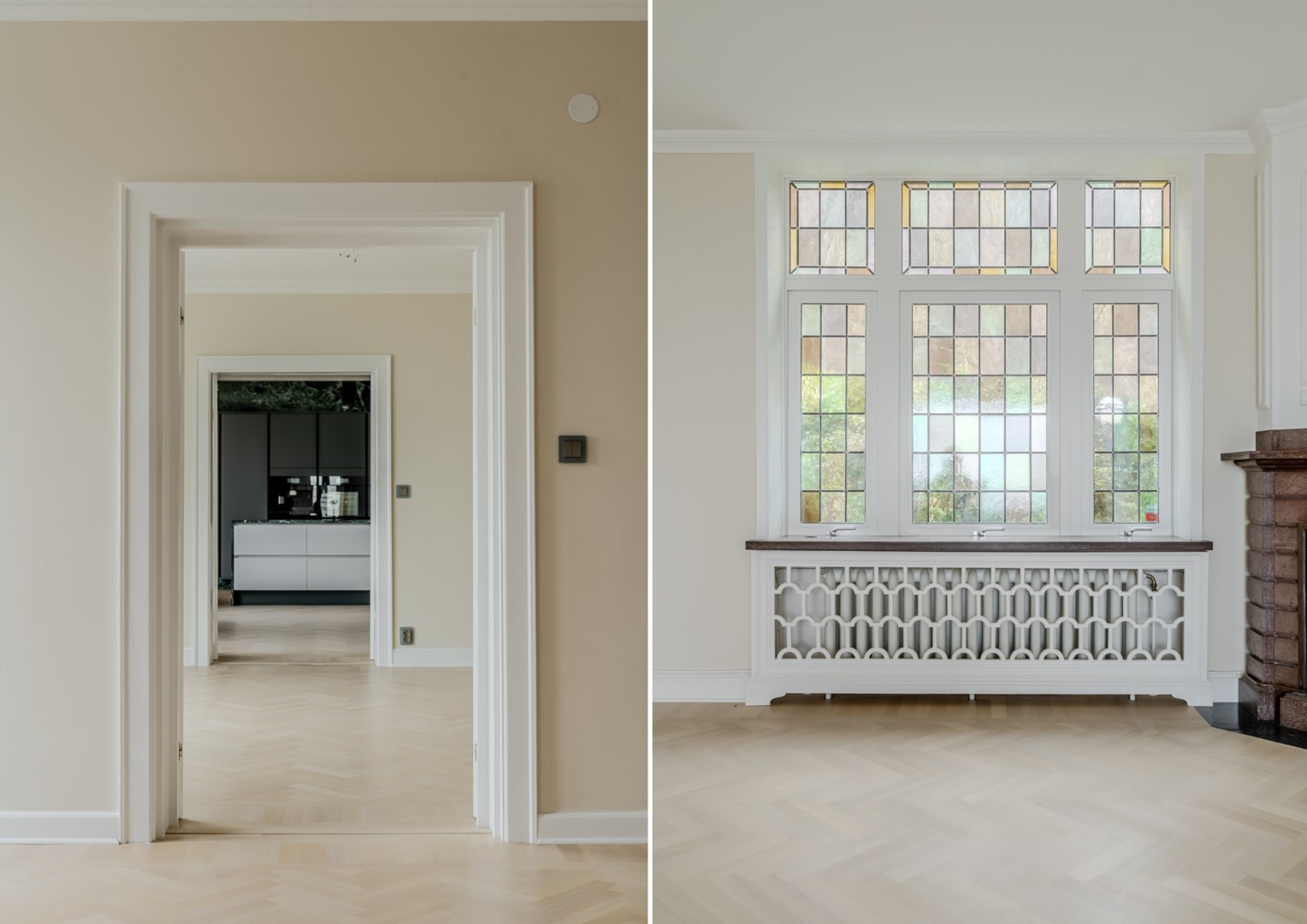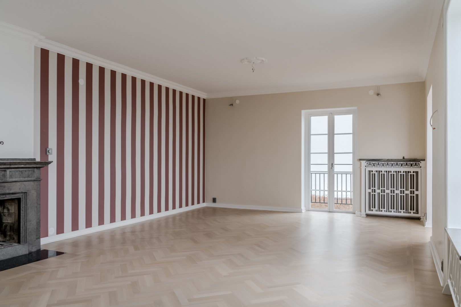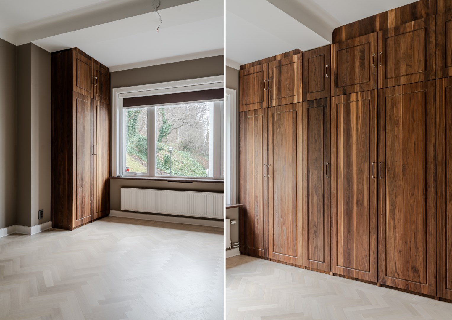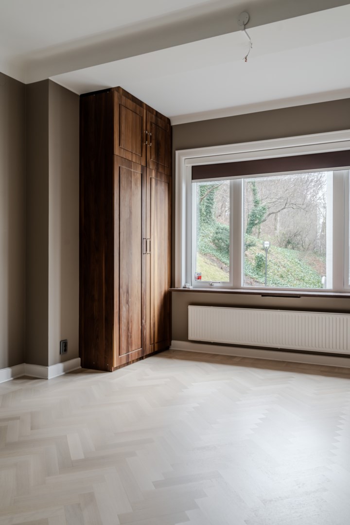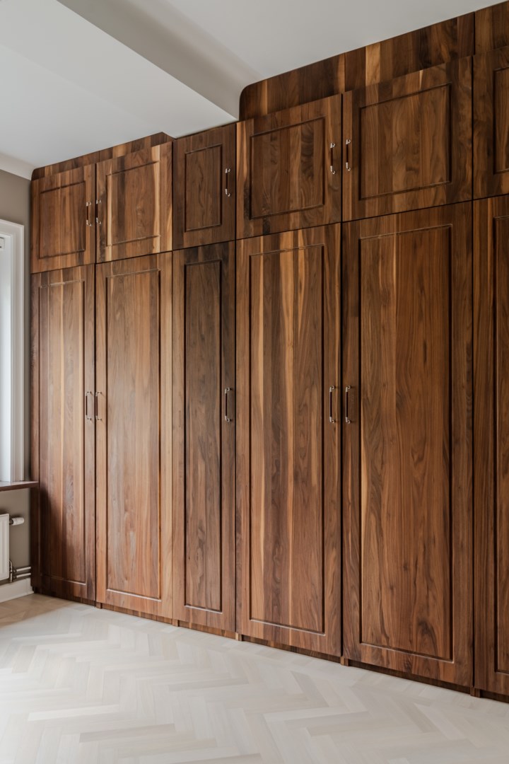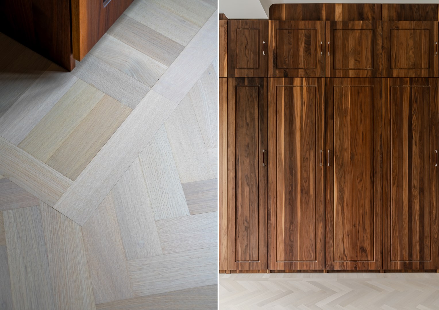 Våningen har genomgått en omfattande renovering där golven är klädda i elegant fiskbensparkett från Bjelin, vilket skapar en varm och sofistikerad känsla genom hela bostaden. De platsbyggda garderoberna i massiv valnöt är skräddarsydda för att skiljas från det normala samtidigt erbjuda generös förvaring i ett utförande som harmonierar med hemmets övriga exklusiva interiör.