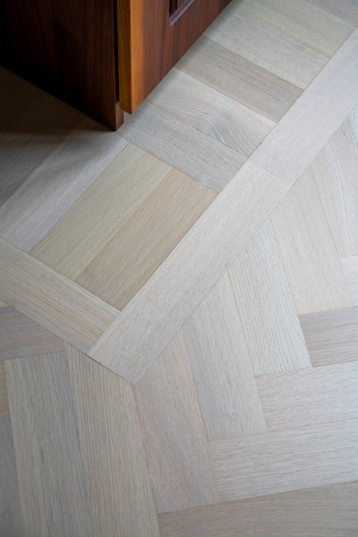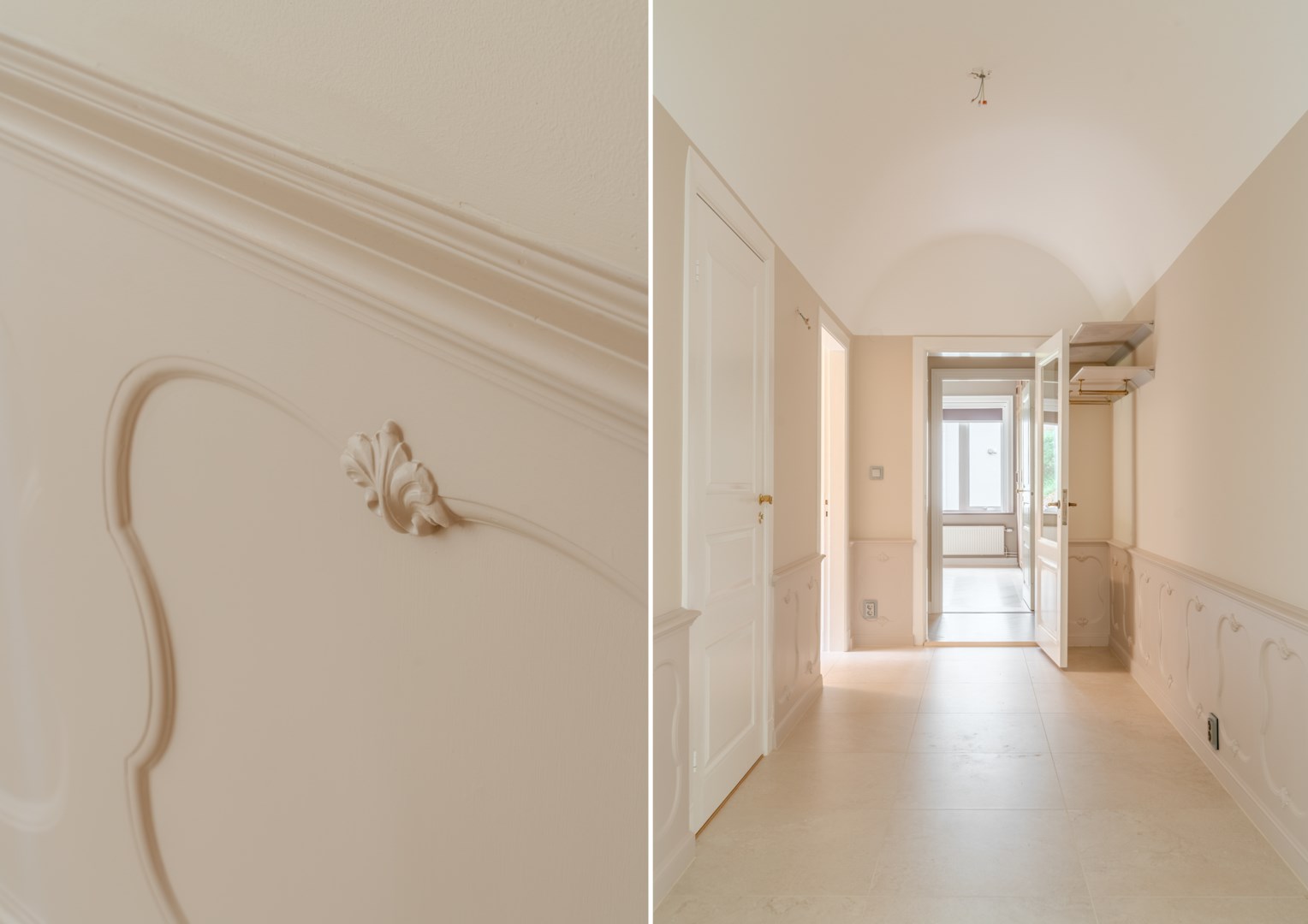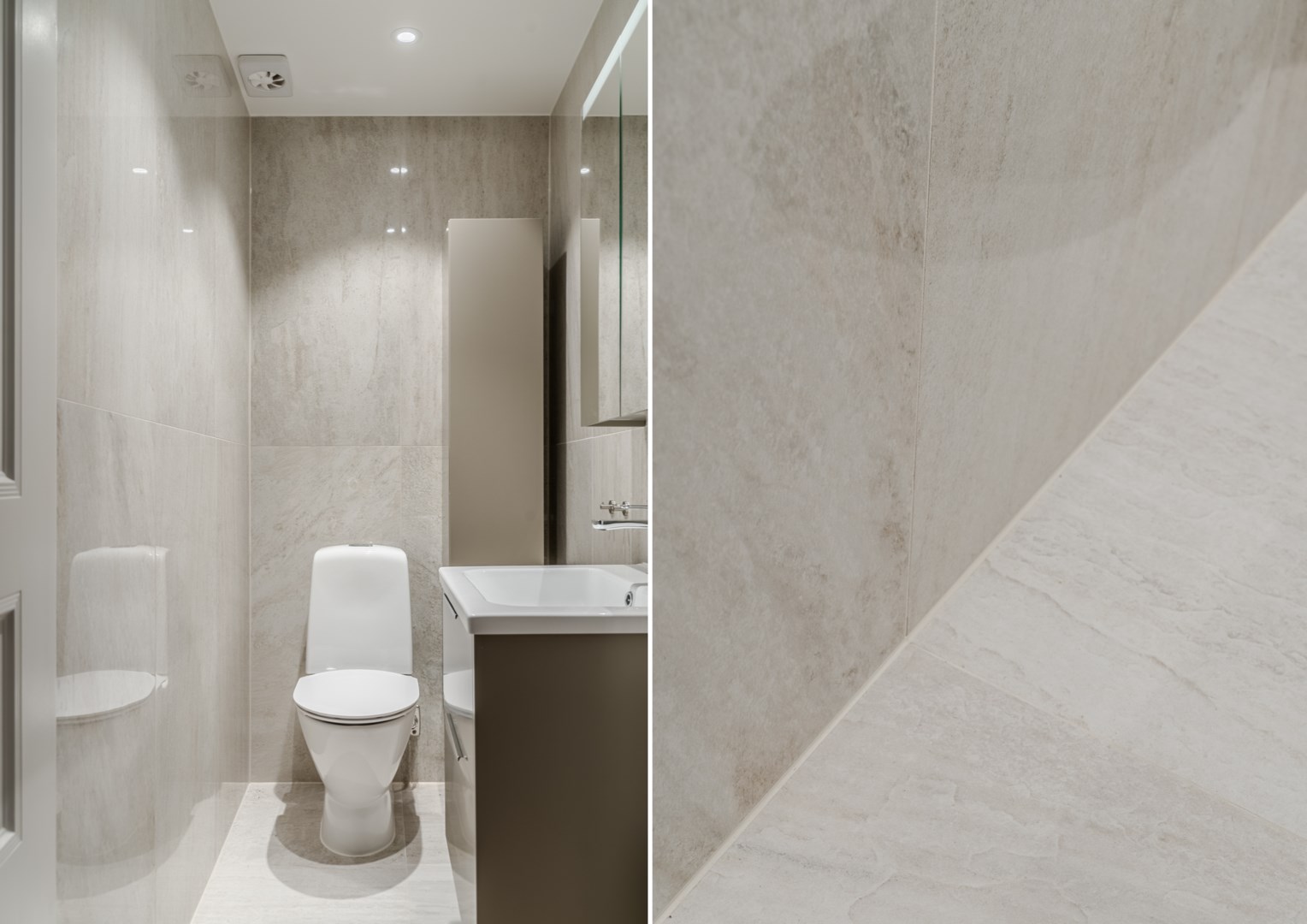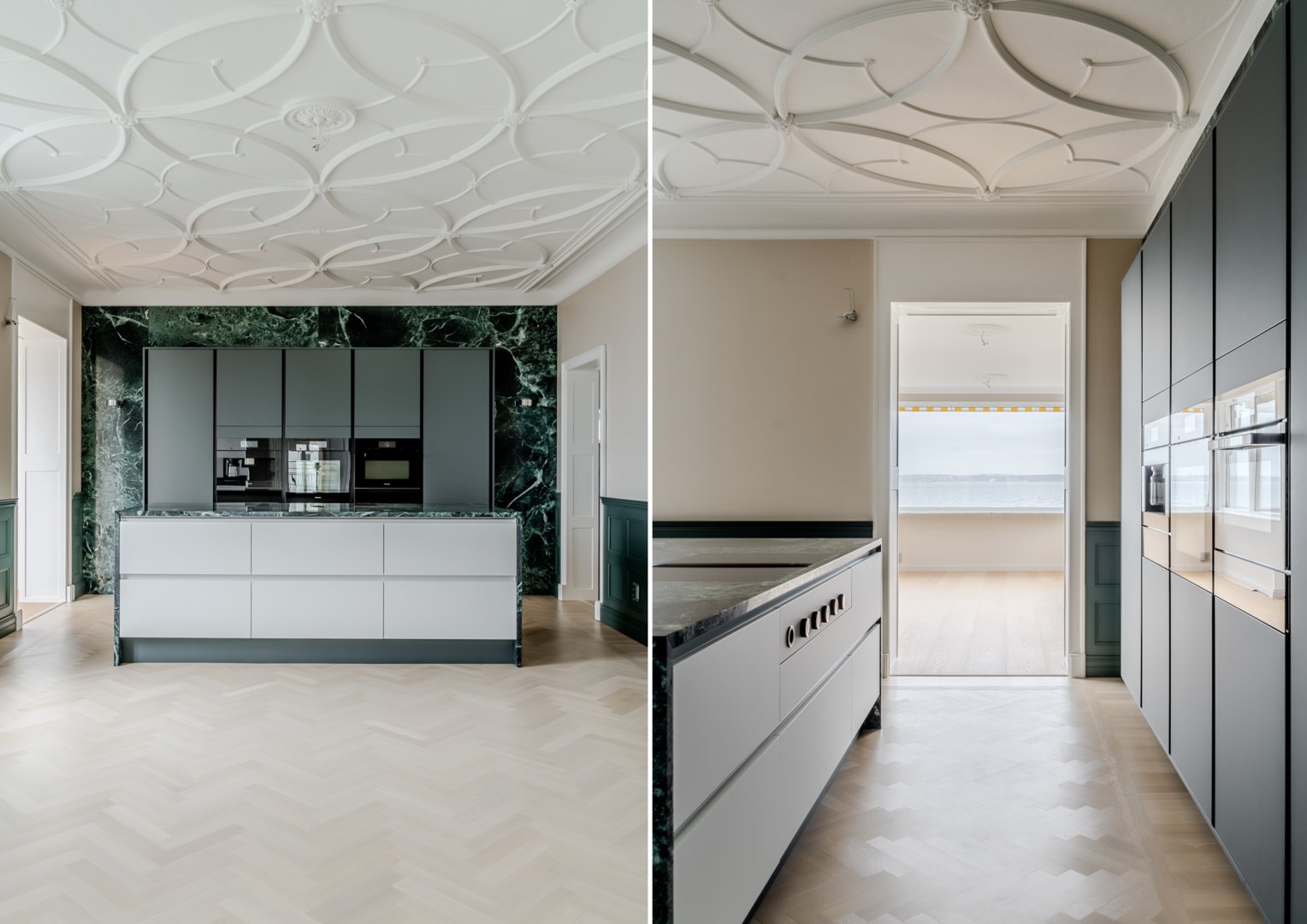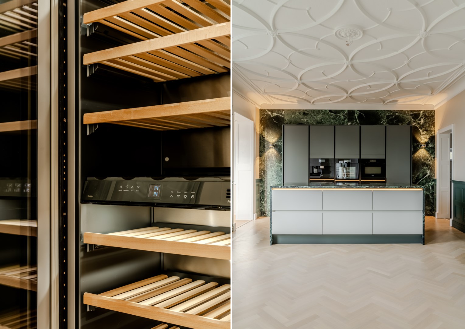 Våningen har genomgått en omfattande renovering där golven är klädda i elegant fiskbensparkett från Bjelin, vilket skapar en varm och sofistikerad känsla genom hela bostaden. De platsbyggda garderoberna i massiv valnöt är skräddarsydda för att skiljas från det normala samtidigt erbjuda generös förvaring i ett utförande som harmonierar med hemmets övriga exklusiva interiör.