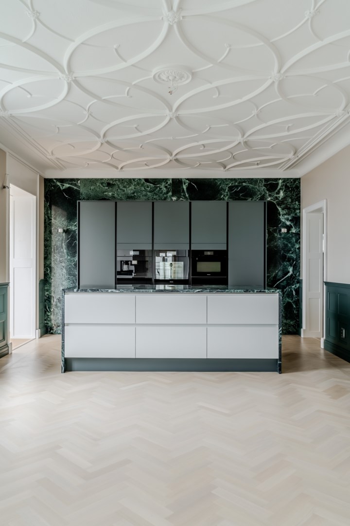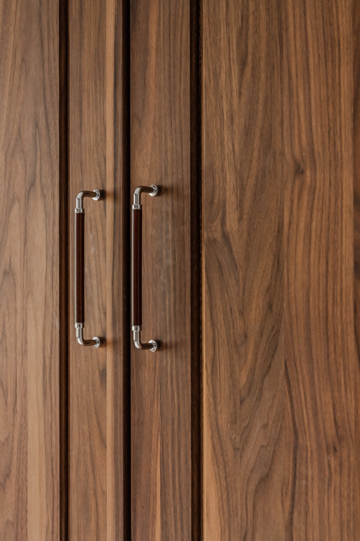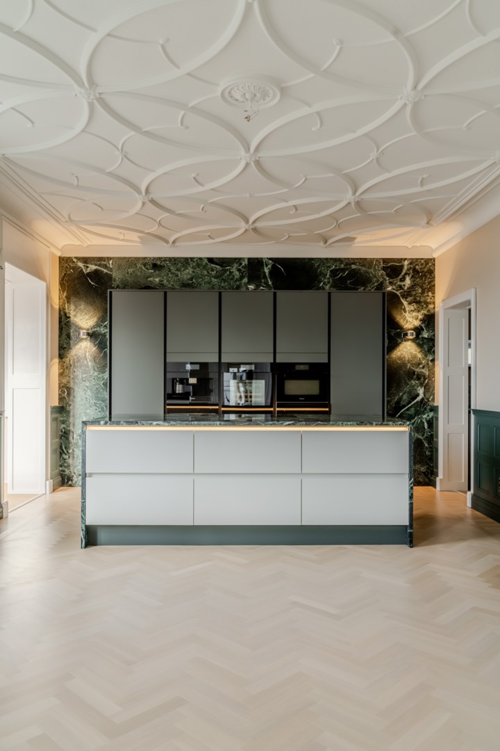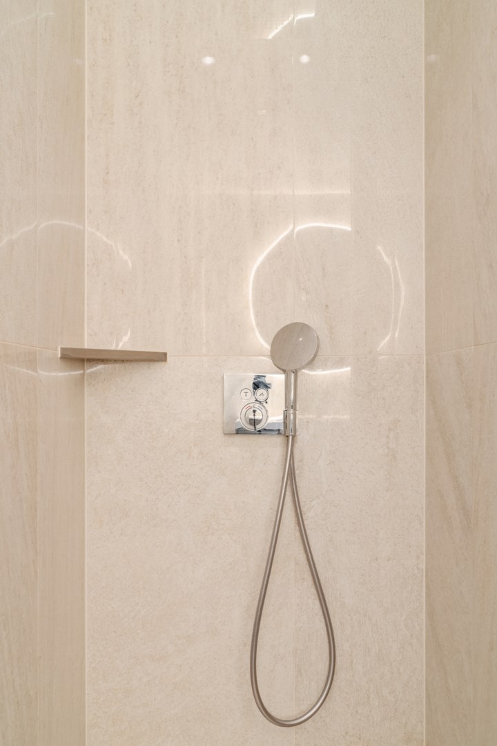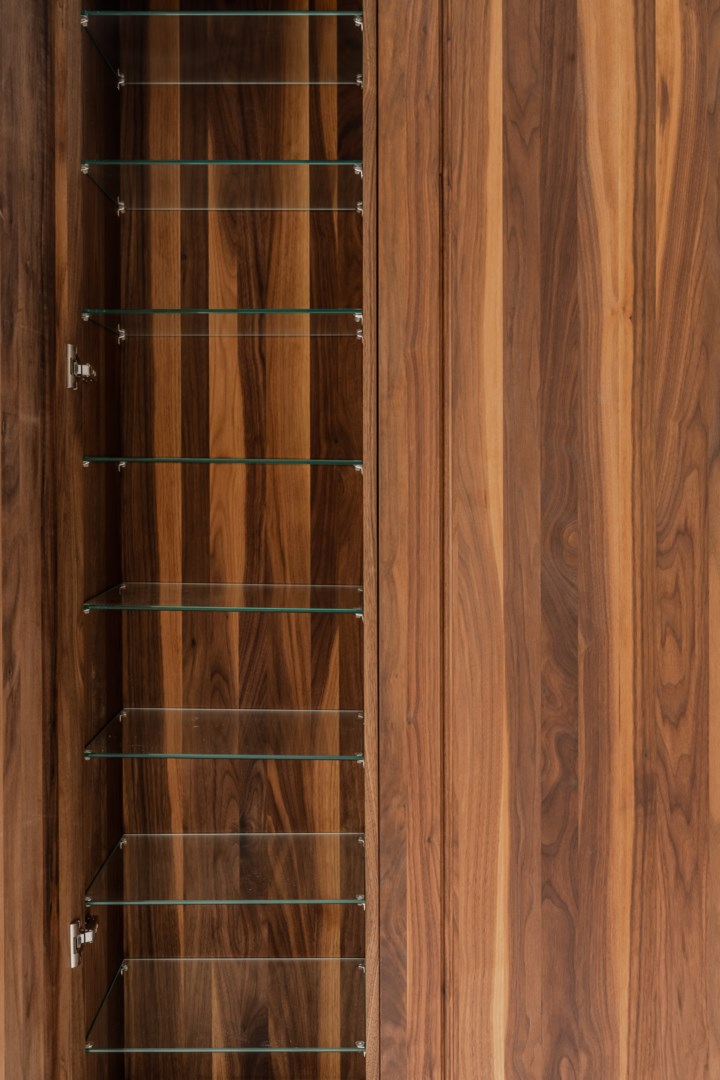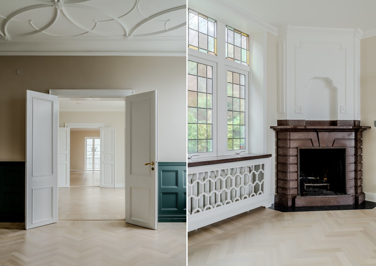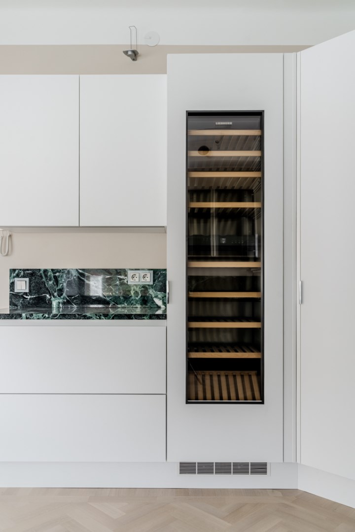 Våningen har genomgått en omfattande renovering där golven är klädda i elegant fiskbensparkett från Bjelin, vilket skapar en varm och sofistikerad känsla genom hela bostaden. De platsbyggda garderoberna i massiv valnöt är skräddarsydda för att skiljas från det normala samtidigt erbjuda generös förvaring i ett utförande som harmonierar med hemmets övriga exklusiva interiör.