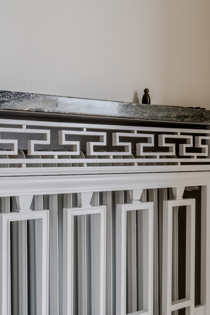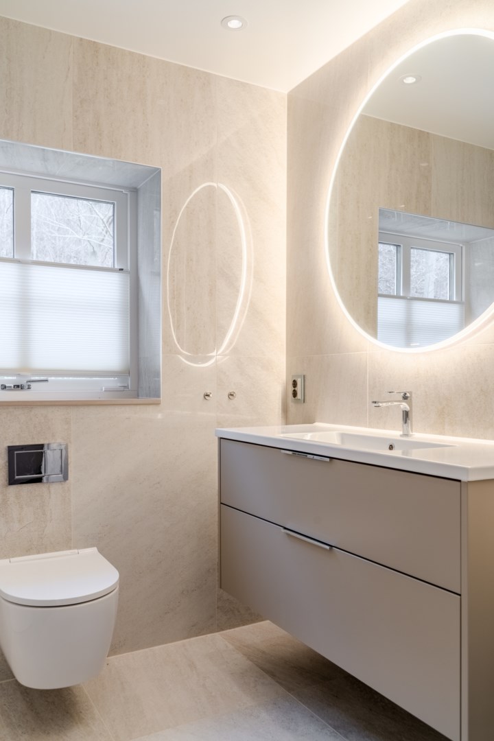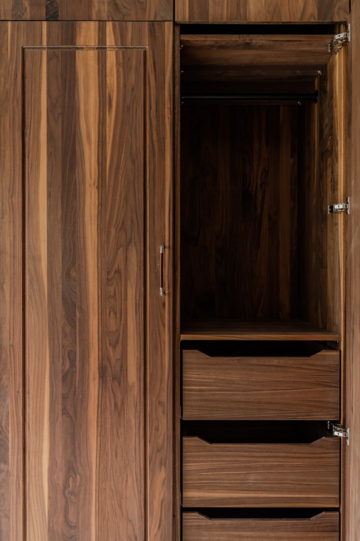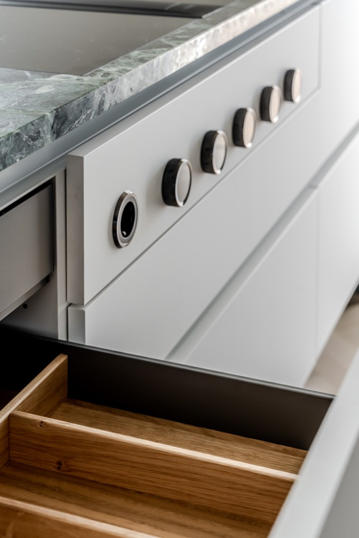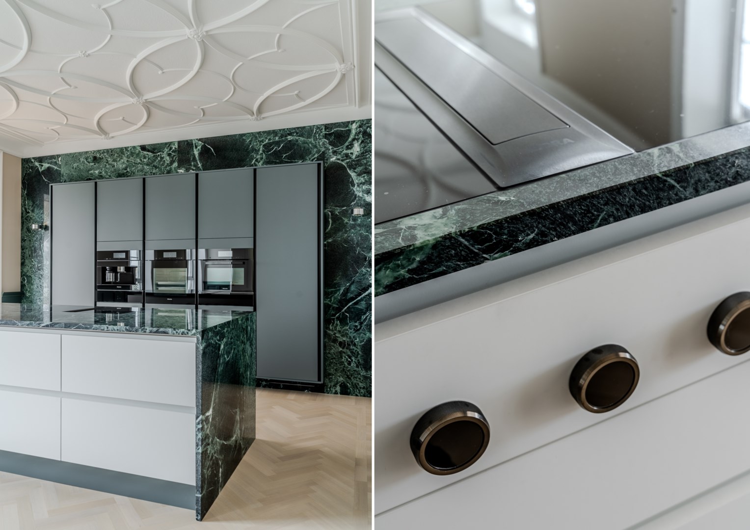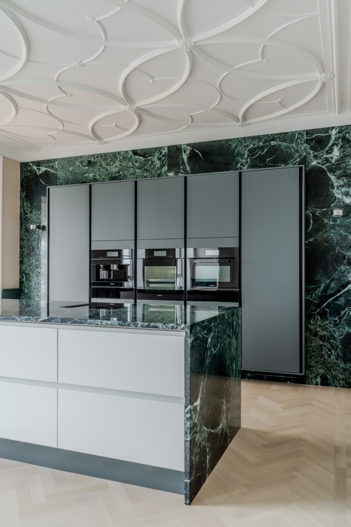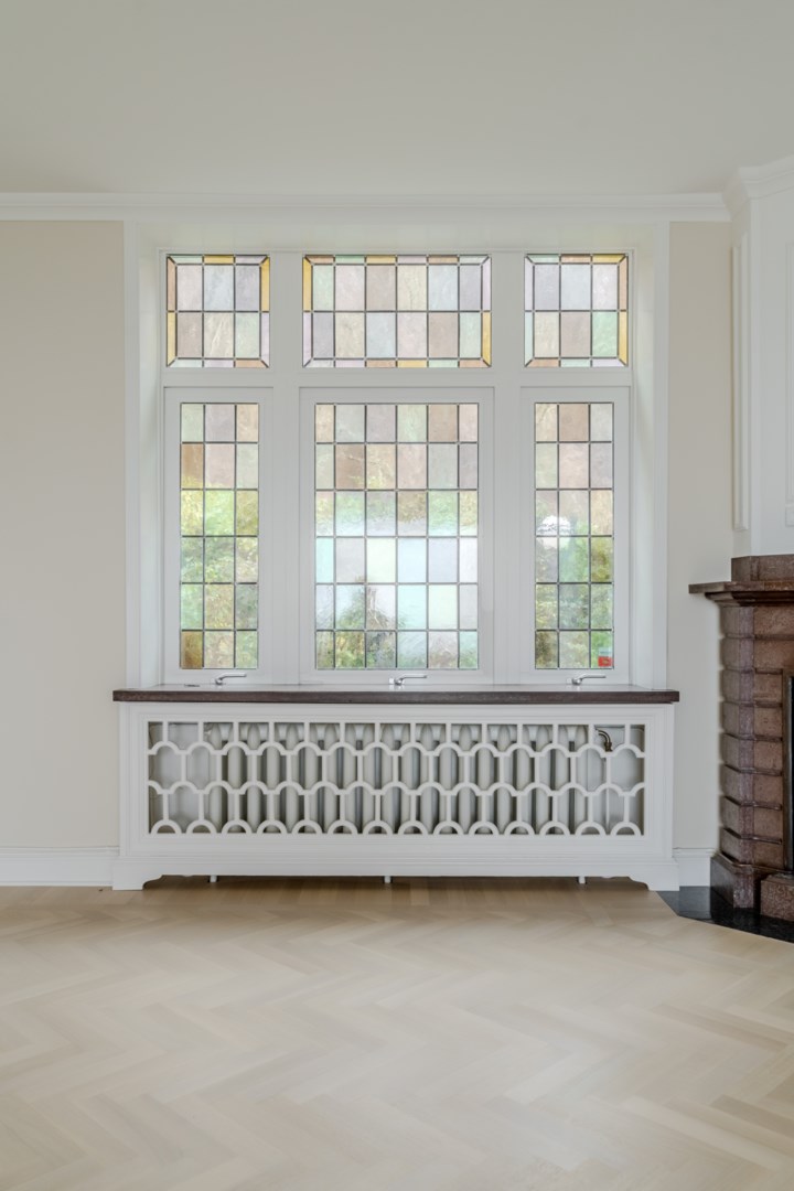 Våningen har genomgått en omfattande renovering där golven är klädda i elegant fiskbensparkett från Bjelin, vilket skapar en varm och sofistikerad känsla genom hela bostaden. De platsbyggda garderoberna i massiv valnöt är skräddarsydda för att skiljas från det normala samtidigt erbjuda generös förvaring i ett utförande som harmonierar med hemmets övriga exklusiva interiör.