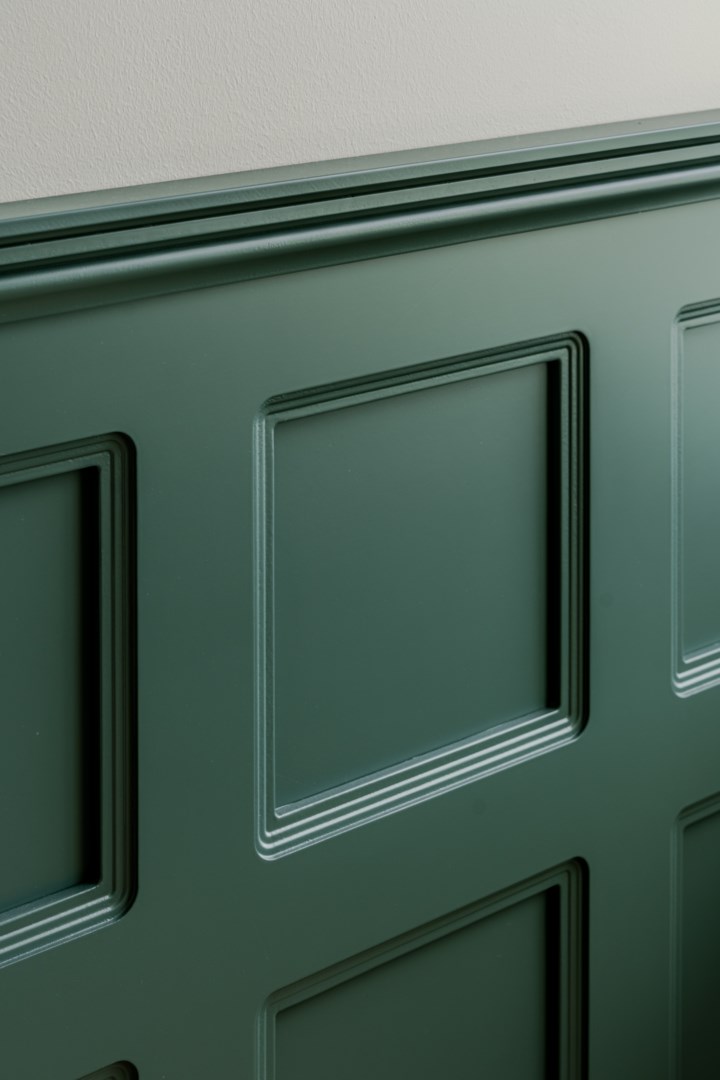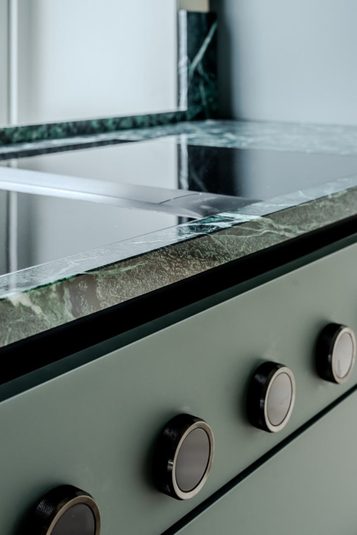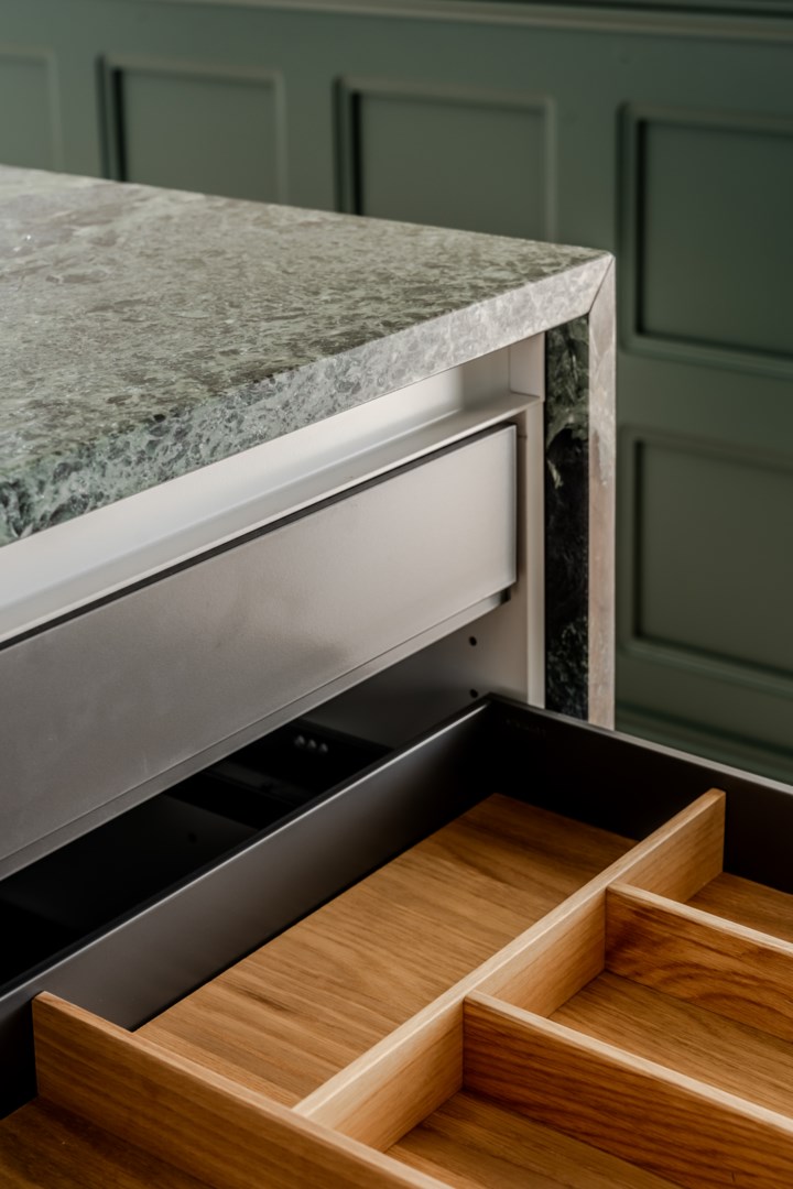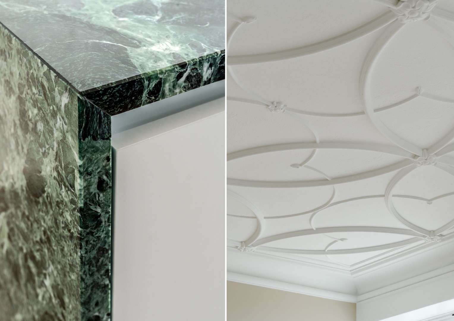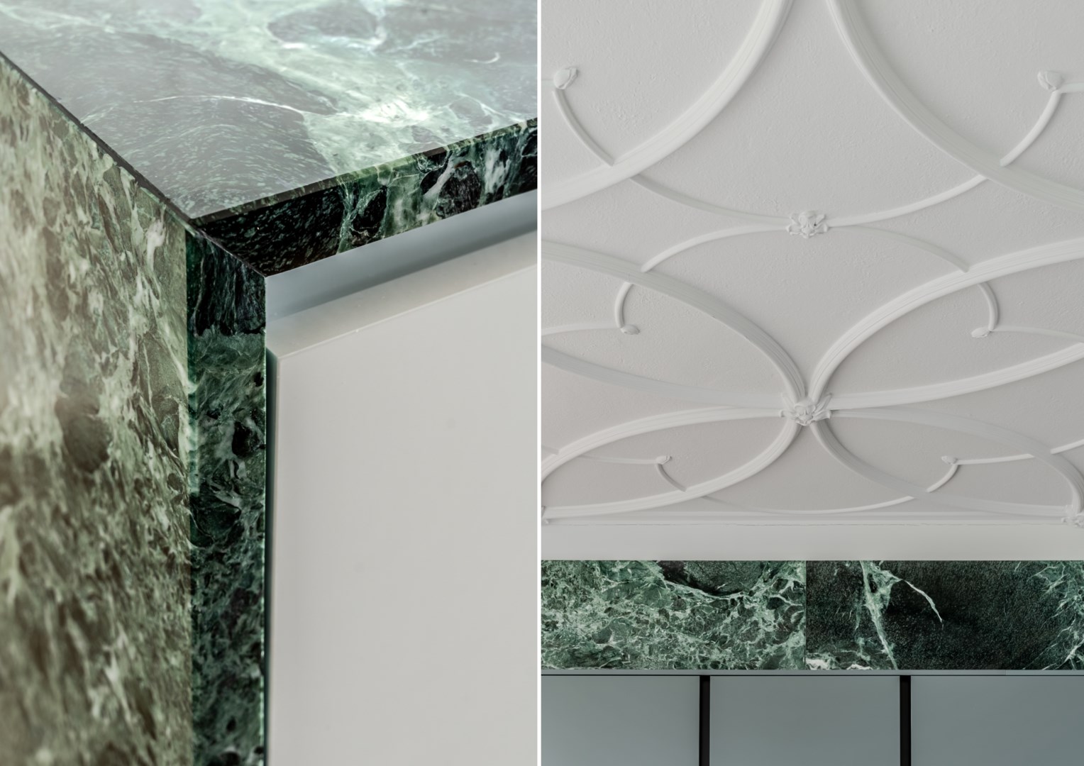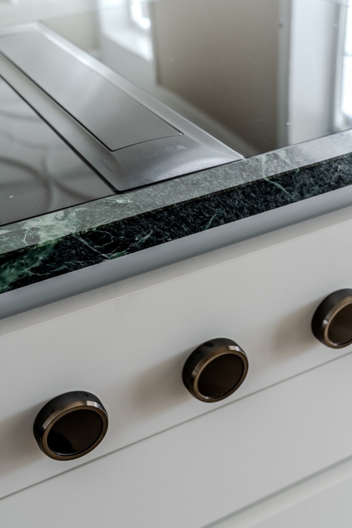 Våningen har genomgått en omfattande renovering där golven är klädda i elegant fiskbensparkett från Bjelin, vilket skapar en varm och sofistikerad känsla genom hela bostaden. De platsbyggda garderoberna i massiv valnöt är skräddarsydda för att skiljas från det normala samtidigt erbjuda generös förvaring i ett utförande som harmonierar med hemmets övriga exklusiva interiör.