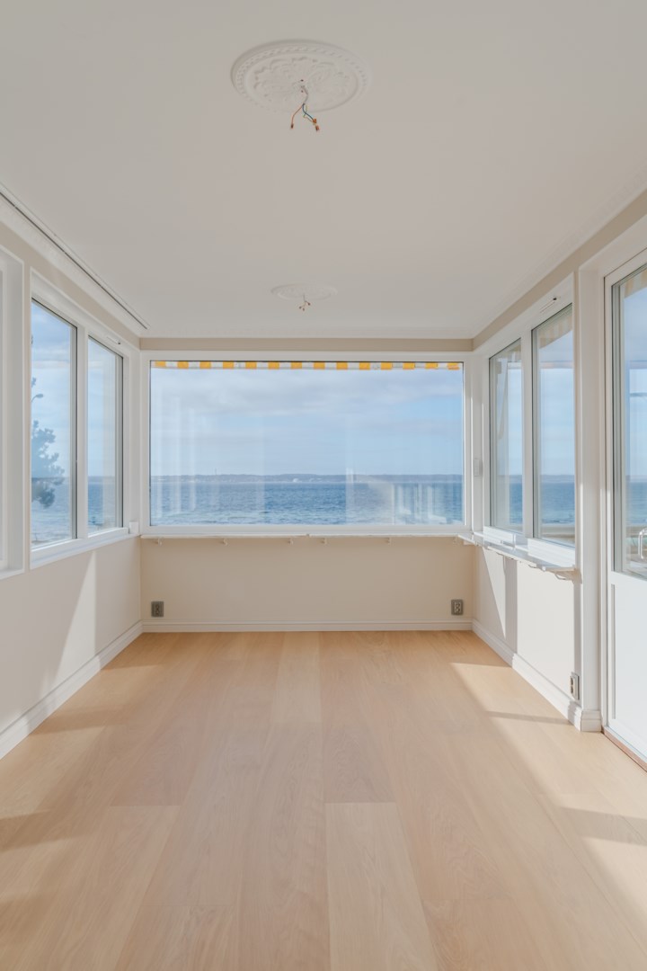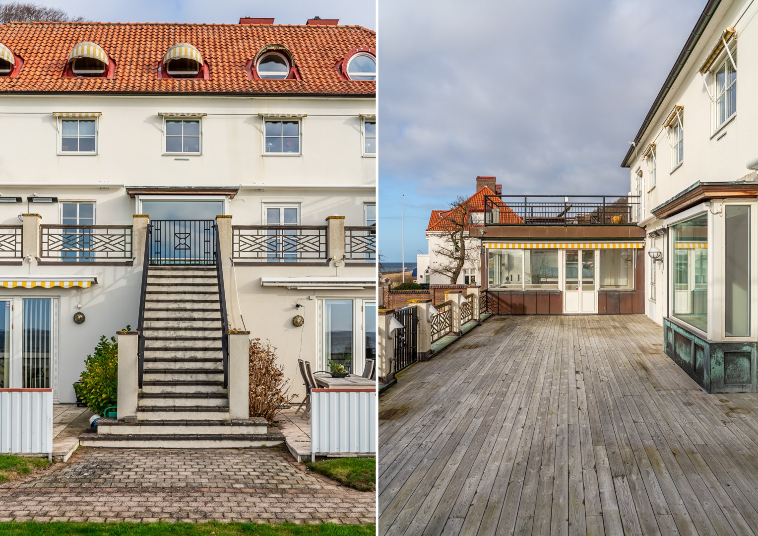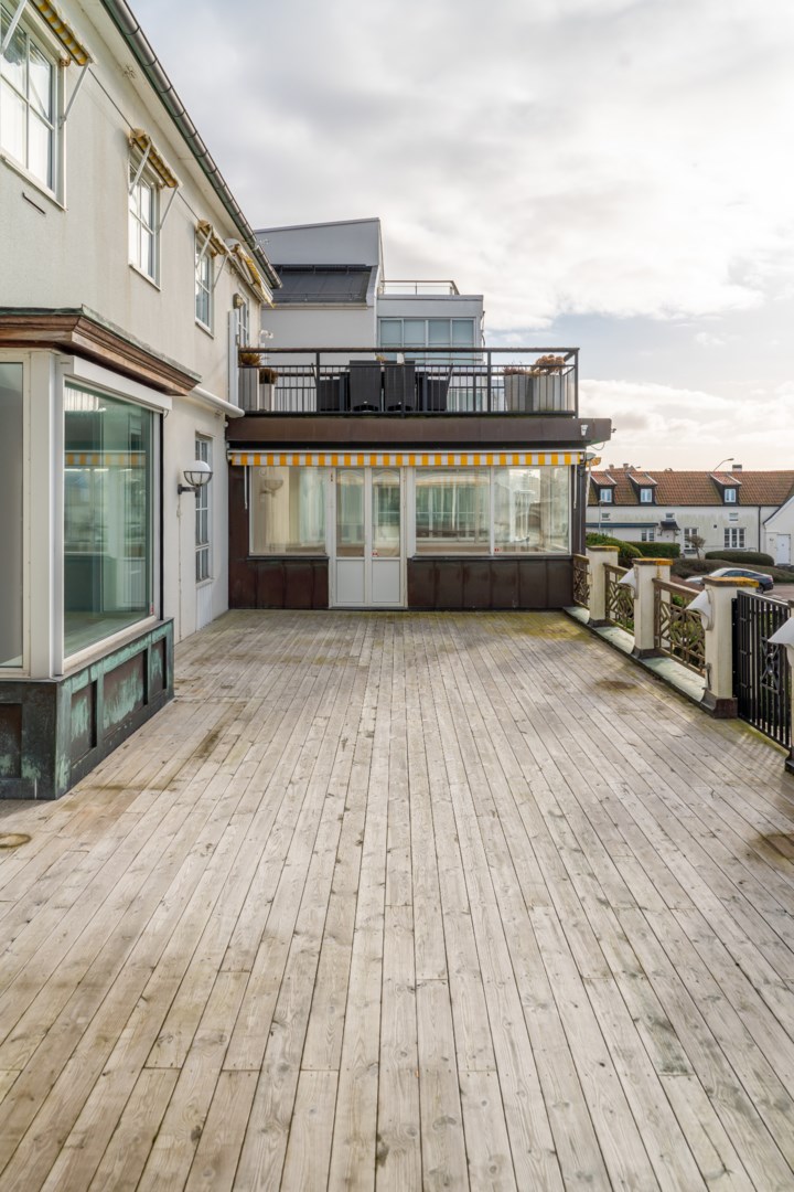 Två inglasade, isolerade verandor med golvvärme skapar ett harmoniskt samspel mellan interiör och exteriör och erbjuder en naturlig plats att ta in den ständigt närvarande utsikten över Öresund och vidare mot Danmark. Från våningens södra veranda har man direkt access till salongen eller terrassen, medan den andra verandan nås från matsalsköket, vilket förstärker våningens unika planlösning. Det är dock den generösa terrassen som utgör bostadens absoluta kronjuvel, en plats där havet blir en förlängning av hemmet och där Helsingborgs mest spektakulära vyer ramar in en tillvaro utöver det vanliga. Två parkeringsplatser, inkluderade i avgiften, säkerställer smidig tillgång till bostaden, medan ett tillhörande förråd och cykelförråd erbjuder praktiska förvaringslösningar.