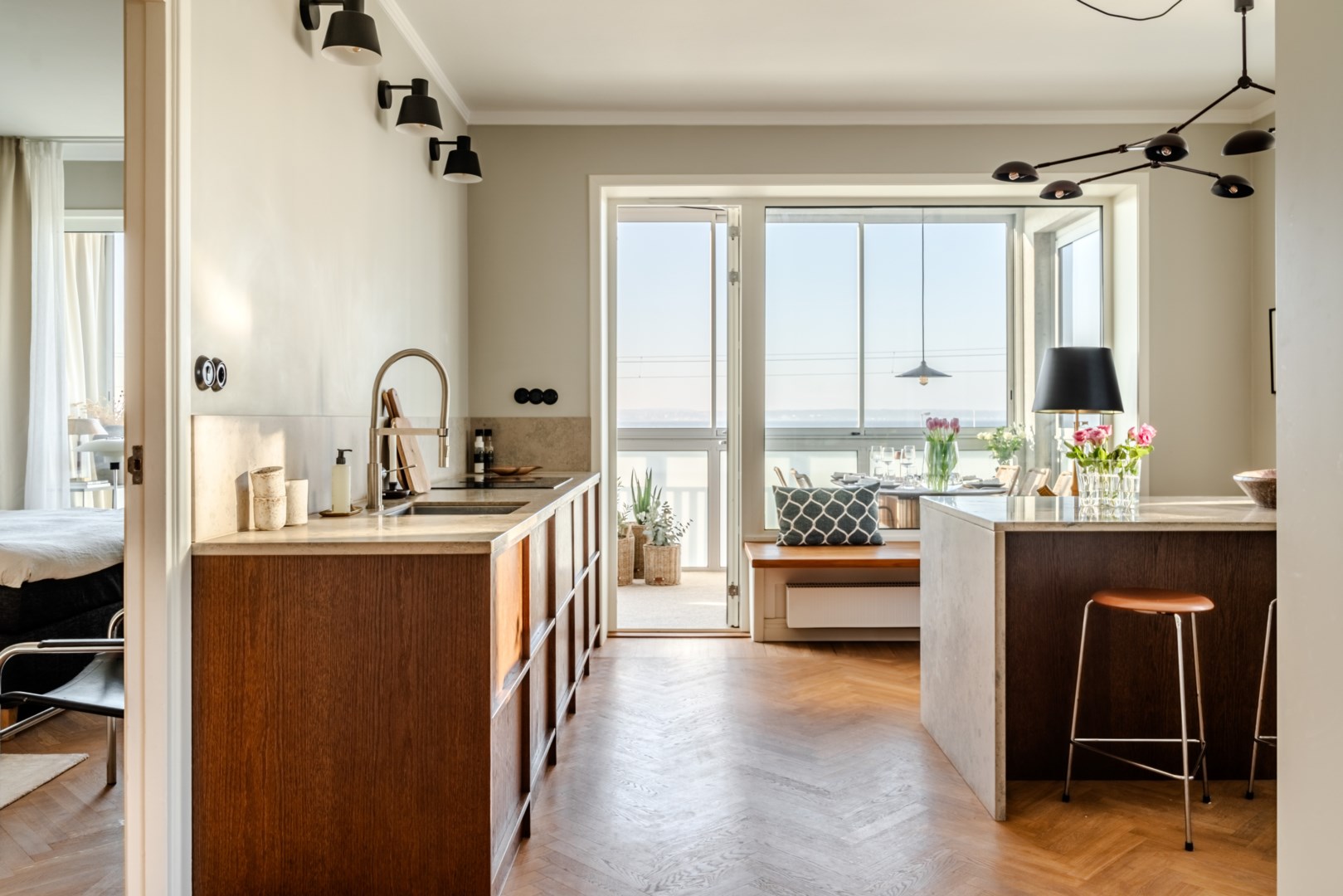 Sällskapsrummet präglas av ljus från stora fönsterpartier tack vare sitt unika hörnläge, med fiskbensparkett och en öppen spis. Från köket nås den generösa balkongen med fri vy mot Öresund, där havet blir en naturlig del av vardagen. Balkongen är utformad för ett aktivt nyttjande med plats för både middagar, loungemöbler och växtlighet året runt tack vare golvvärme.