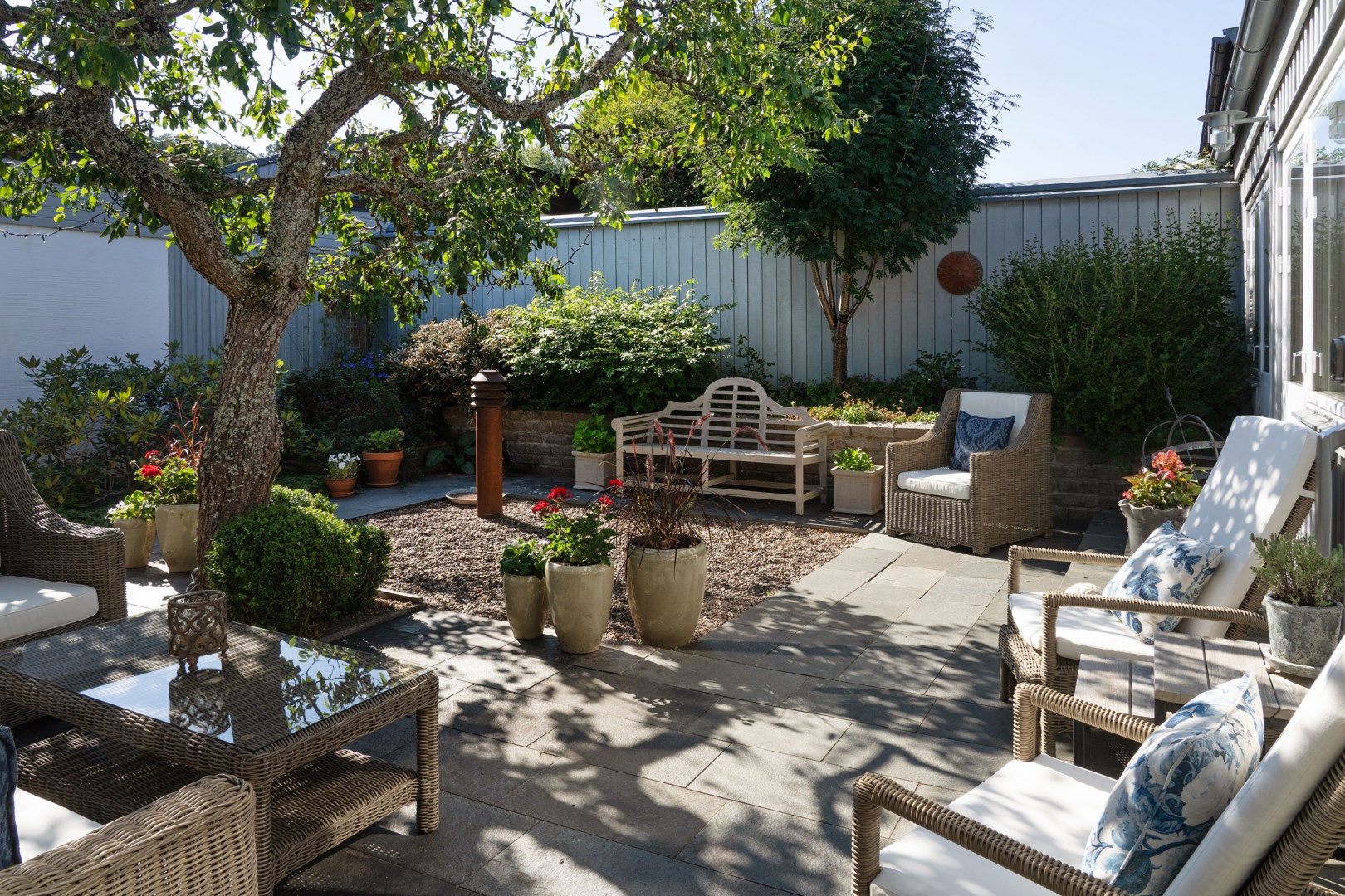 Den uppvuxna trädgården är en grön oas med vackra och lättskötta planteringar, buskar och plommonträd. Här njuter man av sol från morgon till kväll. Trädgården nås från vardagsrummet, två av sovrummen samt från garaget. Belysningen är från Louis Poulsen.