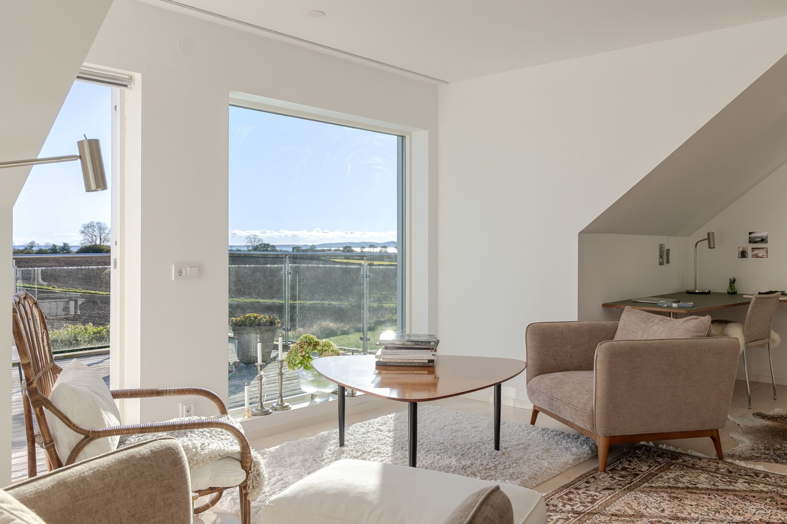 På övre plan finns två rymliga sovrum varav ett används som allrum idag. I anslutning till allrummet finns en stor altan med vidsträckt utsikt. På detta plan finns även ett större helkaklat badrum med WC, tvättställ och badkar samt en walk-in-closet.