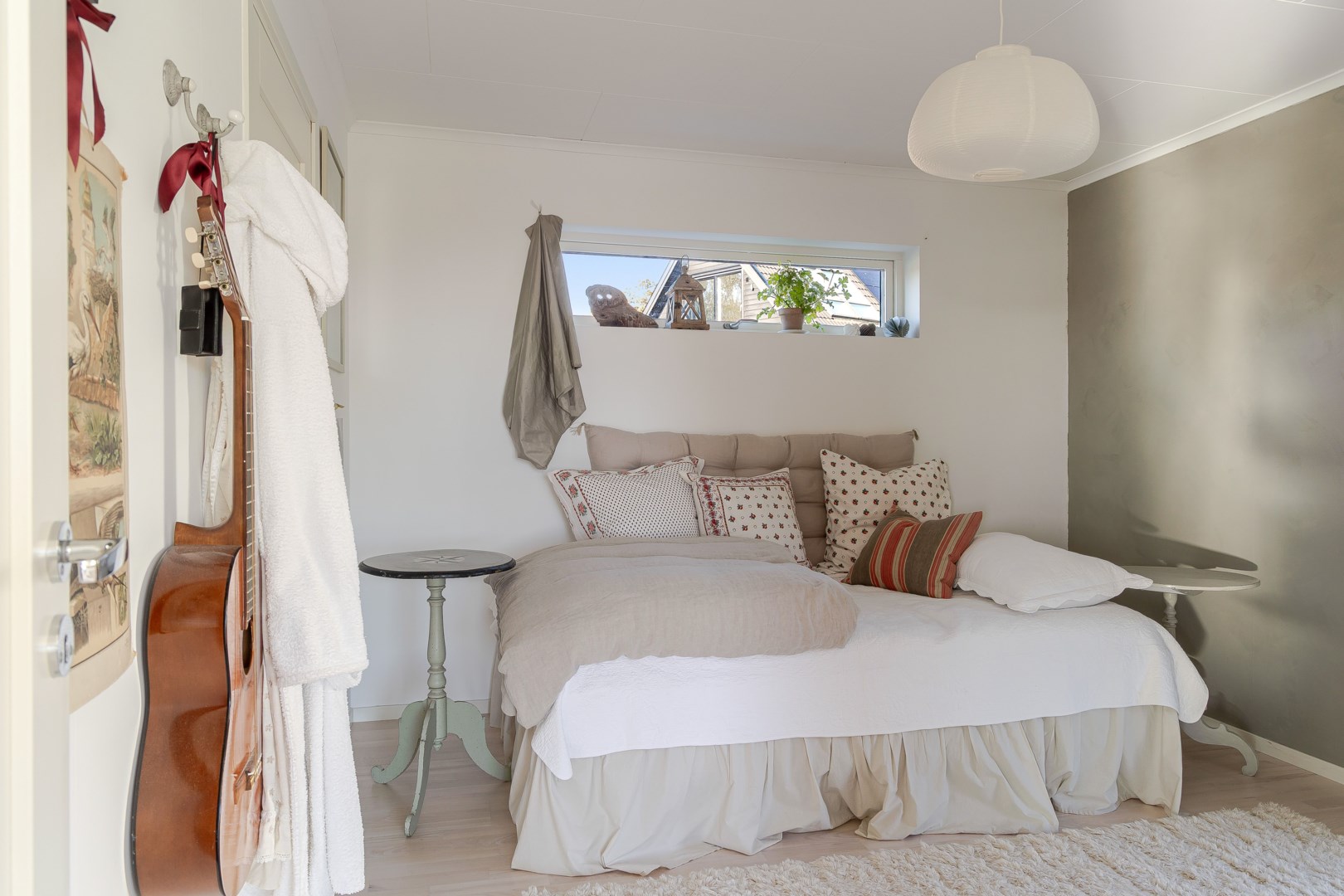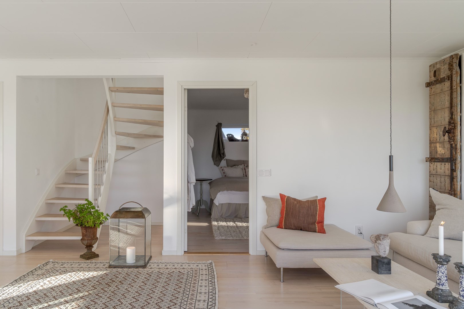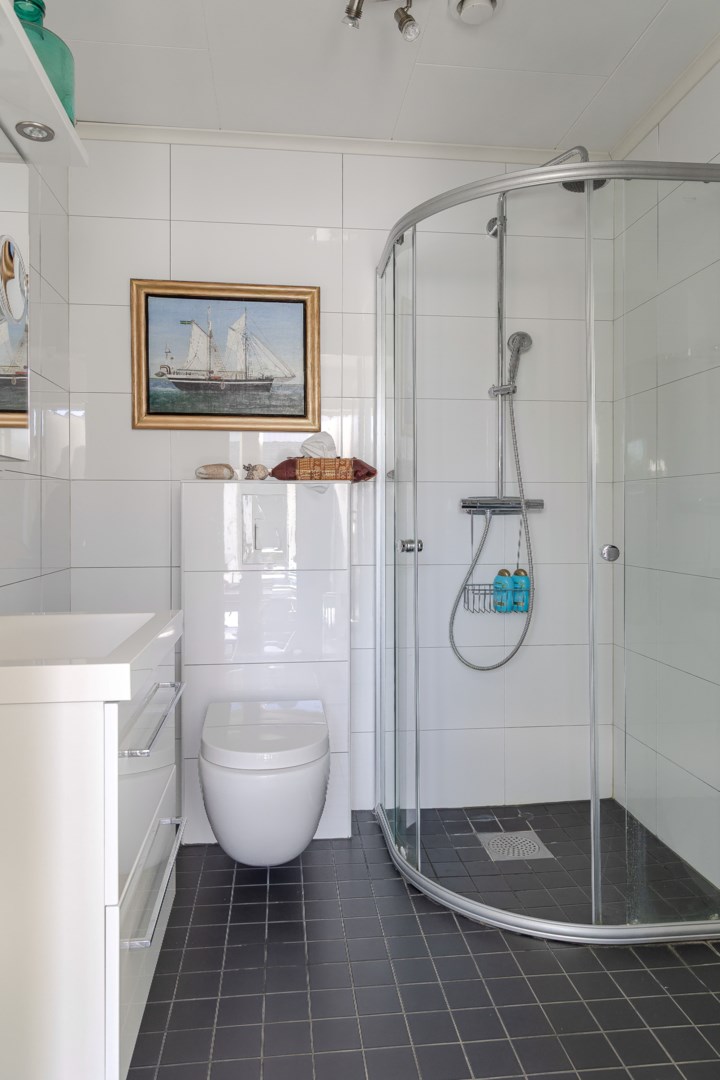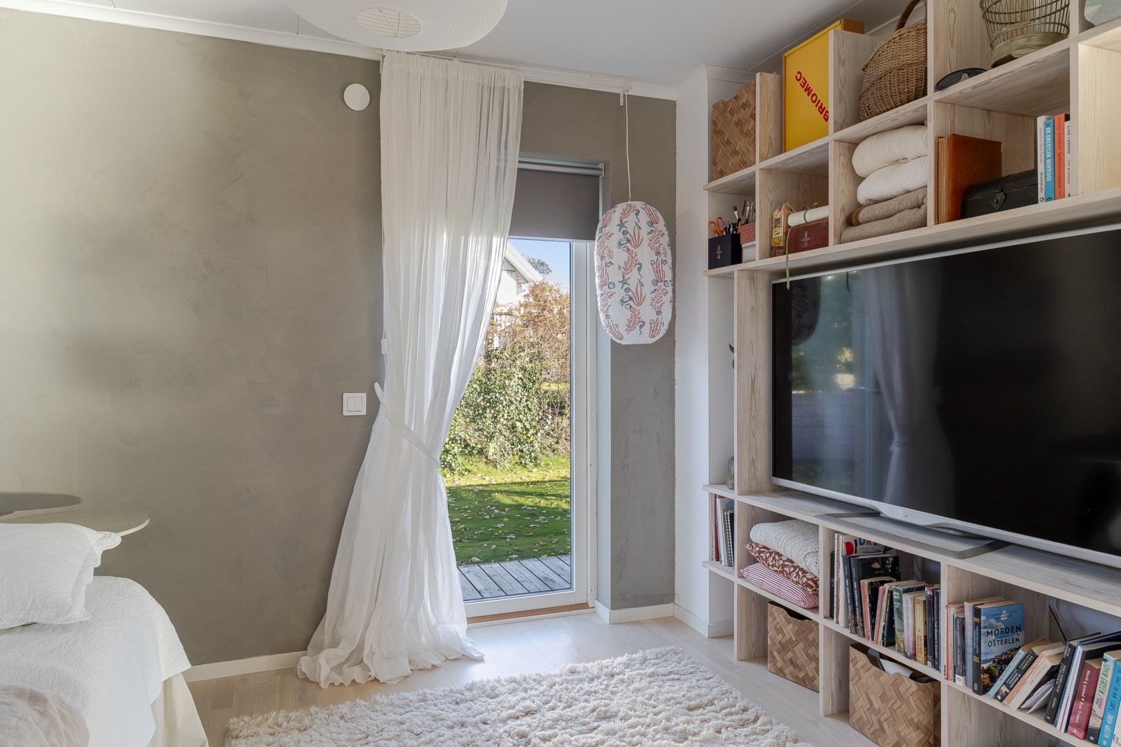 När man kliver in i bostaden möts man av en inbjudande hall med gott om plats för avhängning. Till vänster om hallen ligger ett mindre sovrum och intill detta ett helkaklat badrum med WC, dusch och tvättställ. Till höger om hallen finns köket som går i modern stil och ligger i öppen planlösning mot vardagsrummet. Stora glaspartier med flera utgångar leder ut till trädäcket och trädgården i söder. Intill vardagsrummet ligger tvättrummet och på andra sidan trappan ligger ett sovrum med plats för dubbelsäng, klädkammare och egen utgång till trädgården.