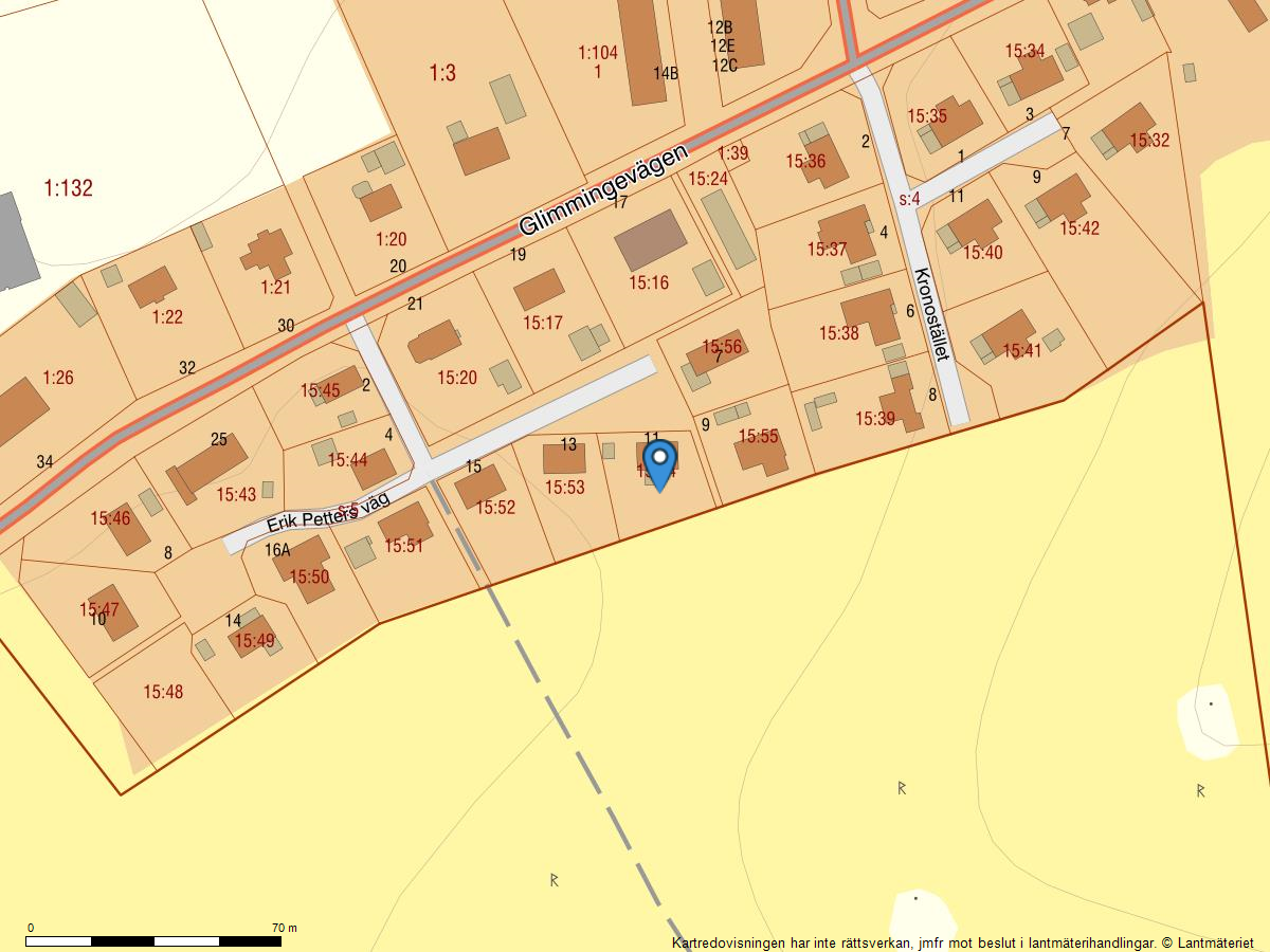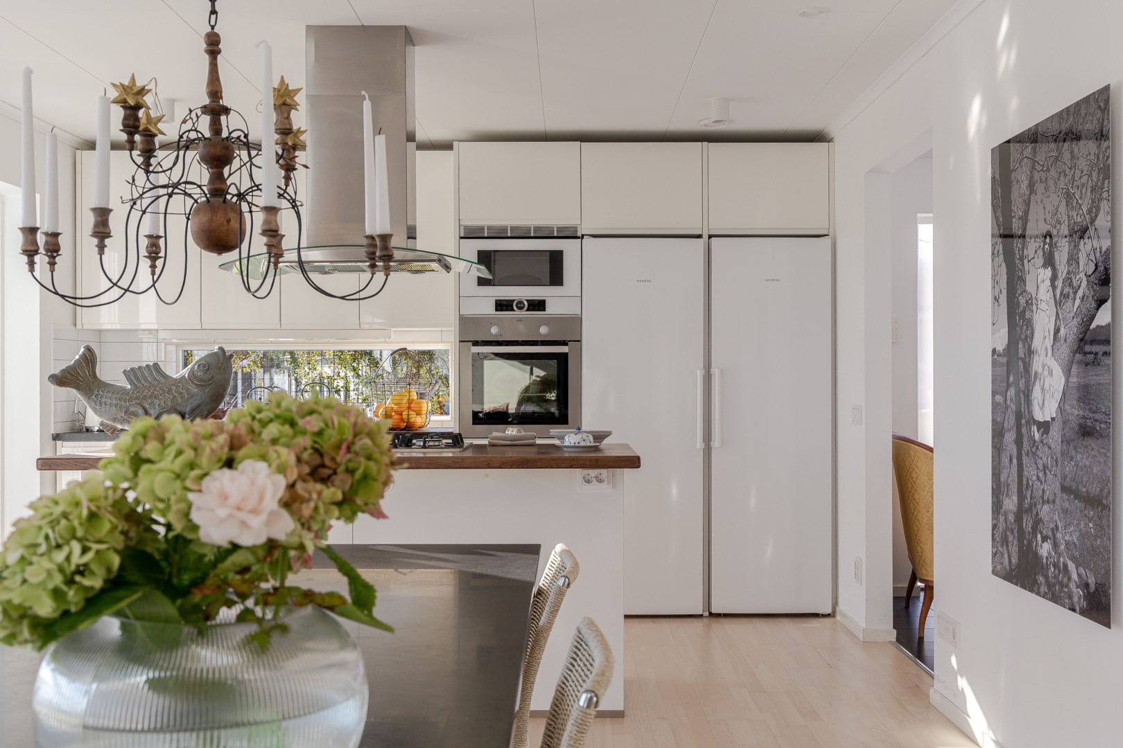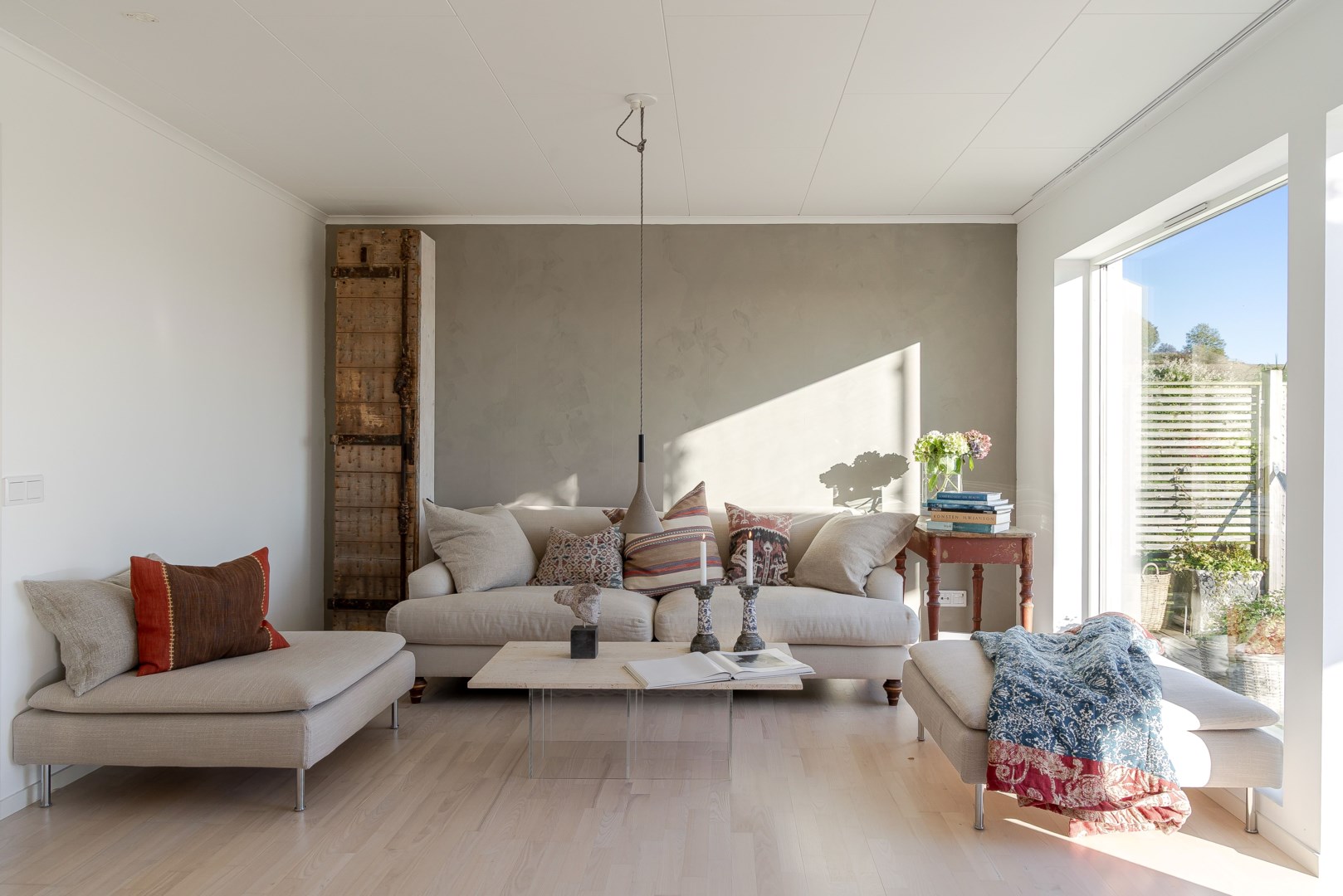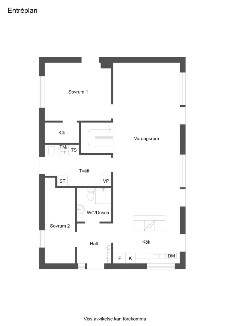 När man kliver in i bostaden möts man av en inbjudande hall med gott om plats för avhängning. Till vänster om hallen ligger ett mindre sovrum och intill detta ett helkaklat badrum med WC, dusch och tvättställ. Till höger om hallen finns köket som går i modern stil och ligger i öppen planlösning mot vardagsrummet. Stora glaspartier med flera utgångar leder ut till trädäcket och trädgården i söder. Intill vardagsrummet ligger tvättrummet och på andra sidan trappan ligger ett sovrum med plats för dubbelsäng, klädkammare och egen utgång till trädgården.