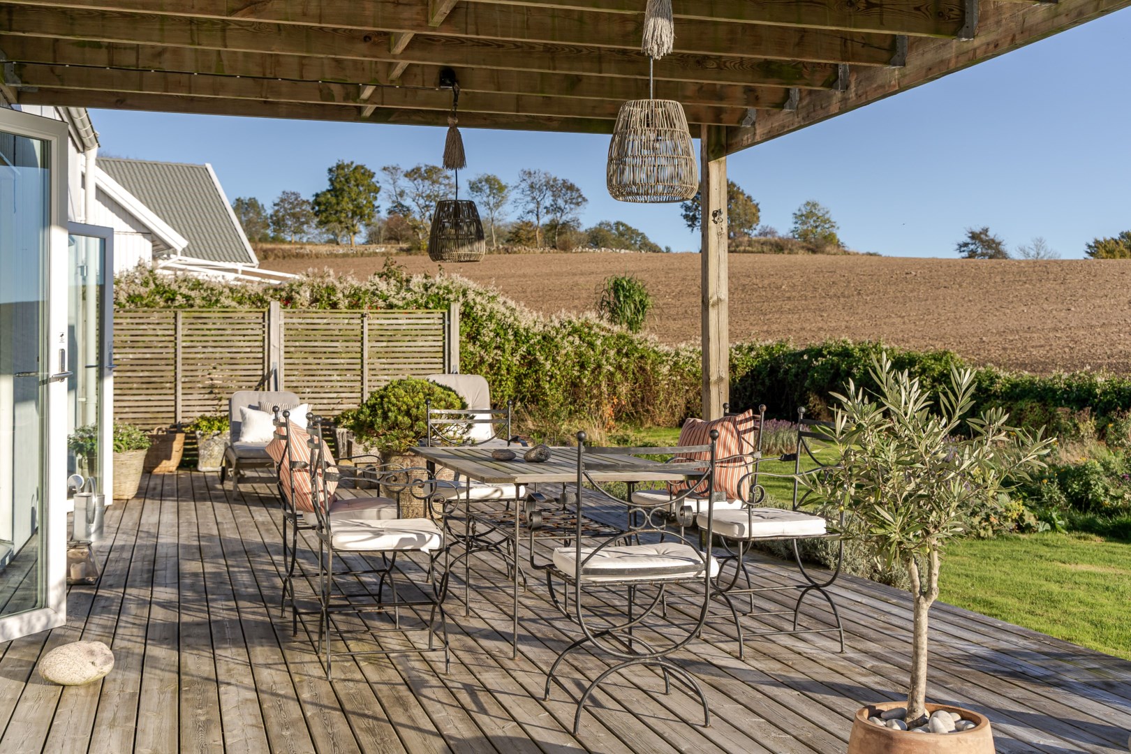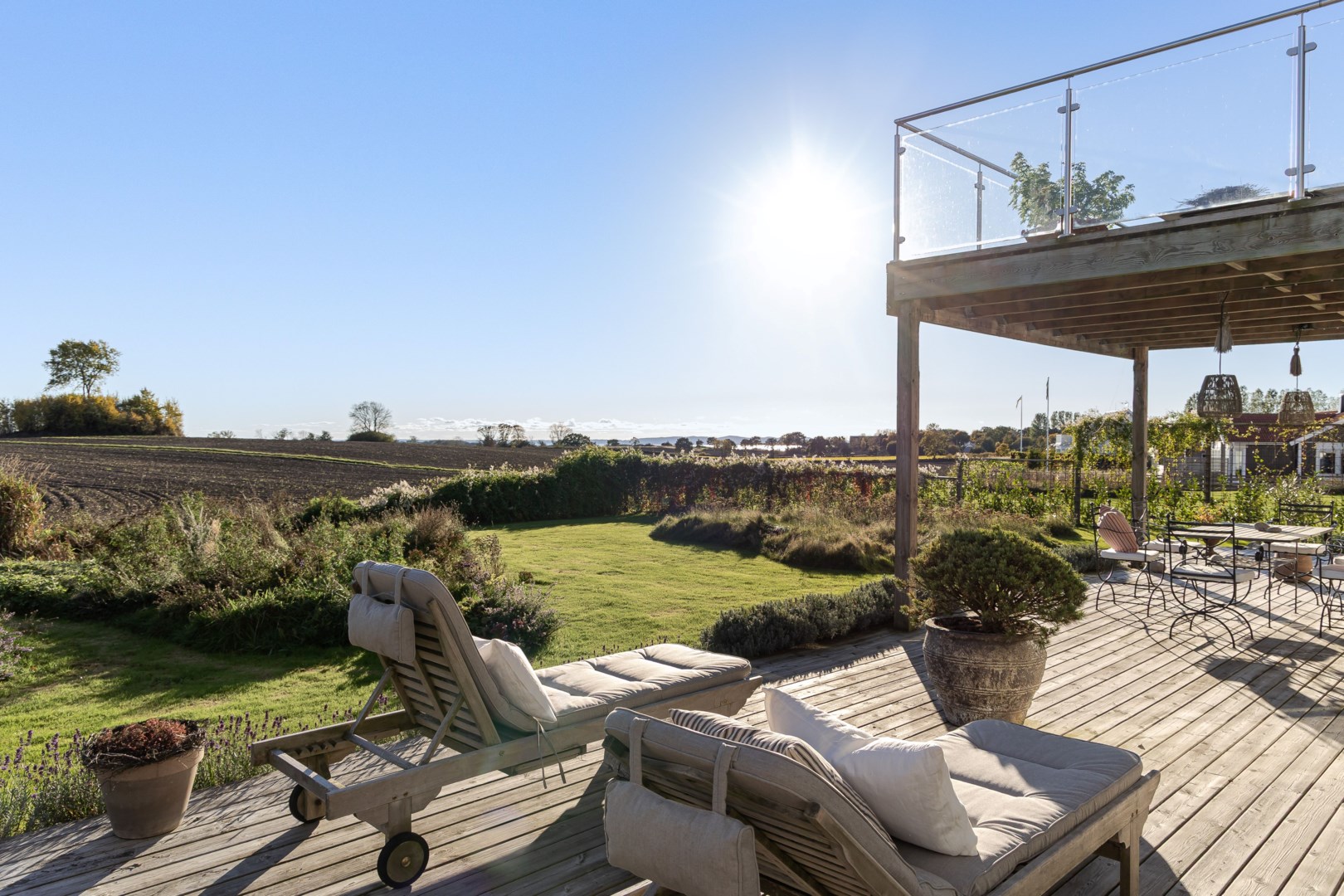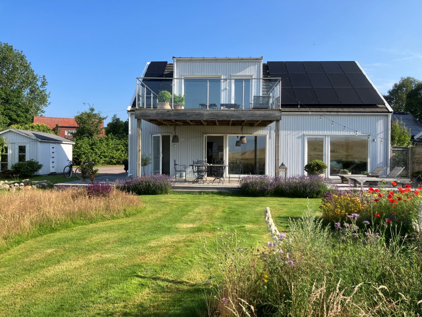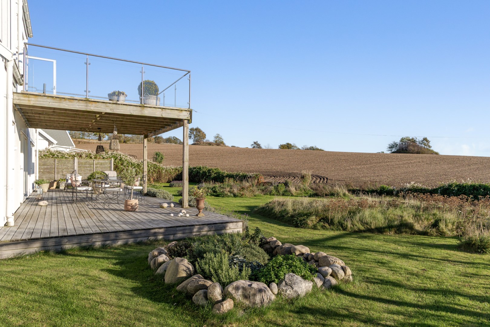Underbar trädgård i soligt söderläge med utsikt över åkermark, havet och Kullaberg i fjärran. Trädgården har inslag av naturkaraktär och är planterad med stora partier lavendel, kryddväxter och vilda blommor. Häckar med kaprifol, vildvin och silverregn omgärdar fastigheten. Stort trädäck löper längs med huskroppen och rymmer flera sittgrupper.