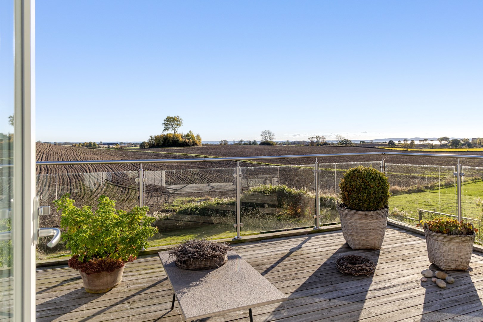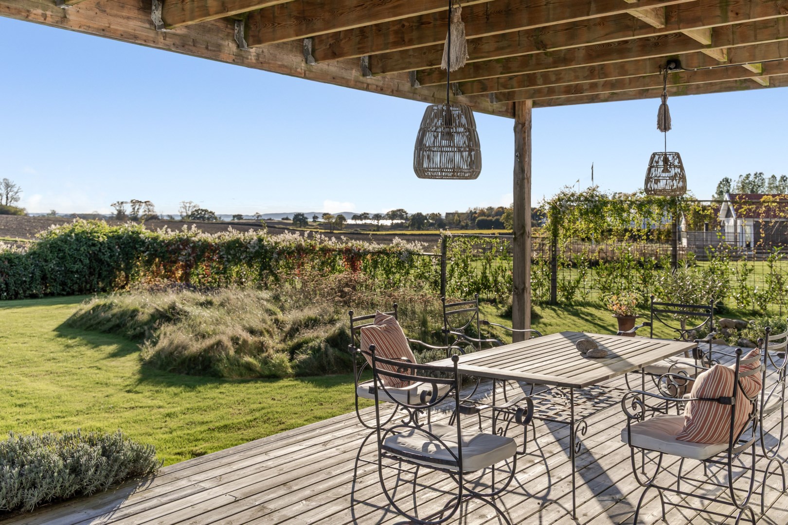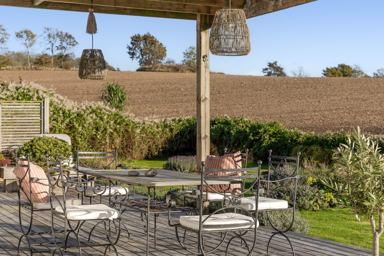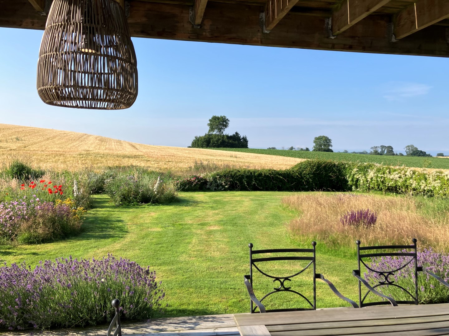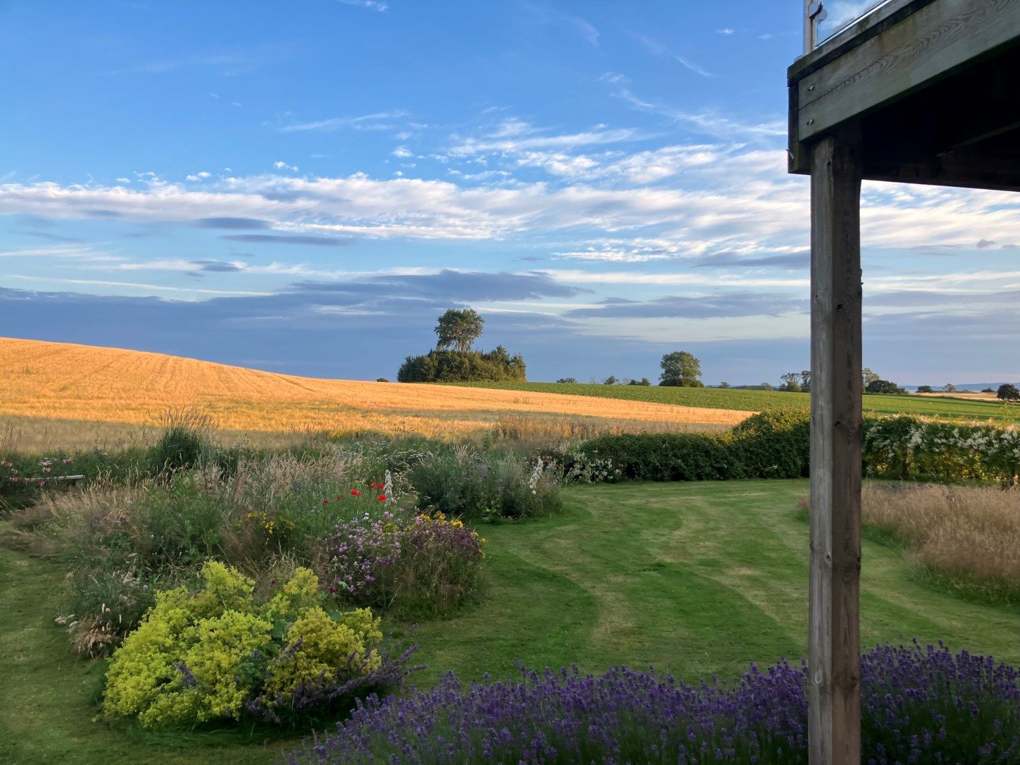 Underbar trädgård i soligt söderläge med utsikt över åkermark, havet och Kullaberg i fjärran. Trädgården har inslag av naturkaraktär och är planterad med stora partier lavendel, kryddväxter och vilda blommor. Häckar med kaprifol, vildvin och silverregn omgärdar fastigheten. Stort trädäck löper längs med huskroppen och rymmer flera sittgrupper.