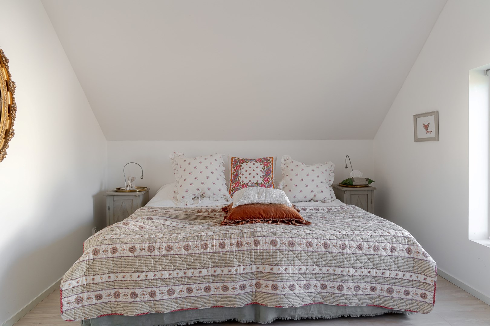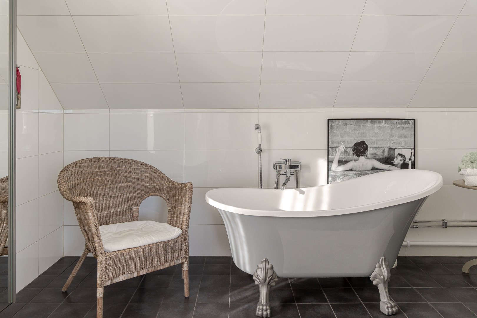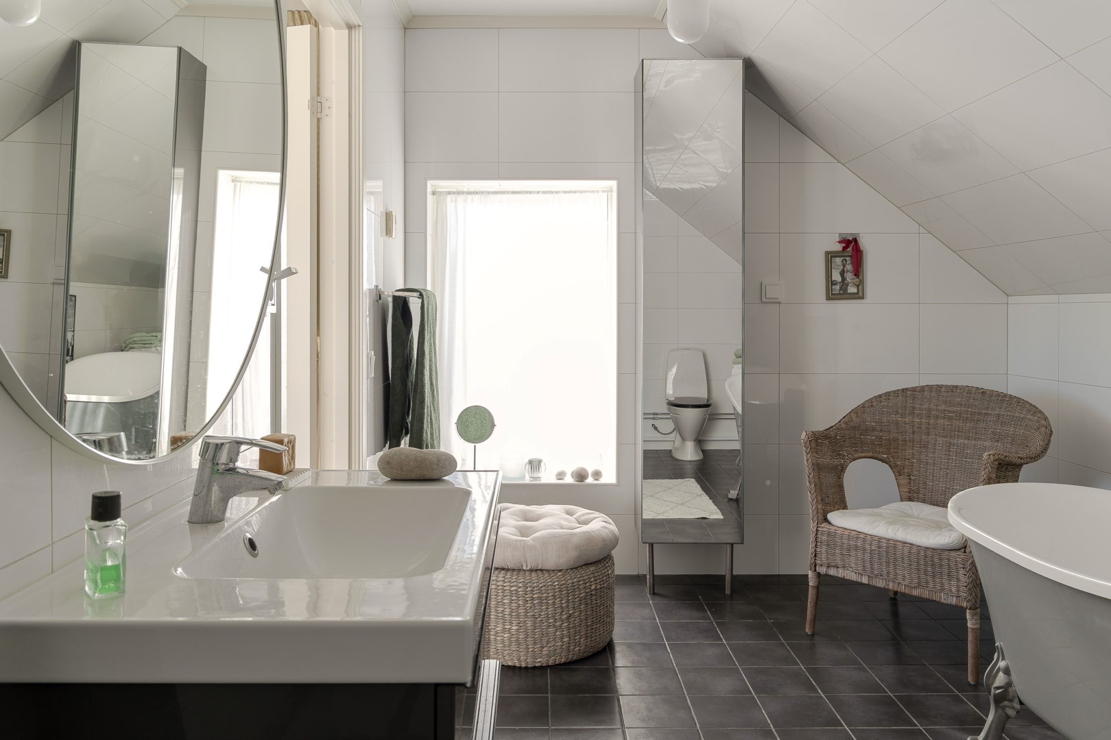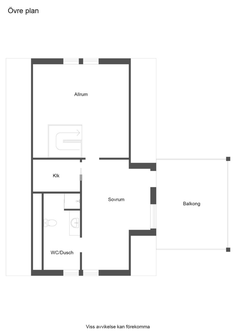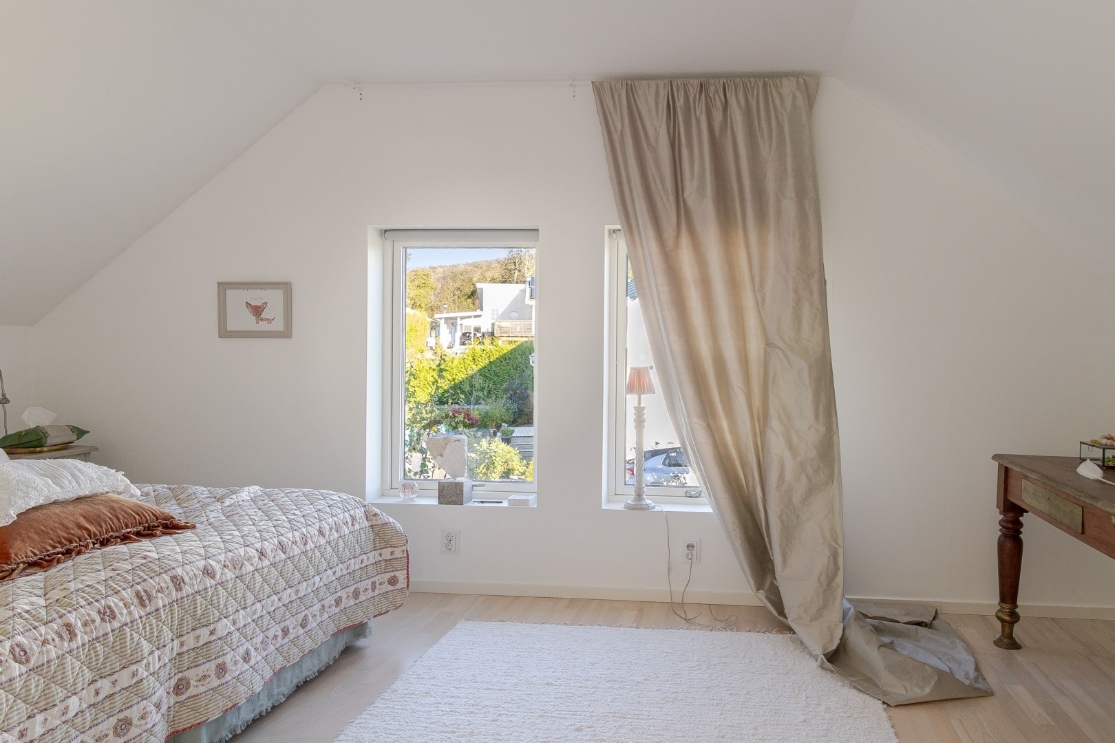 På övre plan finns två rymliga sovrum varav ett används som allrum idag. I anslutning till allrummet finns en stor altan med vidsträckt utsikt. På detta plan finns även ett större helkaklat badrum med WC, tvättställ och badkar samt en walk-in-closet.