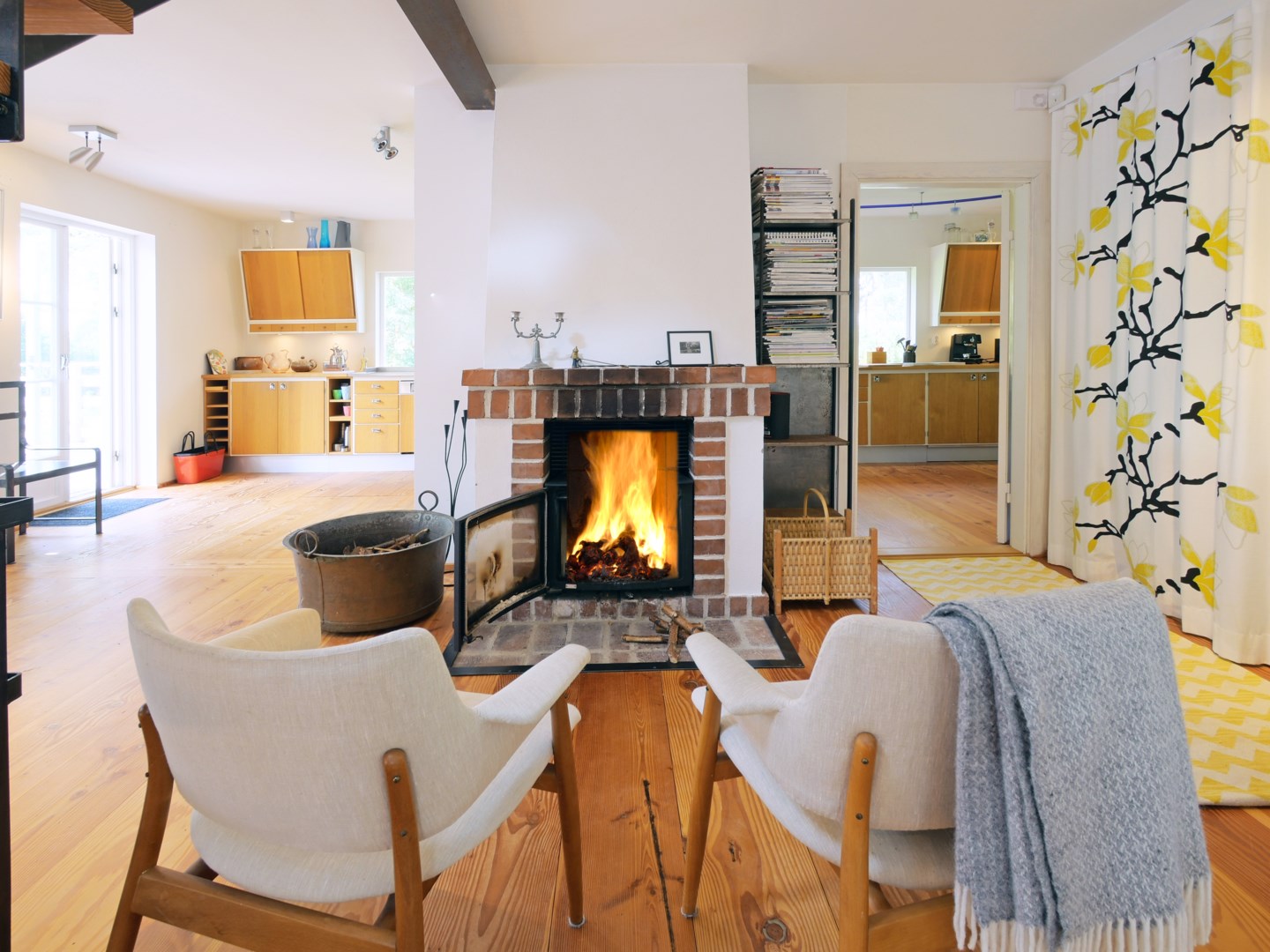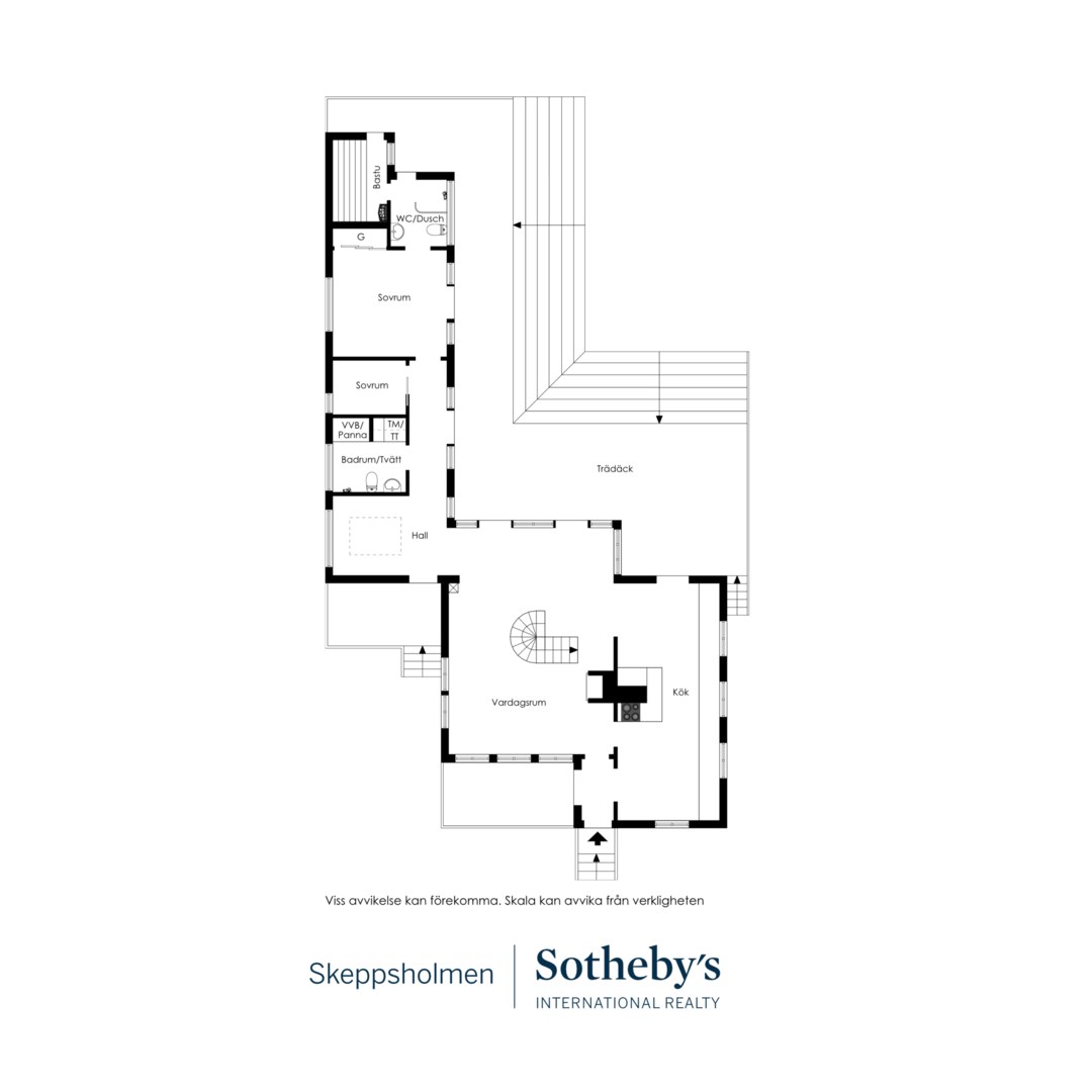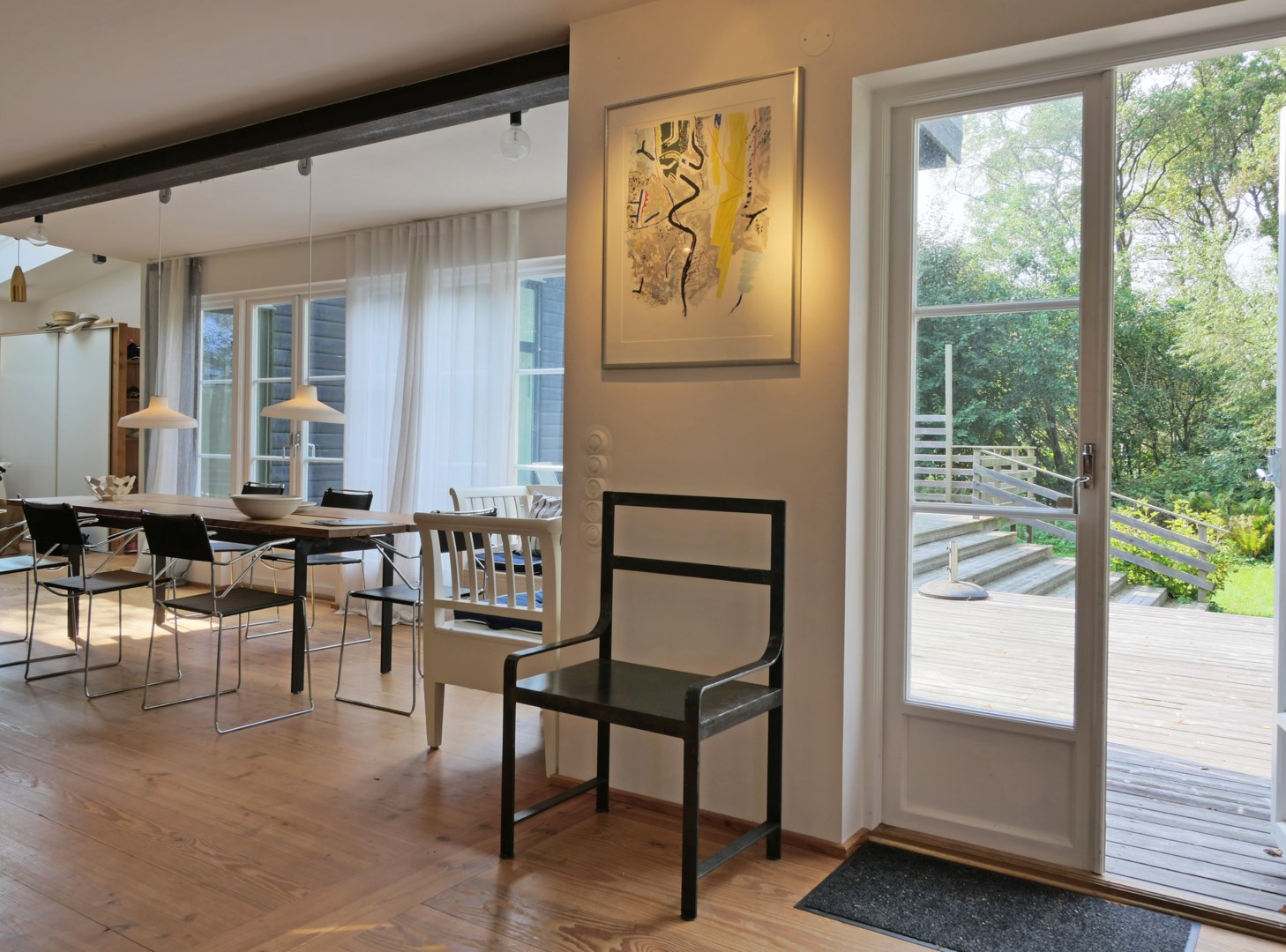 En trevlig hall välkomnar och öppnar upp mot sällskapsrum och kök i öppen planlösning i den ena vinkeln samt mot sovrumsavdelning i den andra. Sällskapsrummet är stort och luftigt med matplats i vacker verandadel med spröjsade fönsterpartier och sällskapsrum med öppen spis och plats för soffgrupp. Köket, i öppen planlösning, kommer från Kvänum och är välutrustat med restaurangspis från Falcon och övriga vitvaror från Miele. Väl tilltagna fönsterpartier och utgångar till den upphöjda och väl tilltagna terrassen ger en flytande känsla av inne och ute.