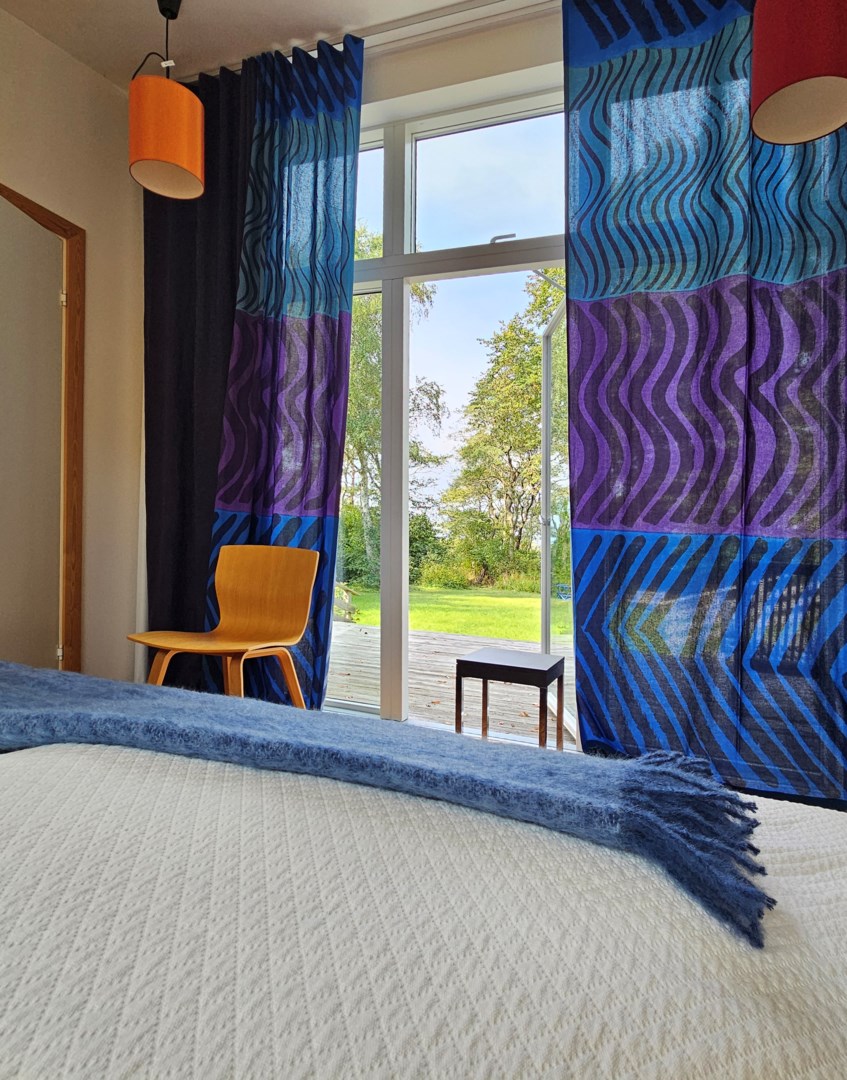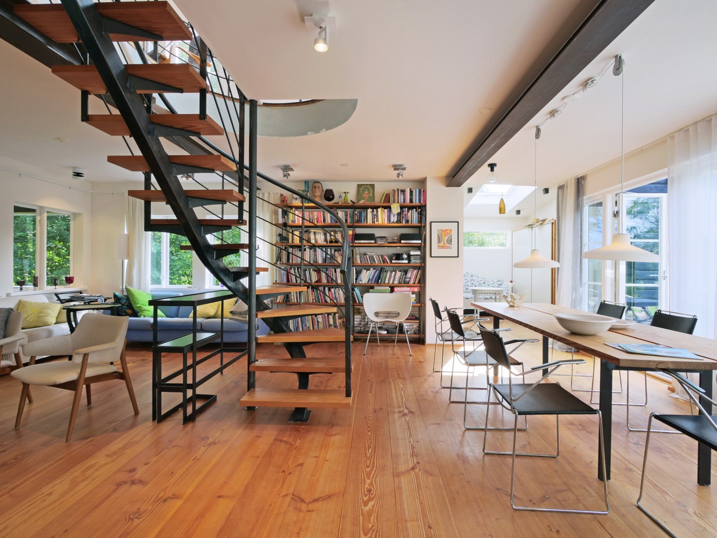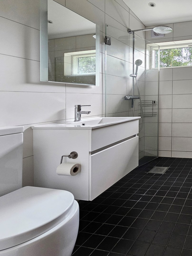 En trevlig hall välkomnar och öppnar upp mot sällskapsrum och kök i öppen planlösning i den ena vinkeln samt mot sovrumsavdelning i den andra. Sällskapsrummet är stort och luftigt med matplats i vacker verandadel med spröjsade fönsterpartier och sällskapsrum med öppen spis och plats för soffgrupp. Köket, i öppen planlösning, kommer från Kvänum och är välutrustat med restaurangspis från Falcon och övriga vitvaror från Miele. Väl tilltagna fönsterpartier och utgångar till den upphöjda och väl tilltagna terrassen ger en flytande känsla av inne och ute.