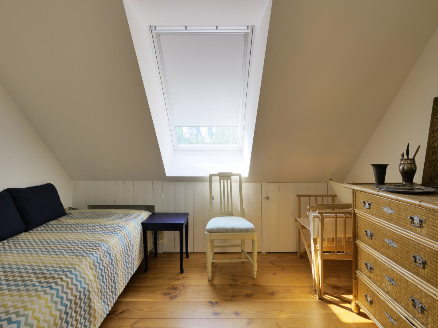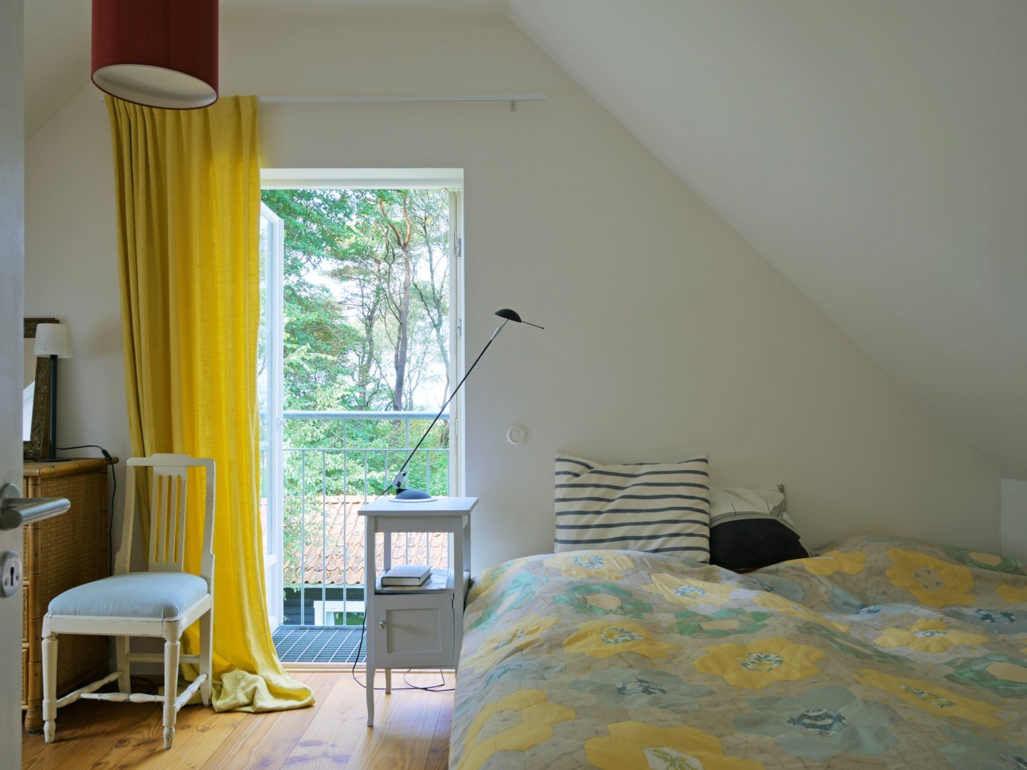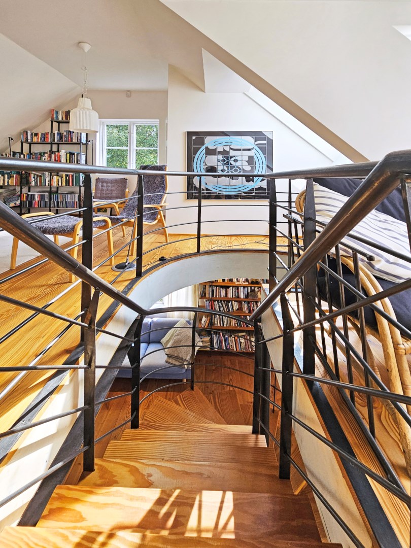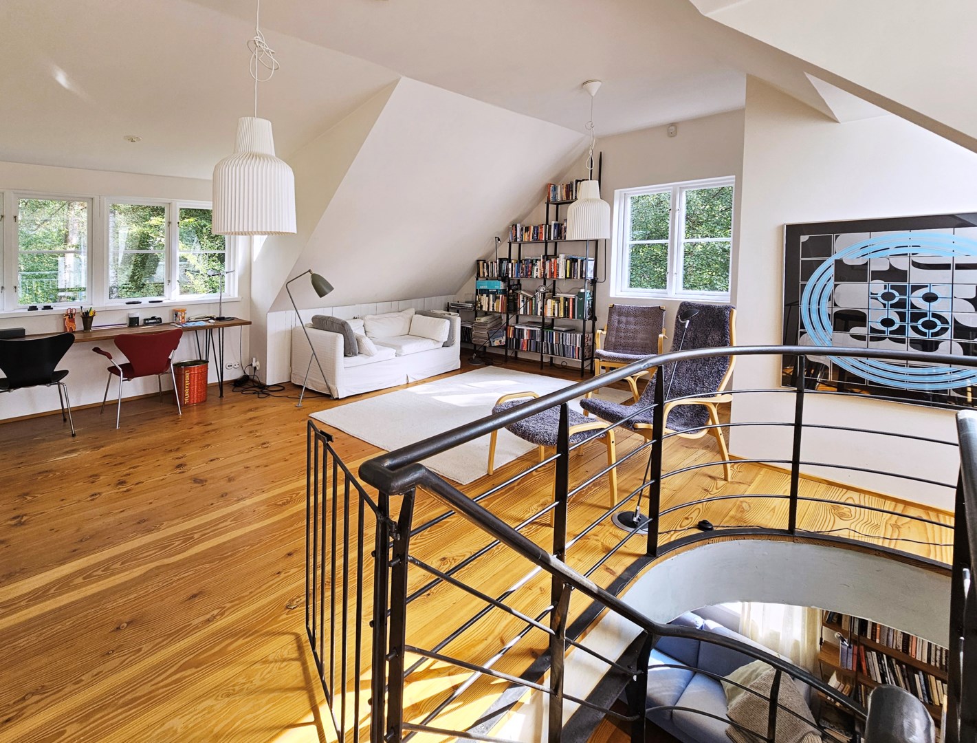 Centralt i sällskapsrummet ses en vacker smidestrappa som leder till det övre planet. Här finns ett rymlig sällskapsrum som flödar av ljus från fönster i tre väderstreck, här finns plats för både soffor och arbetsplatser. Stora fönsterpartier med utgång till väl tilltagen balkong med utsikt mot havet. På planet finns även ett större sovrum med plats för dubbelsäng och en fransk balkong mot havet, charmiga platsbyggda skåp i kattvindarna och takfönster. På planet finns även en separat wc.