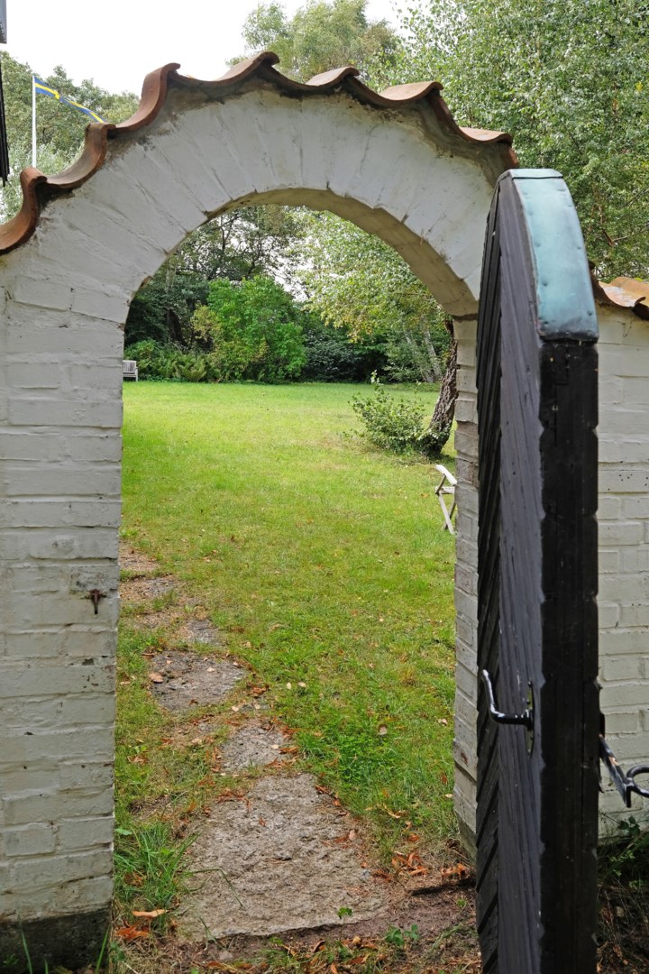 Den lätt kuperade tomten har plana gräsytor som inramas av lind, al och bok mot havet som skyddar mot vinden. Även rönn, pil, björk, hassel och syren bidrar till känslan av en park. När grönskan är något glesare under vår och vinter har man strålande utsikt över havet och centrala Båstad från större delen av trädgården.