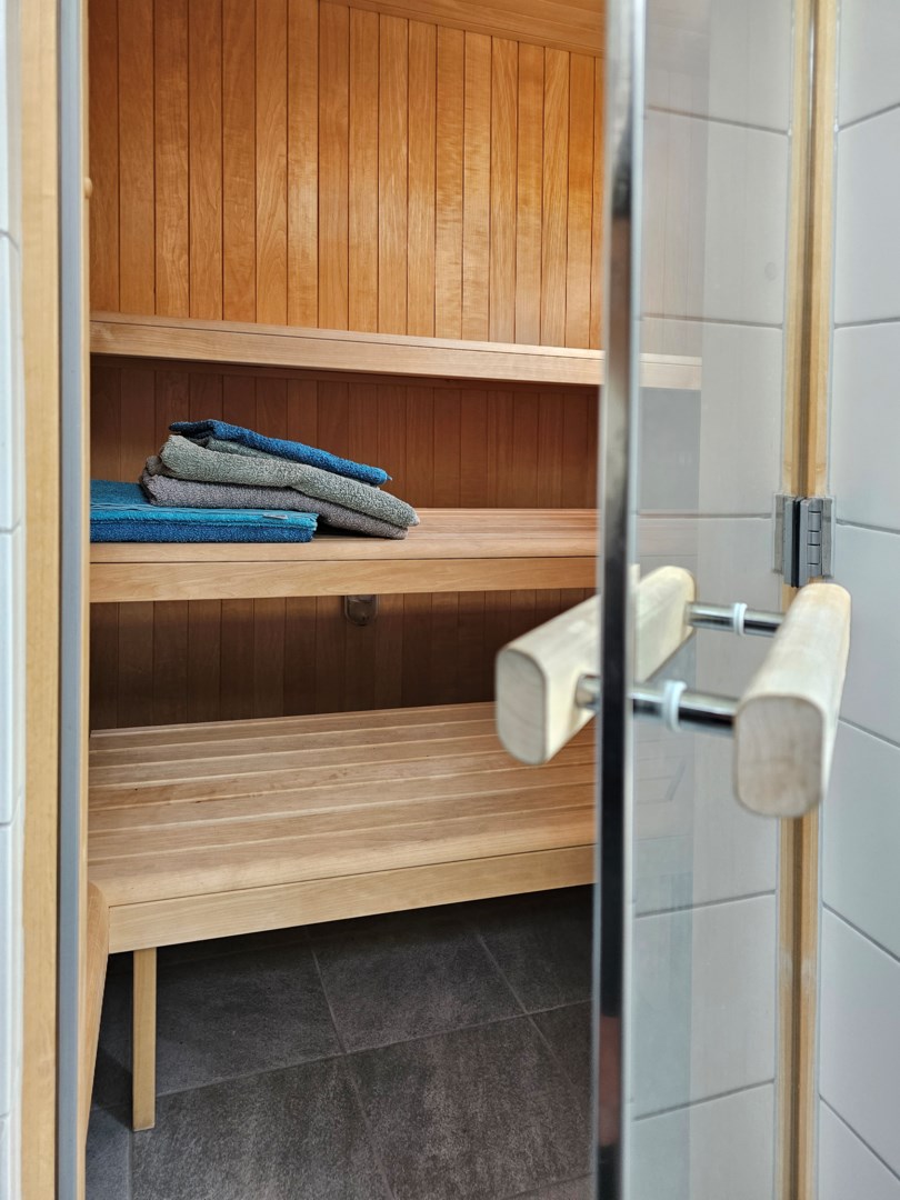Sovrumsavdelningen består av 2 – 3 sovrum samt 2 helkaklade badrum, båda med dusch. ”Master bedroom” har badrum med bastu ”en suite”. I det andra badrummet finns en tvättmaskin. Fler utgångar mot terrass och trädgård.