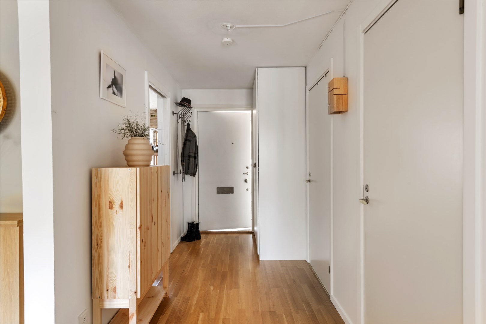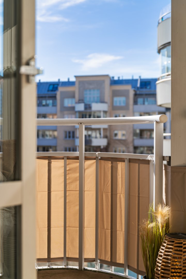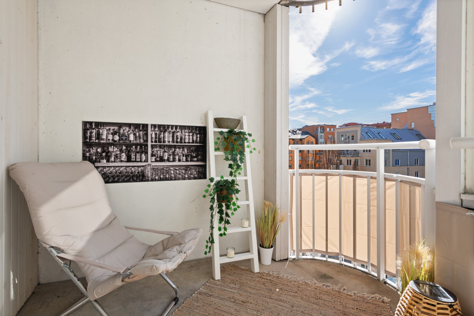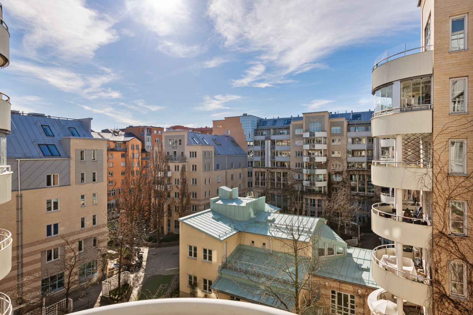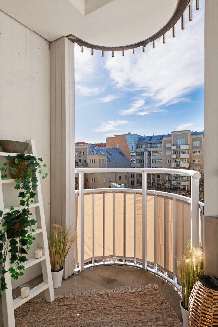 Ljus hall med garderober och anslutande stor klädkammare öppnar upp hela lägenheten. Rymligt och lättmöblerat vardagsrum med välvd hel fönstervägg samt gott om plats för stor soffgrupp, bokhyllor, mediamöbel och annat önskvärt möblemang. Intill ett rofyllt sovrum med hel garderobsvägg. Mot den vackra gården stort och härligt kök med plats för rejält matbord. Från köket utgång till ljuvlig balkong i fritt västerläge där den väl tilltagna ytan möjliggör möblering med soffa, bord, solstolar och växtlighet. Balkongen är delvis inglasad där fönsterparti kan skjutas åt sidan. Ifrån hallen ett stort badrum med dusch och tvättmaskin/torktumlare.