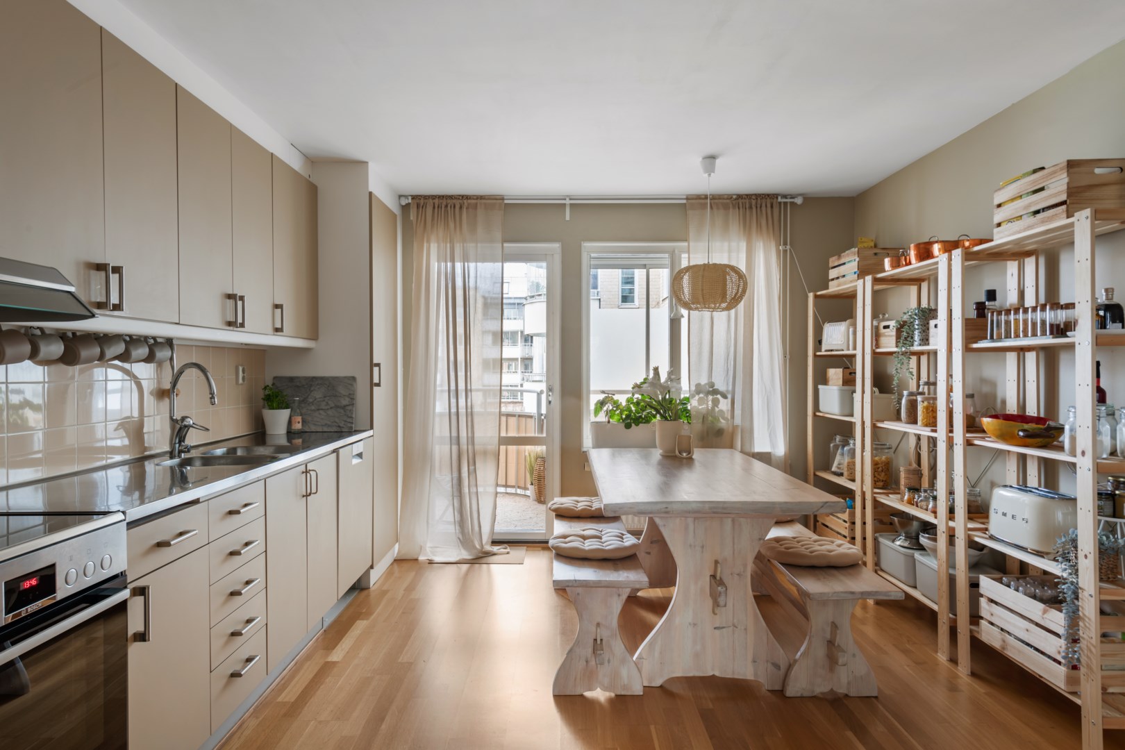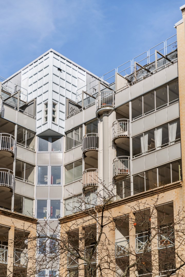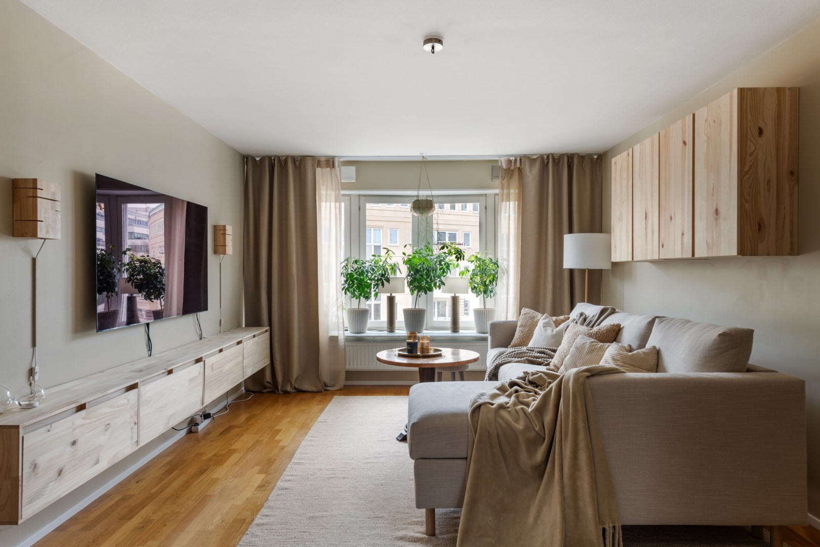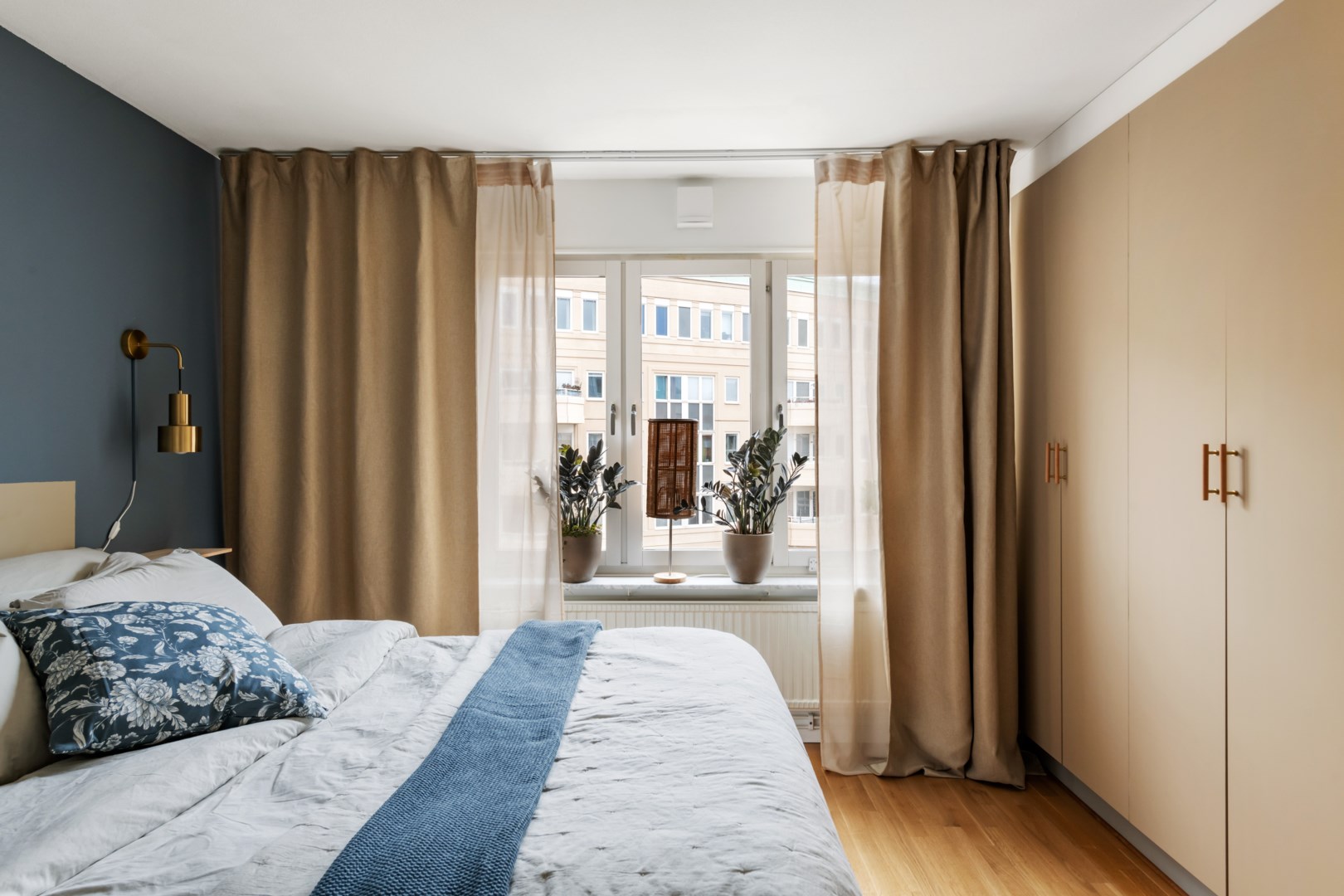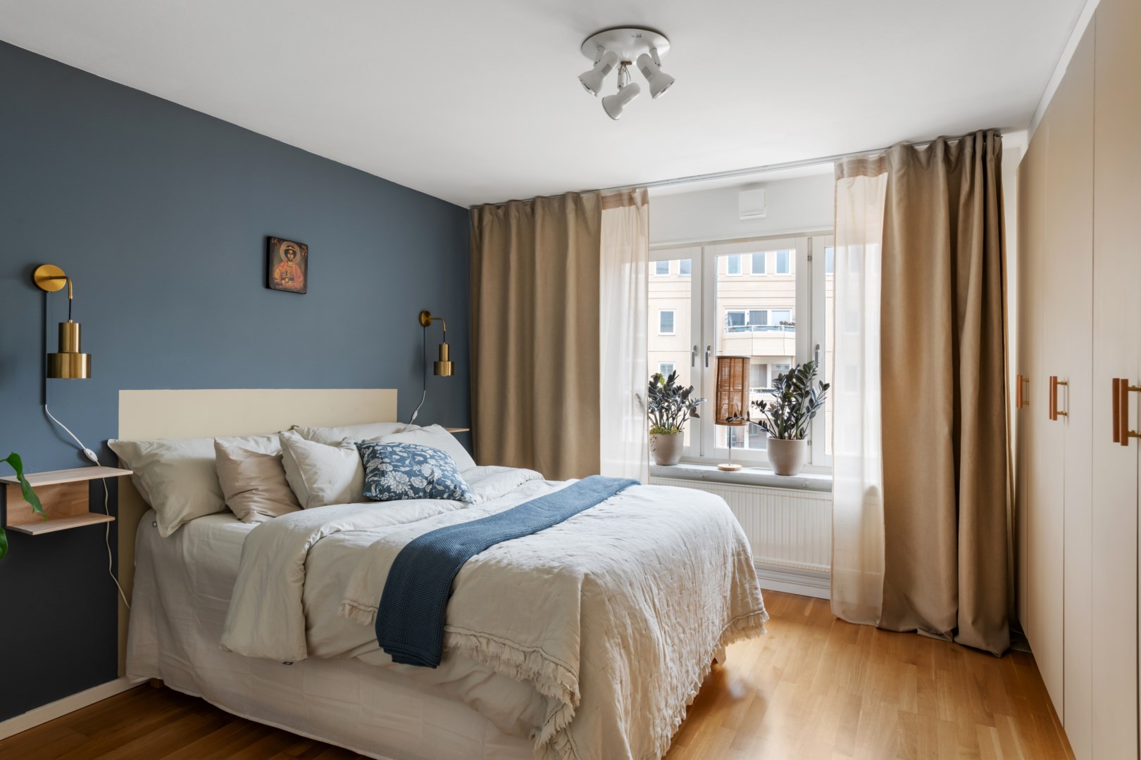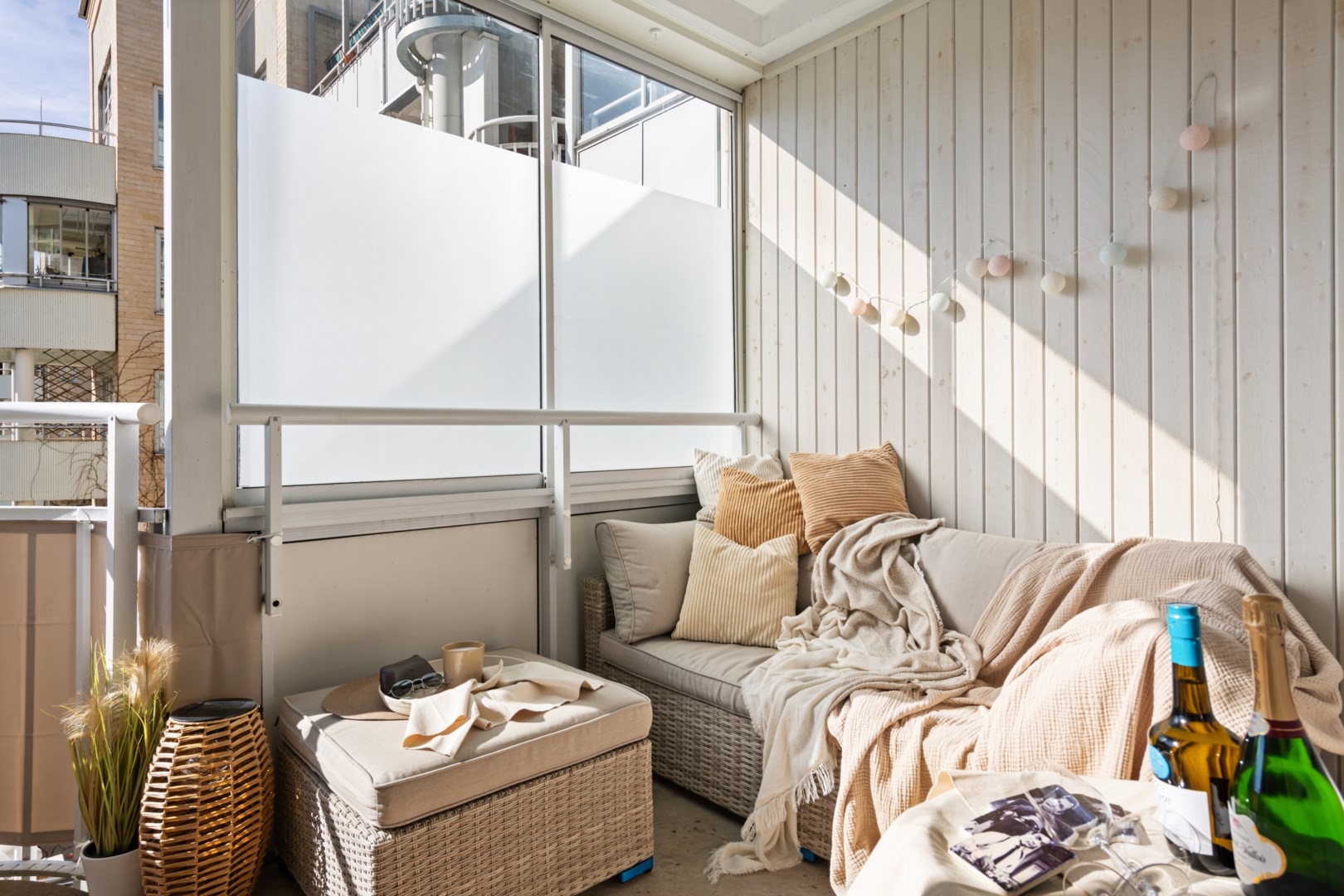 Ljus hall med garderober och anslutande stor klädkammare öppnar upp hela lägenheten. Rymligt och lättmöblerat vardagsrum med välvd hel fönstervägg samt gott om plats för stor soffgrupp, bokhyllor, mediamöbel och annat önskvärt möblemang. Intill ett rofyllt sovrum med hel garderobsvägg. Mot den vackra gården stort och härligt kök med plats för rejält matbord. Från köket utgång till ljuvlig balkong i fritt västerläge där den väl tilltagna ytan möjliggör möblering med soffa, bord, solstolar och växtlighet. Balkongen är delvis inglasad där fönsterparti kan skjutas åt sidan. Ifrån hallen ett stort badrum med dusch och tvättmaskin/torktumlare.