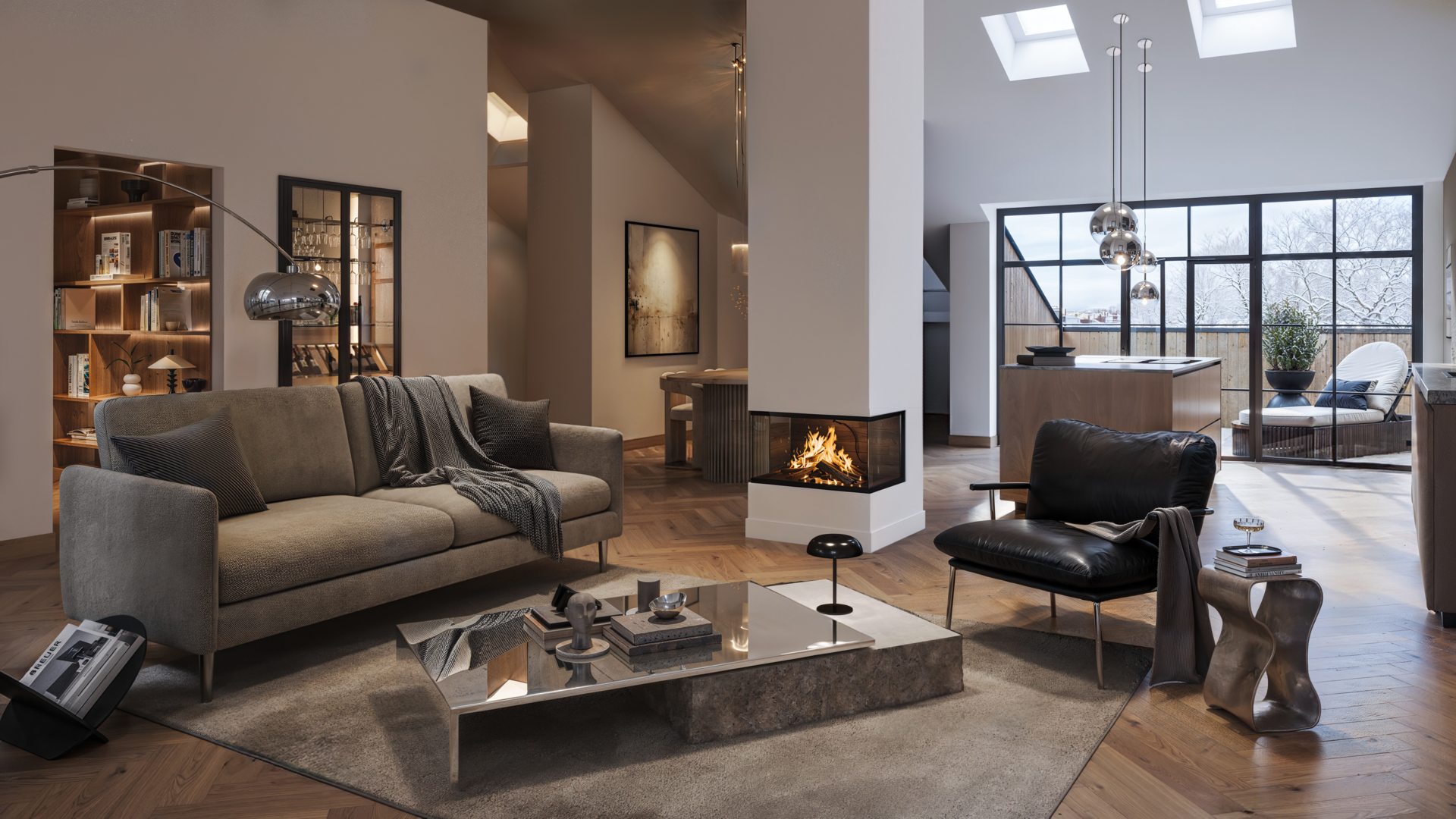 Centralt placerad öppen spis.