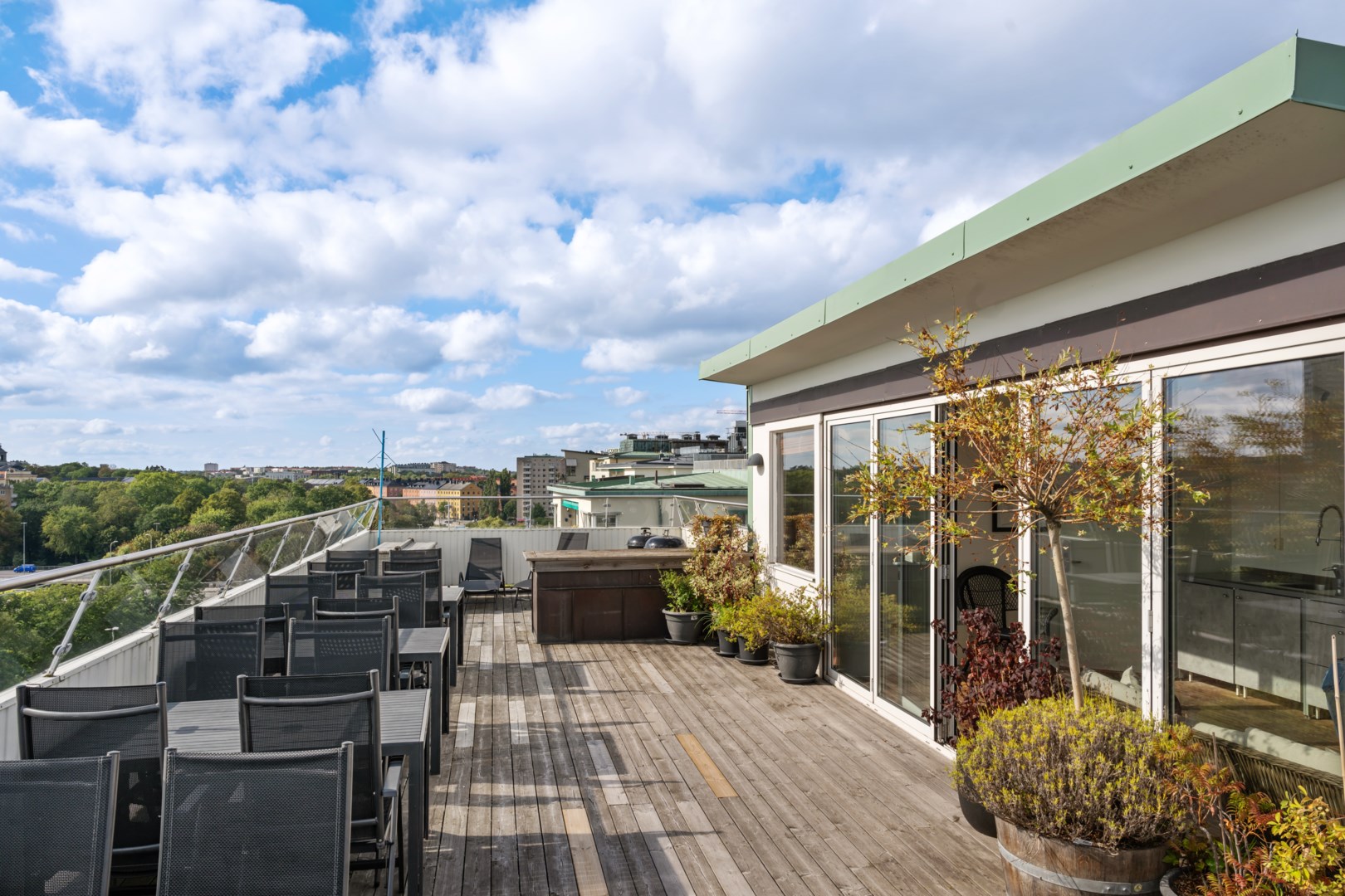 Högst upp i huset erbjuds de boende tillgång till en nyrenoverad och möblerad takterrass om ca 80 kvm med tillhörande vinterbonat uterum och pentry. I anslutning finns dessutom en bastu med omklädningsrum och dusch. Varje trapphus har även en egen, mindre takterrass om ca 25 kvm som kan bokas för privata tillställningar.