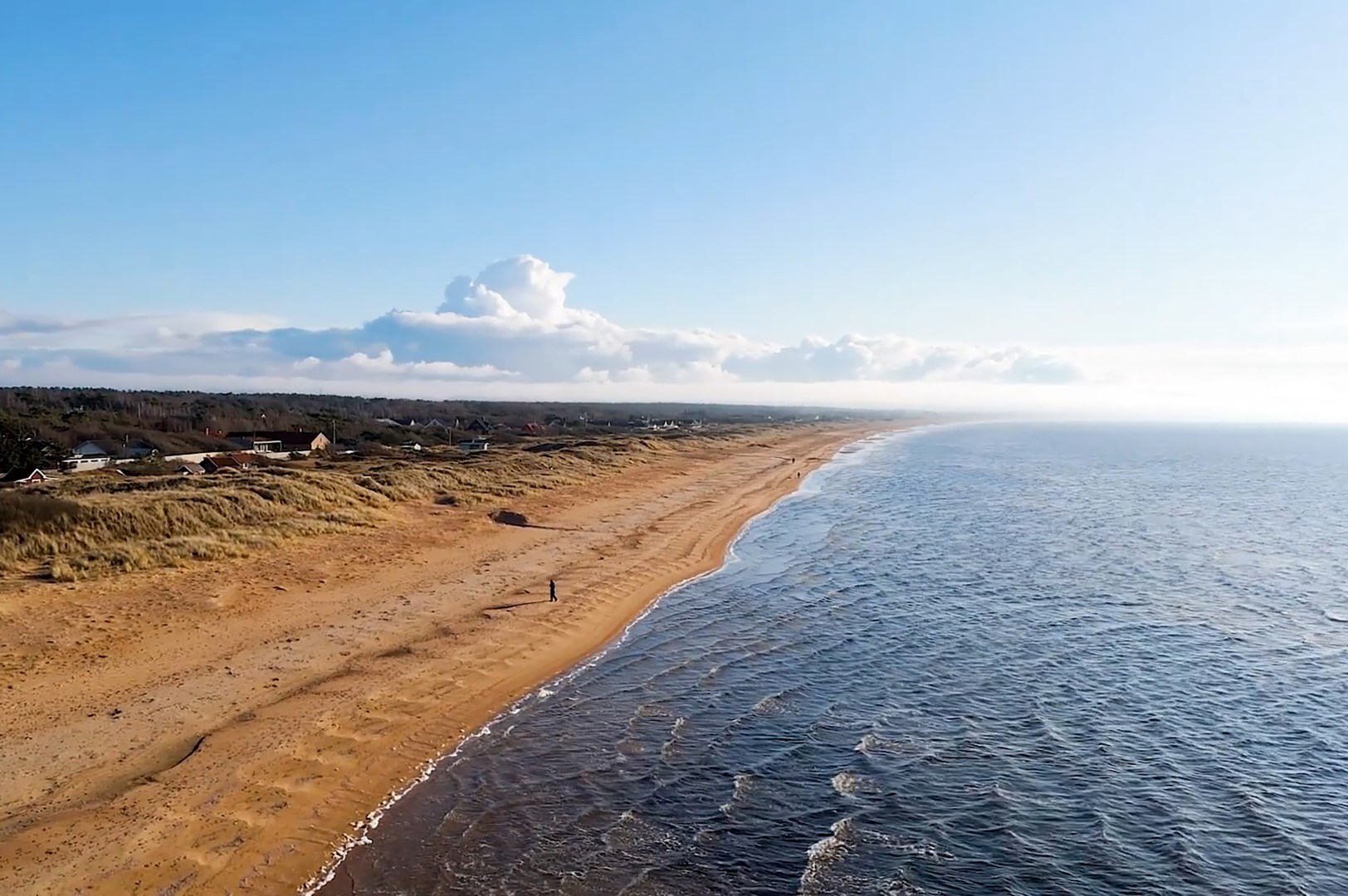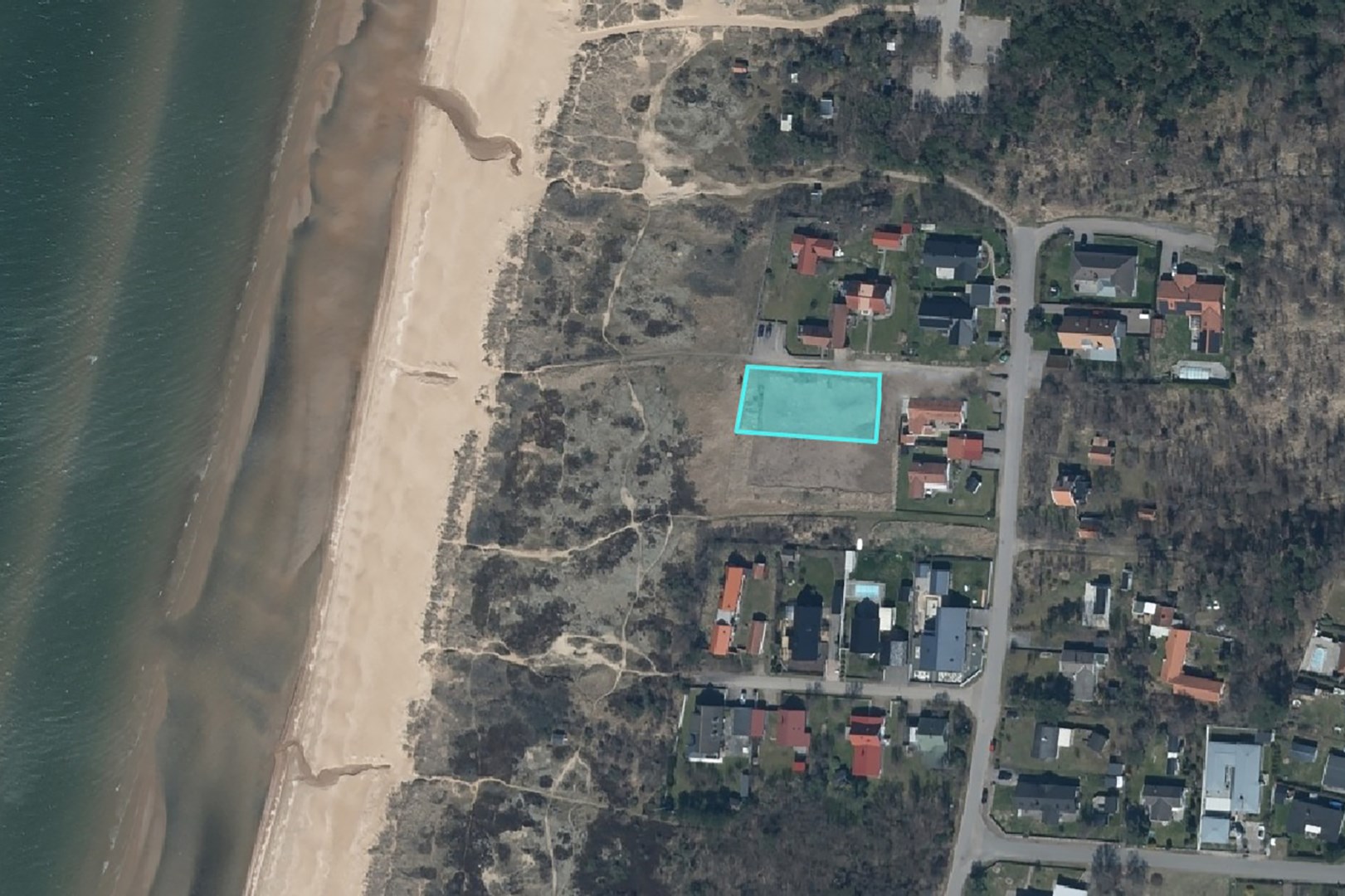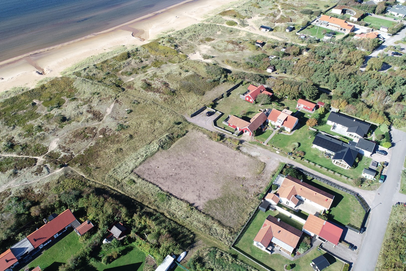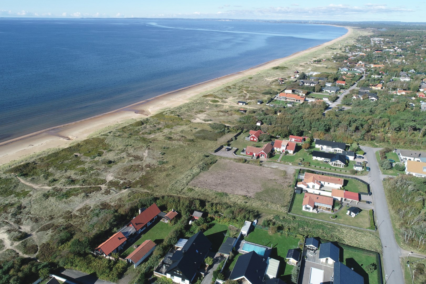 Tomten ligger endast meter från strandlinjen – med ett grönområde endas meter bort. Härifrån har du utsikt mot havet som delvis skymd av naturliga sanddyner som bidrar till områdets karaktär.