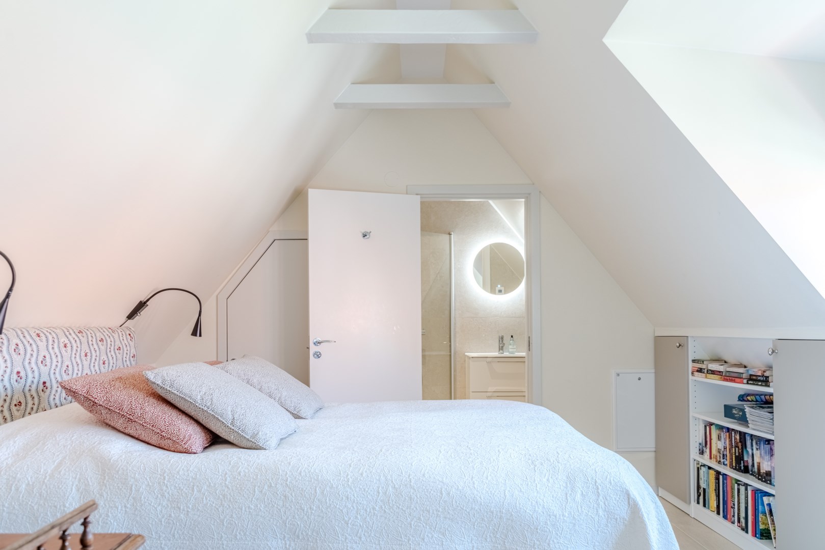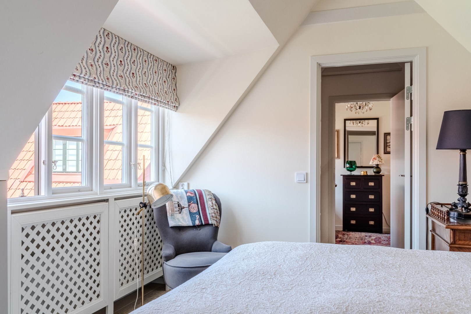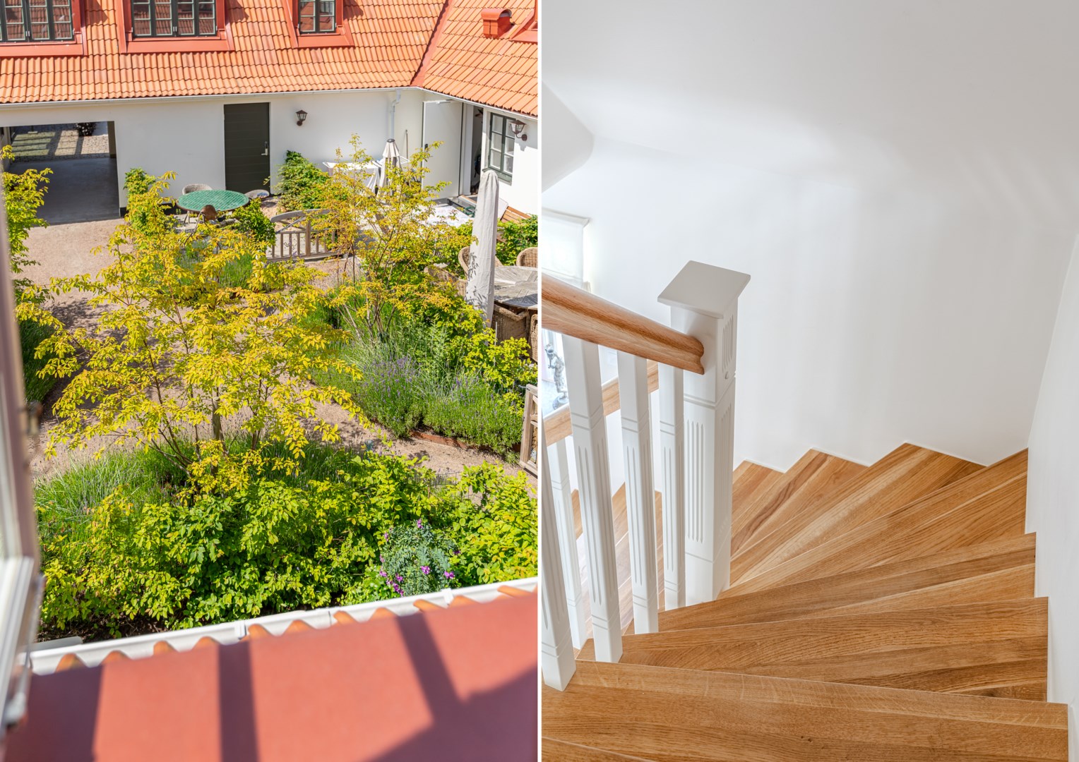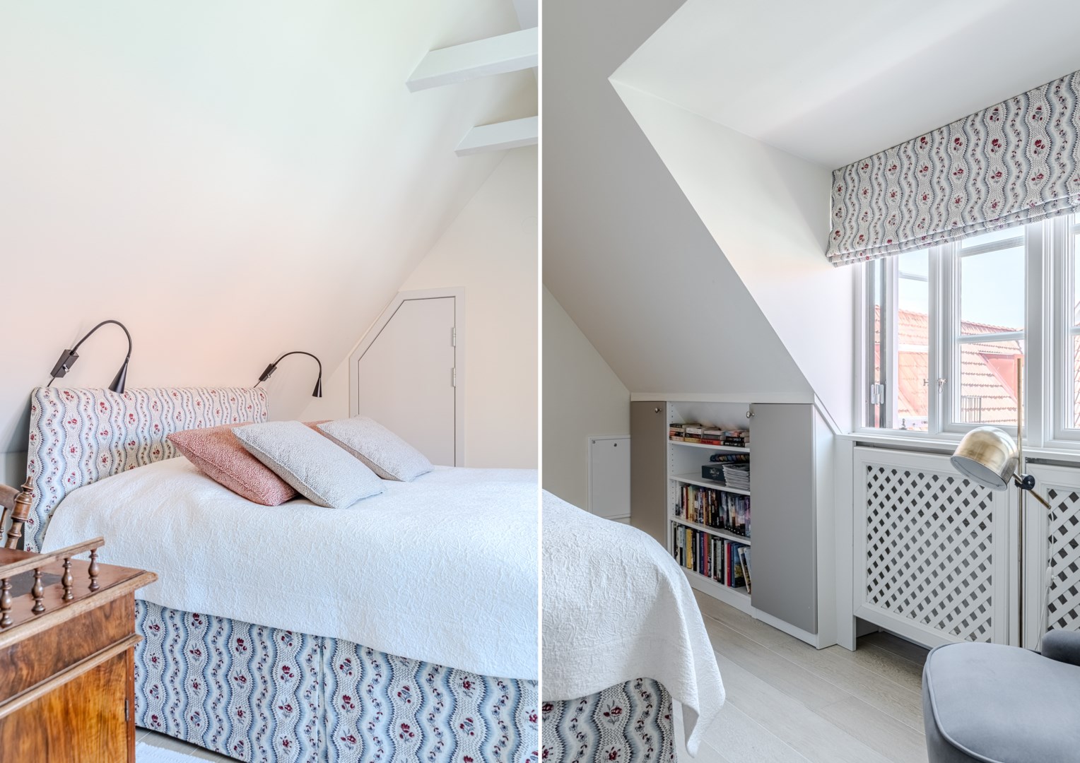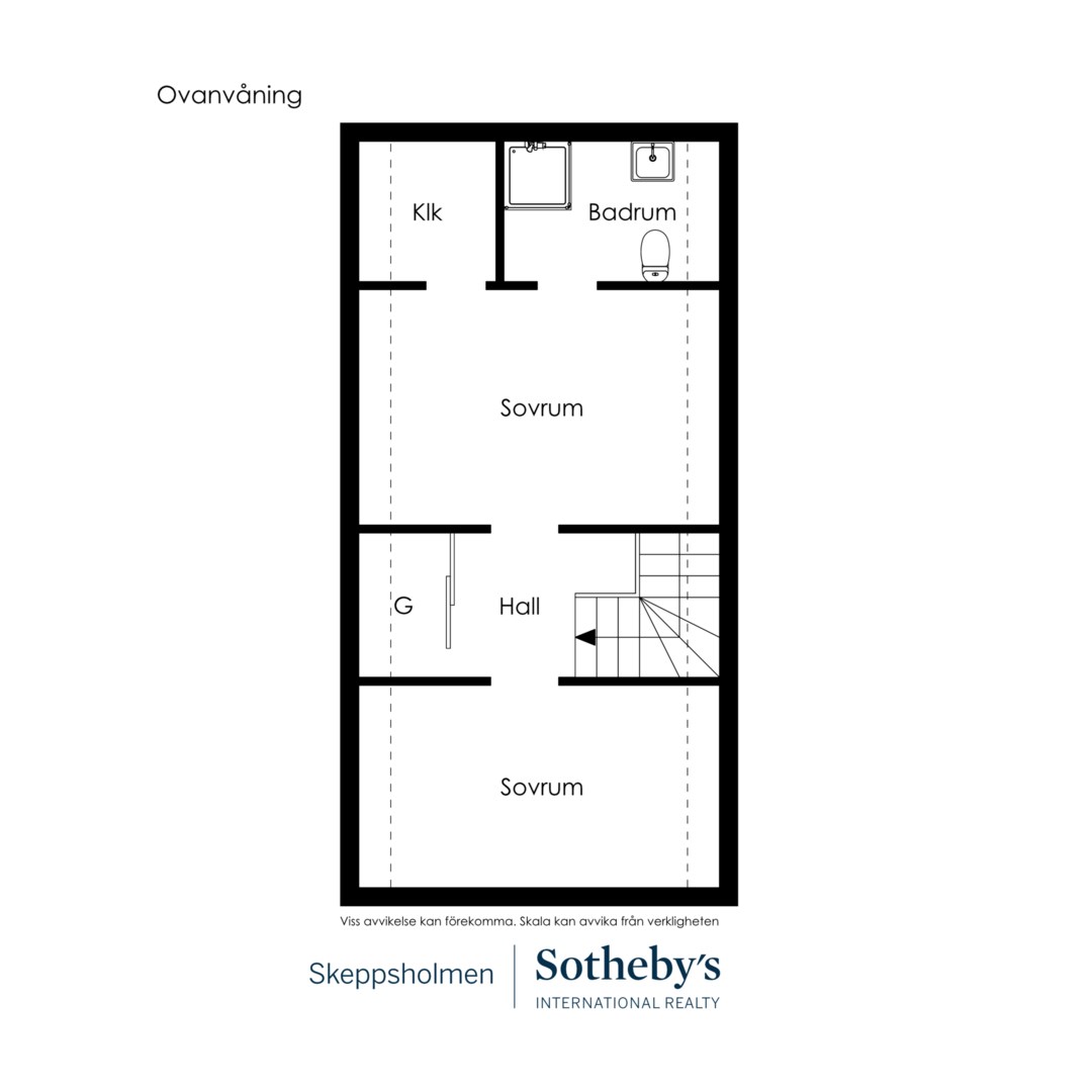 En trappa upp återfinns hall med garderob och master bedroom till höger. Härifrån ges en fin vy över gården och rummet rymmer såväl dubbelsäng som läshörna och skrivbord. I direkt anslutning ligger välplanerad wc/dusch och klädkammare. På motsatta sidan ligger ännu ett sovrum och även detta har fin gårdsvy.